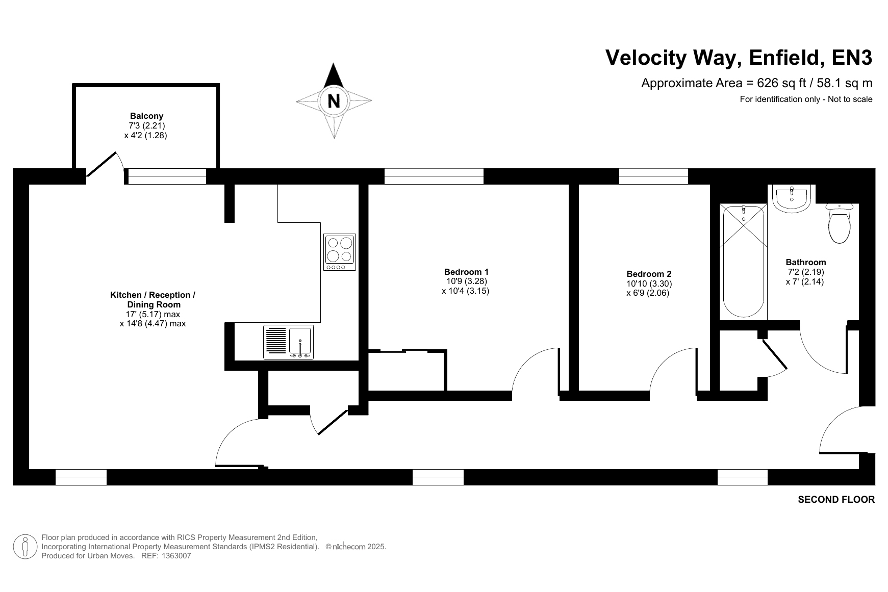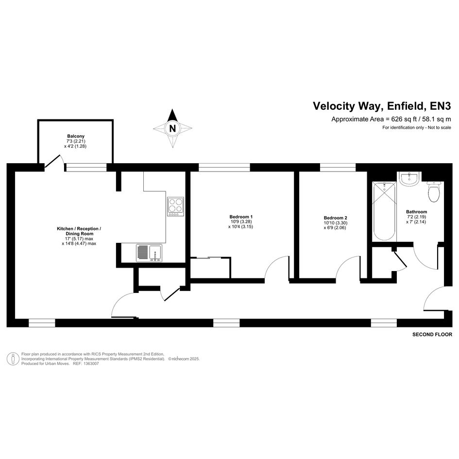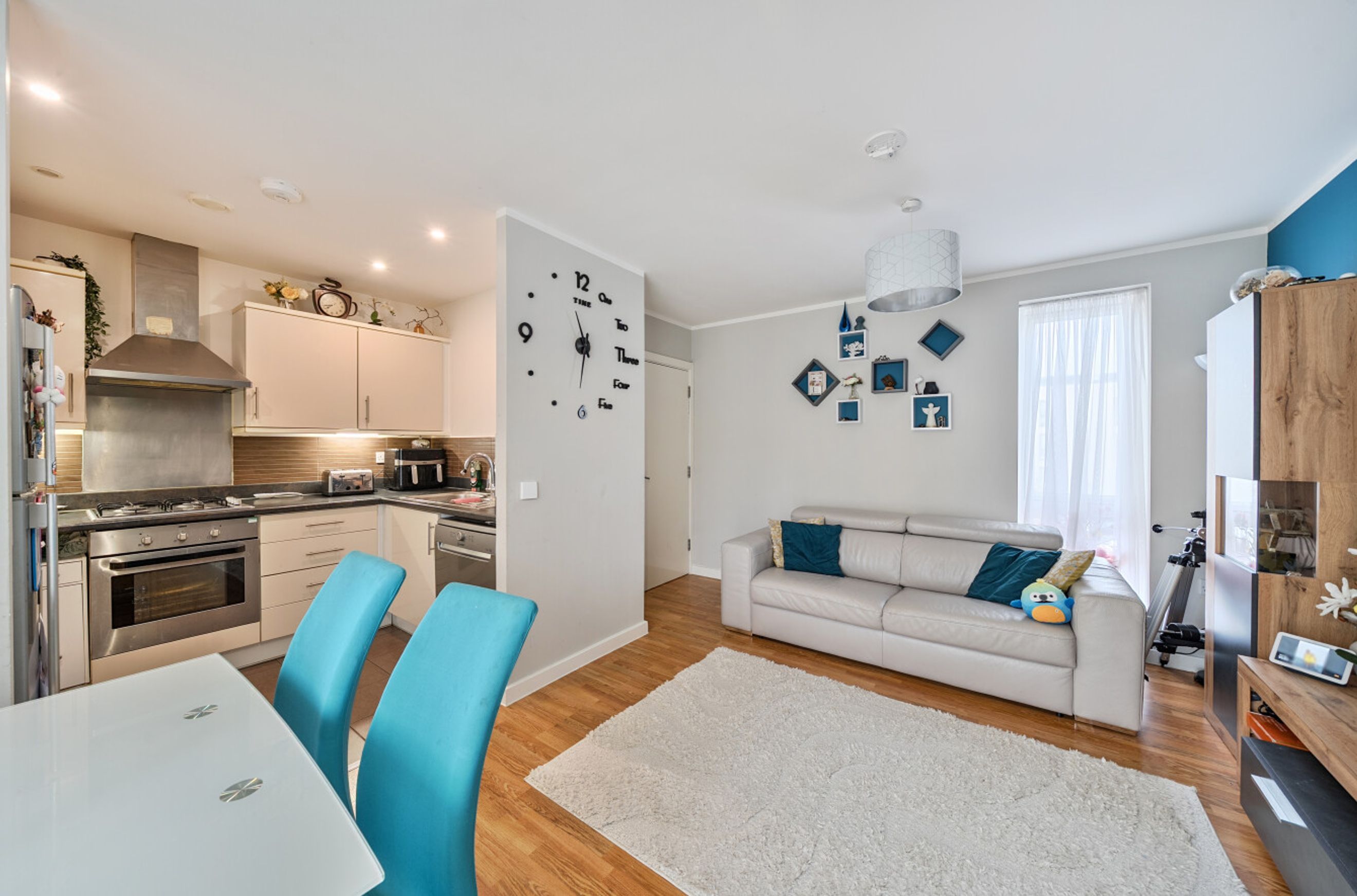 A smartly-presented apartment on the second floor of this modern development. The property has a naturally-lit entrance hallway leading to a dual-aspect reception room with balcony. The attractive, semi-open-plan kitchen features cream-coloured units with pencil-mosaic splashbacks. There is a spacious main bedroom with fitted wardrobe plus a second, smaller, double bedroom and a good-sized bathroom. Well insulated walls, double glazing and gas central heating make for a very good energy-efficiency rating. Fermi House and the adjoining buildings share a gated car park that includes a space allocated to this apartment. The development also has a large communal garden which is adjacent to Fermi House. Enfield Lock Station, for services into Liverpool Street, is only a short walk away. There is a secondary school very close by and Ofsted list three primaries within a half-mile radius - all four are rated 'Good'.