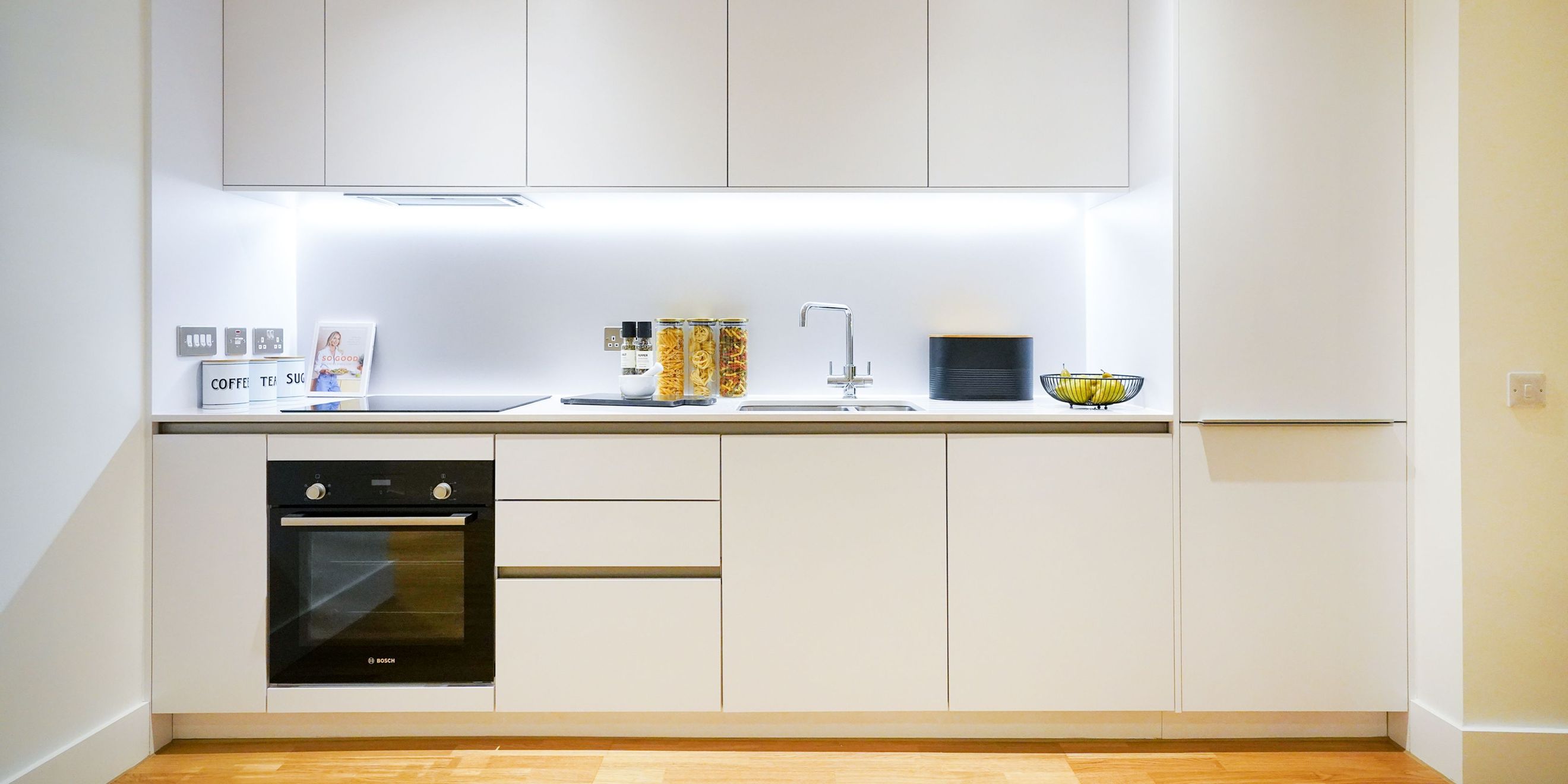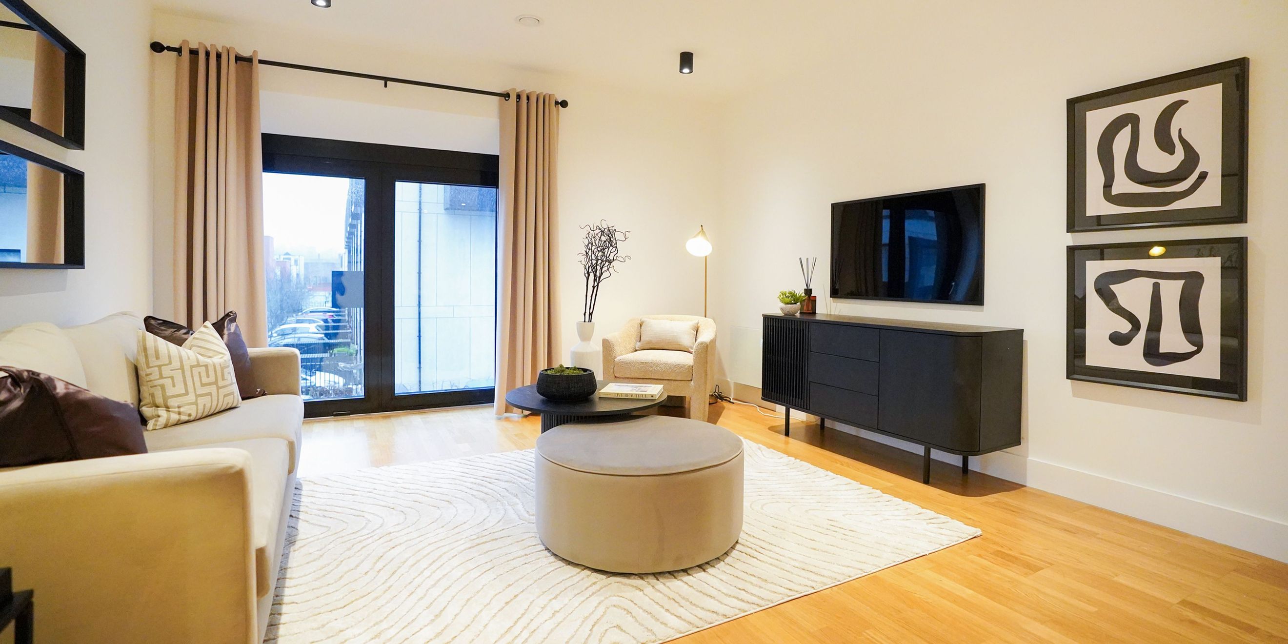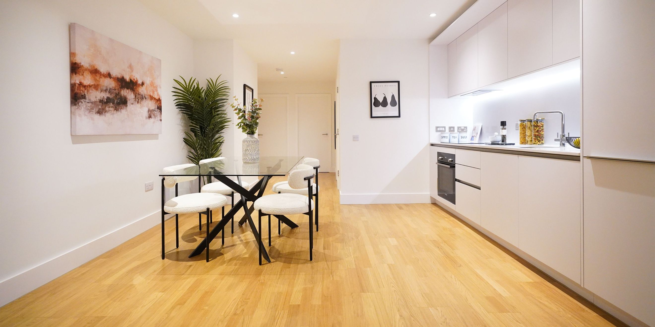 Offering a spacious living area with a large window, creating a light and airy space, a modern kitchen, with white gloss units, soft close drawers and cupboards, under pelmet lighting and integrated fridge freezer and dishwasher.