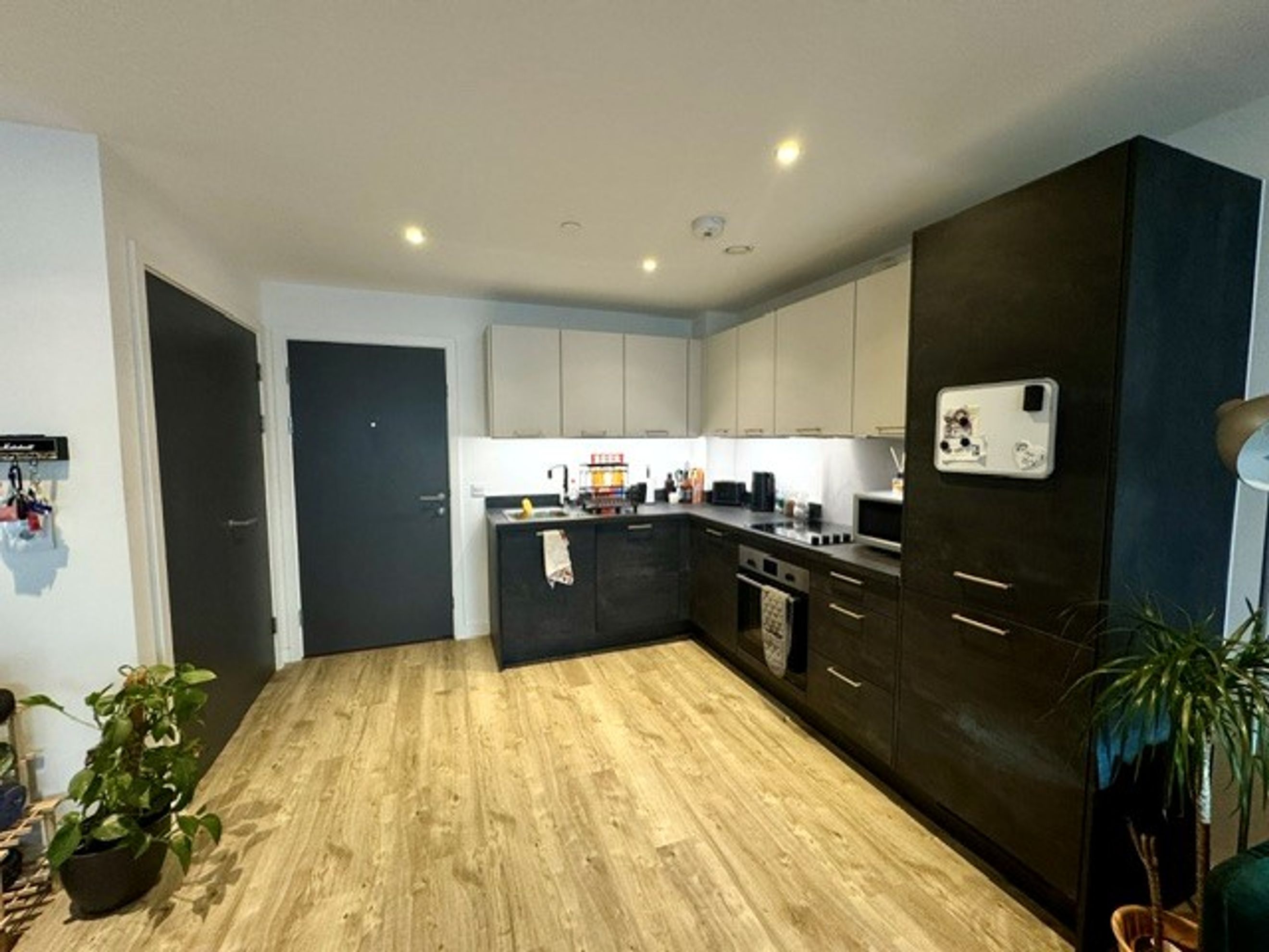 The open-plan living space is bright and airy, with a sleek fitted kitchen featuring integrated appliances and ample workspace. The living and dining area flows seamlessly onto a private balcony.