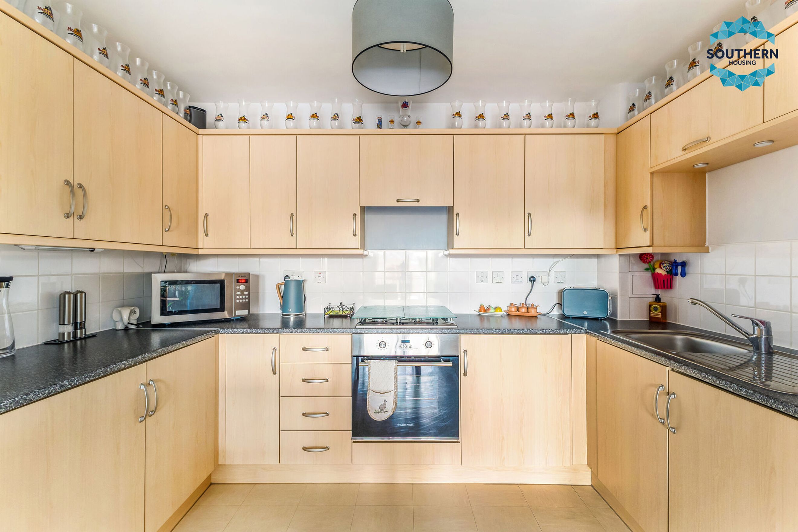 The modern kitchen is thoughtfully designed and fully equipped with integrated appliances, including an oven, hob, and extractor fan. With generous countertop space and ample storage, it’s both stylish and practical.