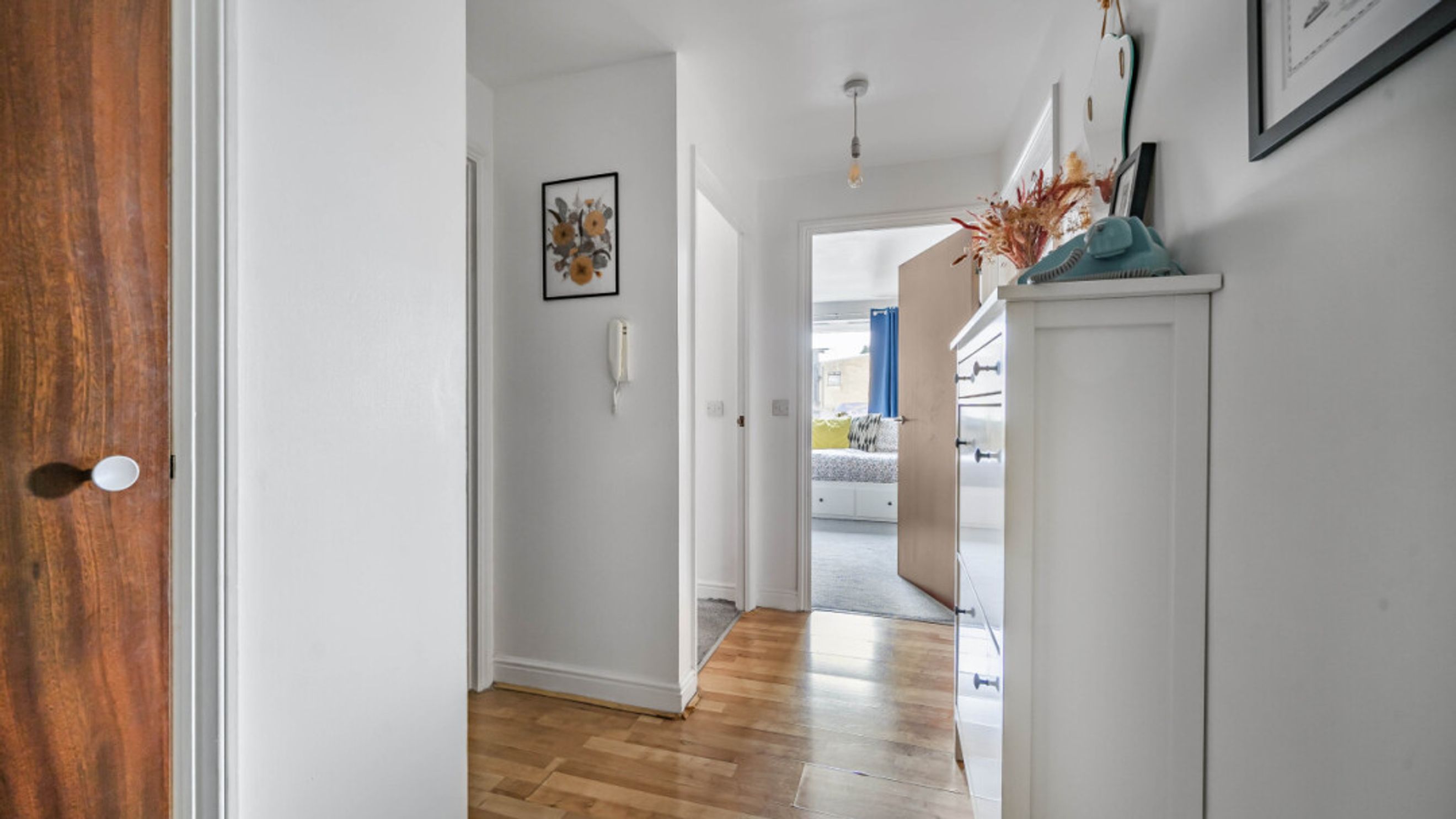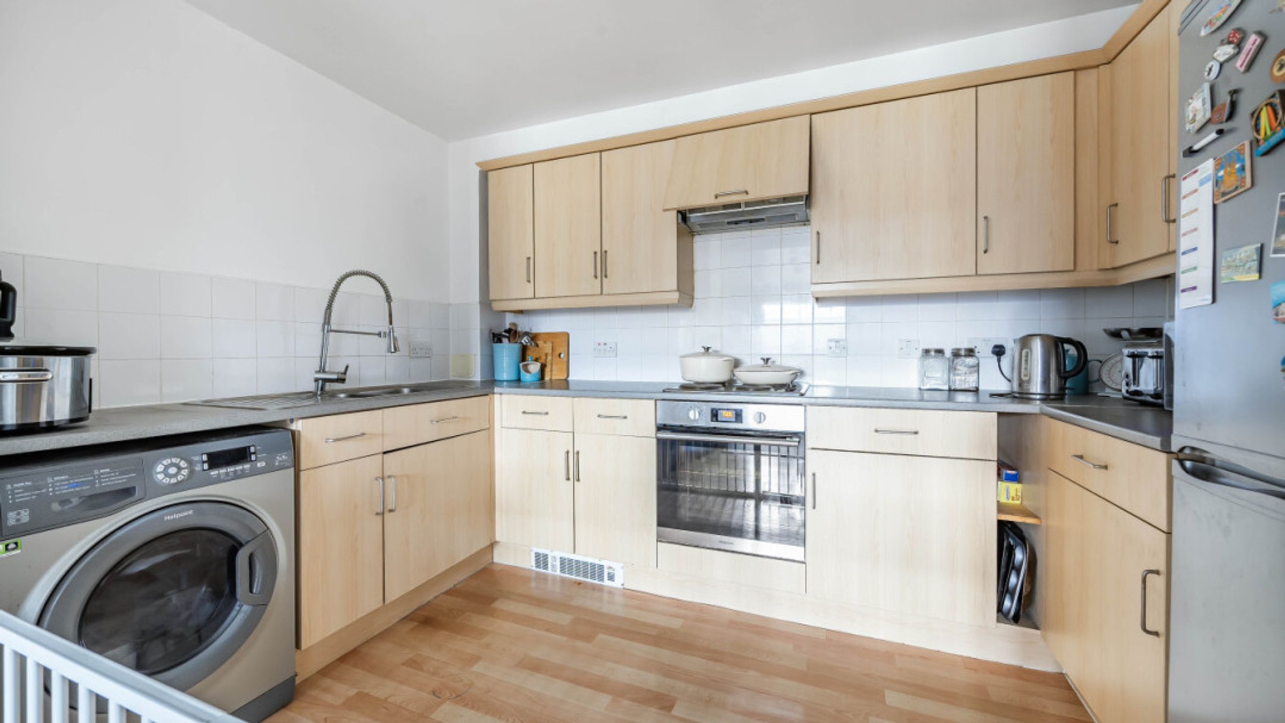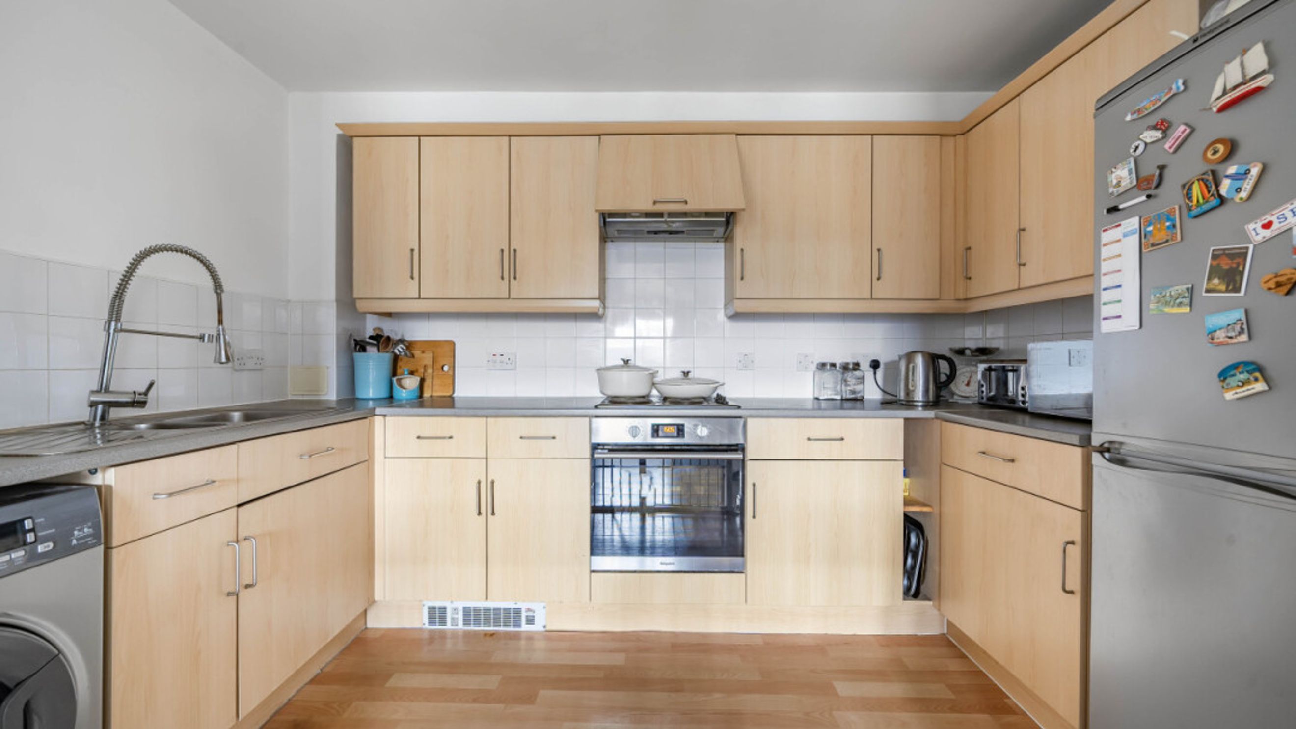 All rooms lead off a central hallway in this bright south facing apartment. A large open plan reception area leads to a private baclony. the kitchen area includes a range of Beech wall and base units with integrated oven, hob and extractor and spaces for white goods. Additionallly, there are two double bedrooms, one with built-in storage and a contemporary family bathroom.