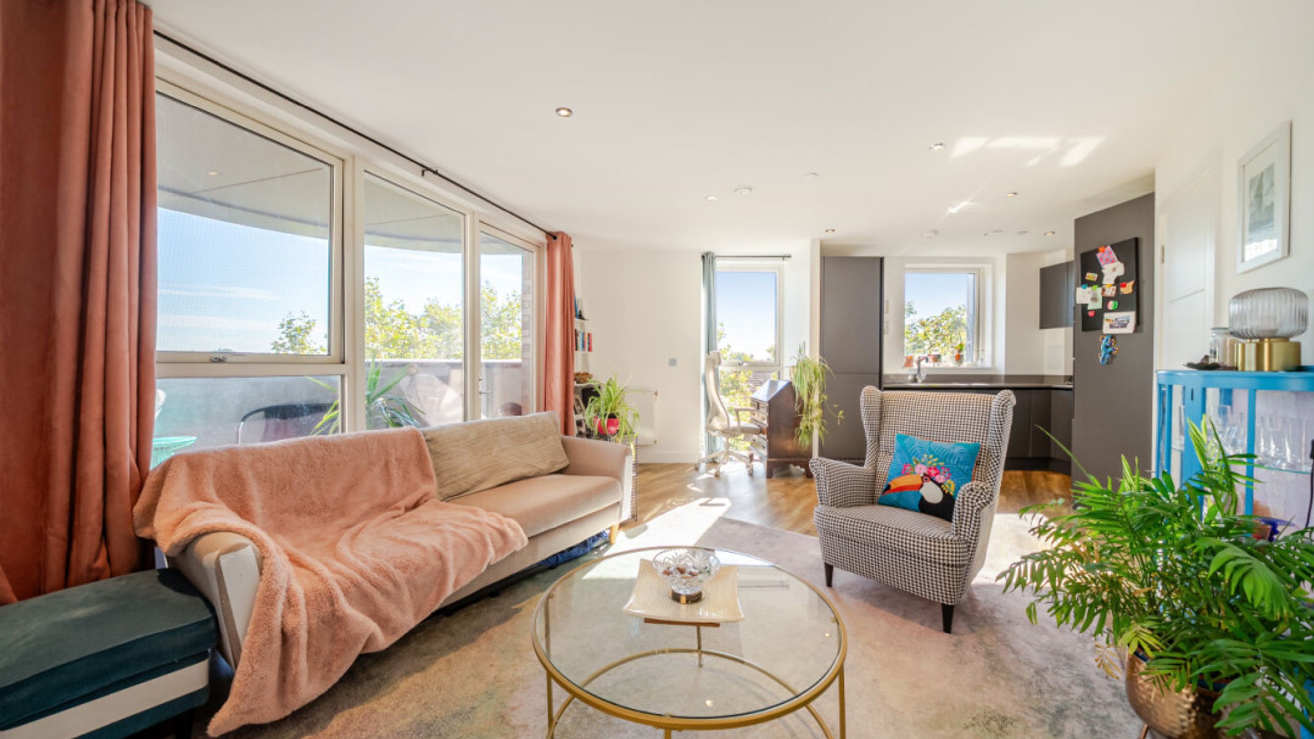 This apartment has an unusual layout, with a triple aspect, which offers bright and spacious living accommodation. The generous main reception room, lit from three sides, opens onto a semi-cirular balcony and the sleek modern kitchen includes fully integrated appliances. Two well proportioned double bedrooms each have mirrored wardrobes and one has benefit of an en-suite shower room. A family bathroom serves the second bedroom.