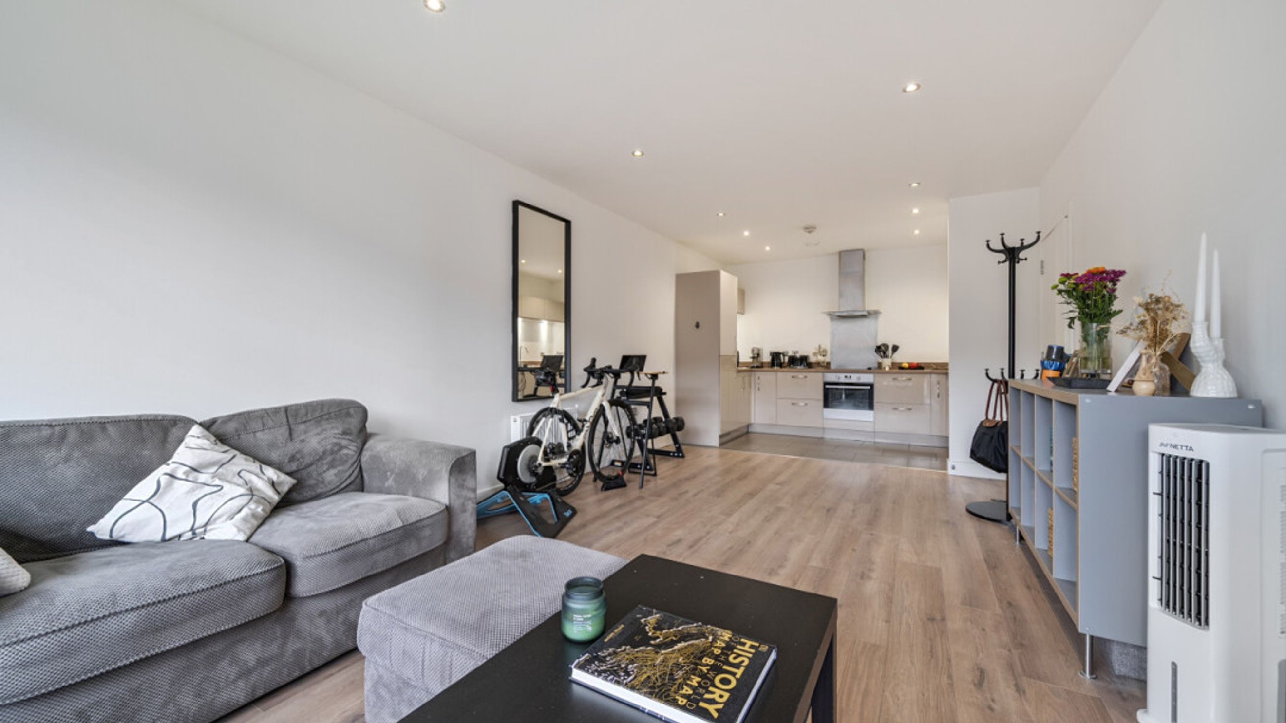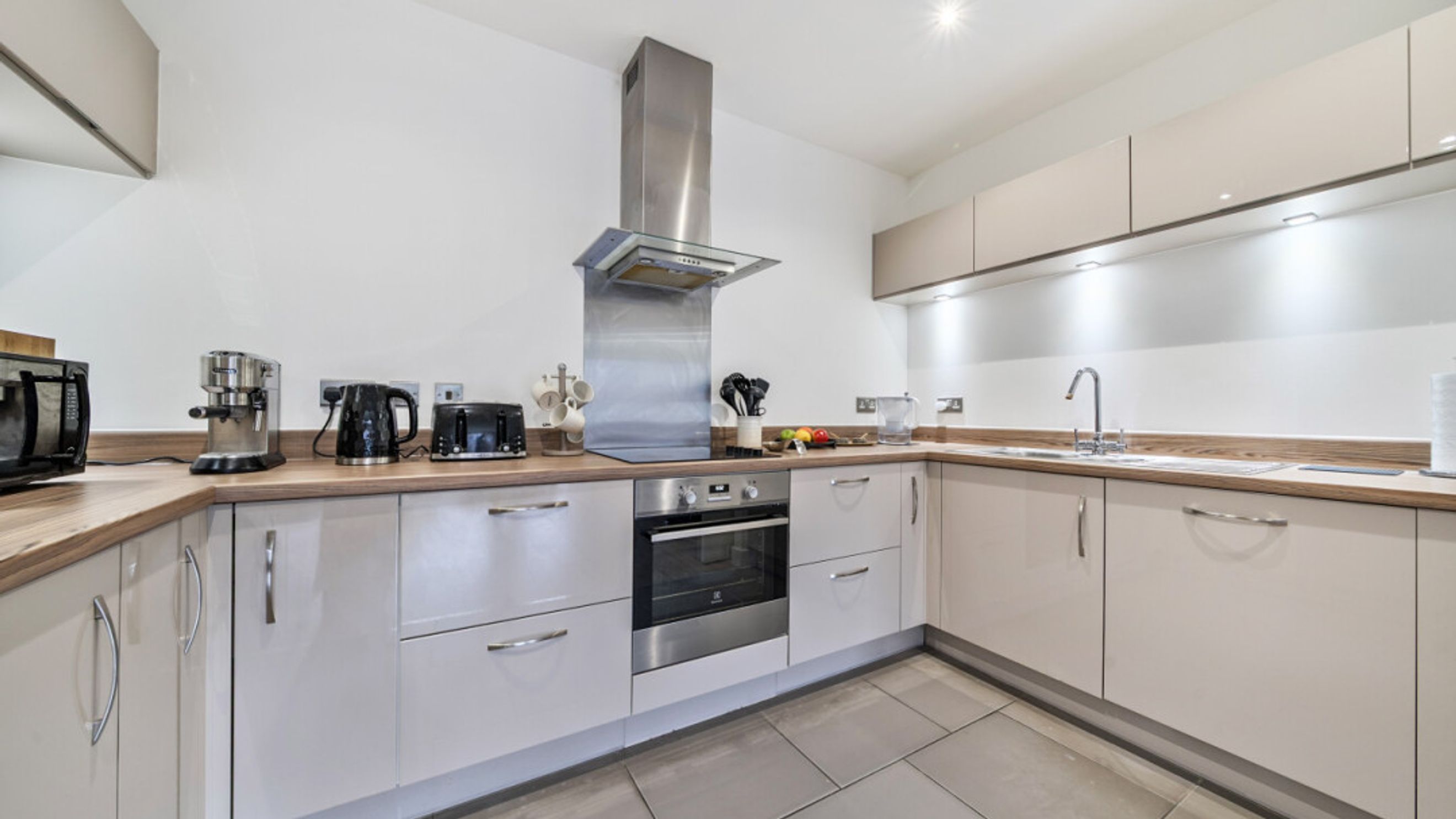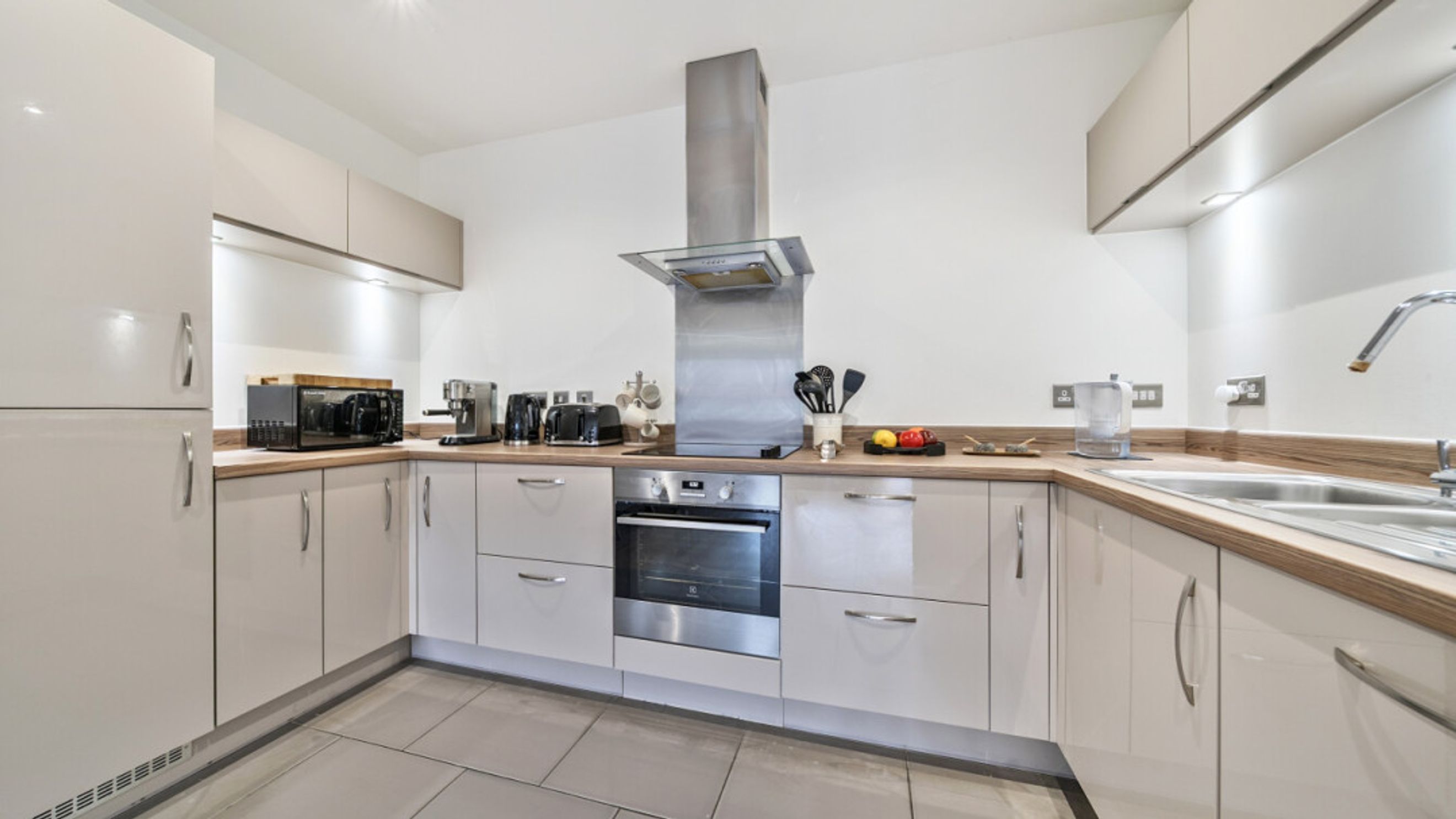 This bright and stylish apartment consists of a stylish multi aspect open-plan kitchen and living area, flooded with natural light from wide floor-length windows and door to private balcony. The kitchen is fitted with grey gloss wall and base units, with under-cupboard lighting, and a light wood effect worktop. The kitchen also benefits from integrated appliances including a fridge freezer, oven, hob, extractor fan and dishwasher. Two bright and airy double bedrooms. Each of the bedrooms overlook the balcony, the master having access to it, along with an en-suite shower room and fitted mirrored wardrobe. The second bedroom also benefits from built in storage The bathroom comes complete with a white three-piece suite with a shower over bath and a stone tile surround. Additional storage cupboards in hallway.