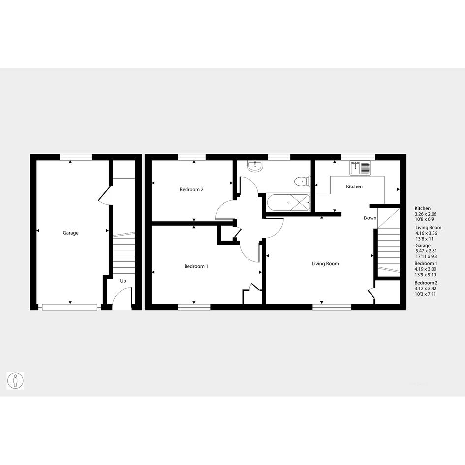 Featuring an open-plan living area. The kitchen is fitted with an integrated oven, hob and hood. There are two comfortable bedrooms, with storage to the master. The bathroom has a modern, white suite.