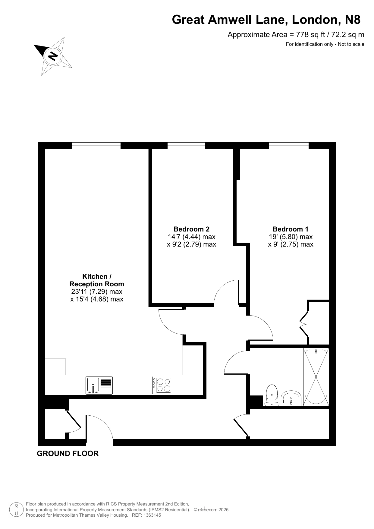 The property features an entrance hallway, an open-plan living room and kitchen, two bedrooms, and one bathroom.