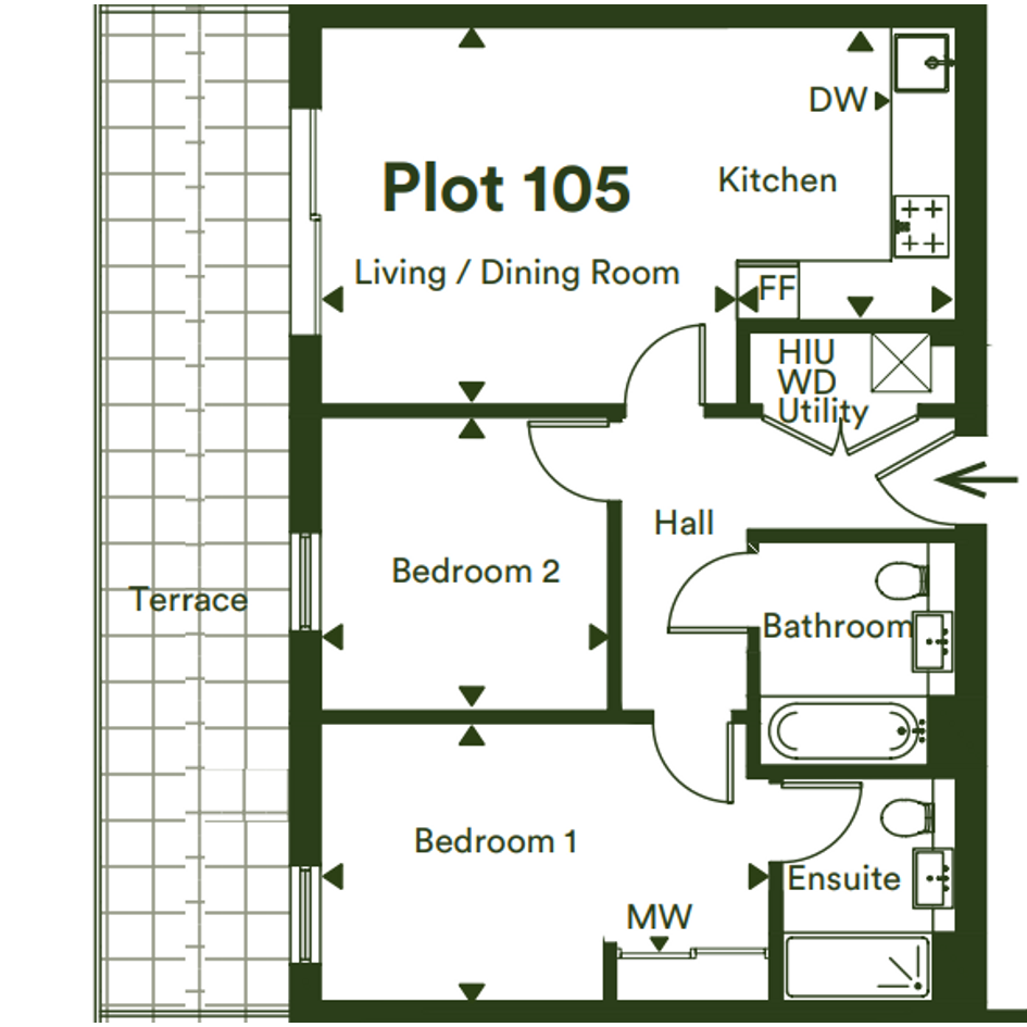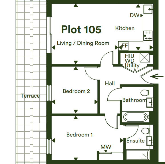 Discover Plot 105 - 2 bedroom first floor apartment with a private terrace and an allocated parking space. The kitchen boasts integrated appliances as standard. Bedroom one includes a mirrored fitted wardrobe and an en-suite.