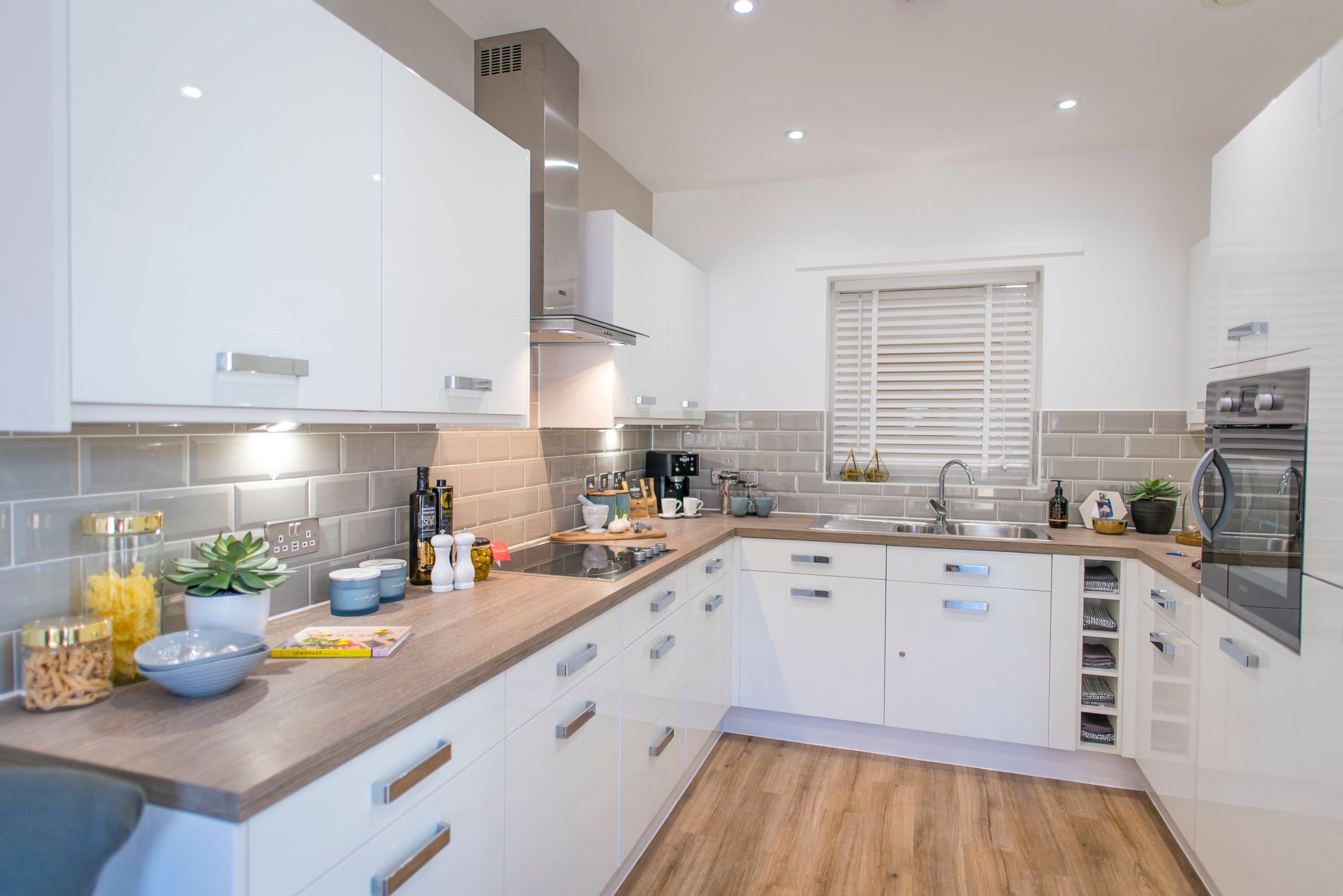 - Fitted Elise gloss white kitchen with built-in Zanussi single oven, hob and extractor hood