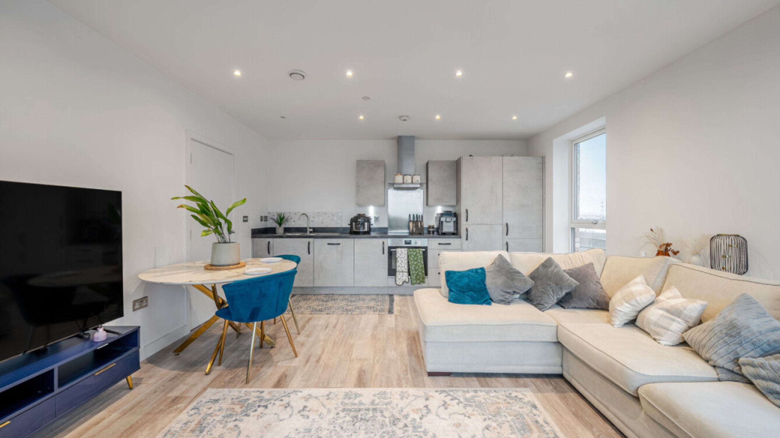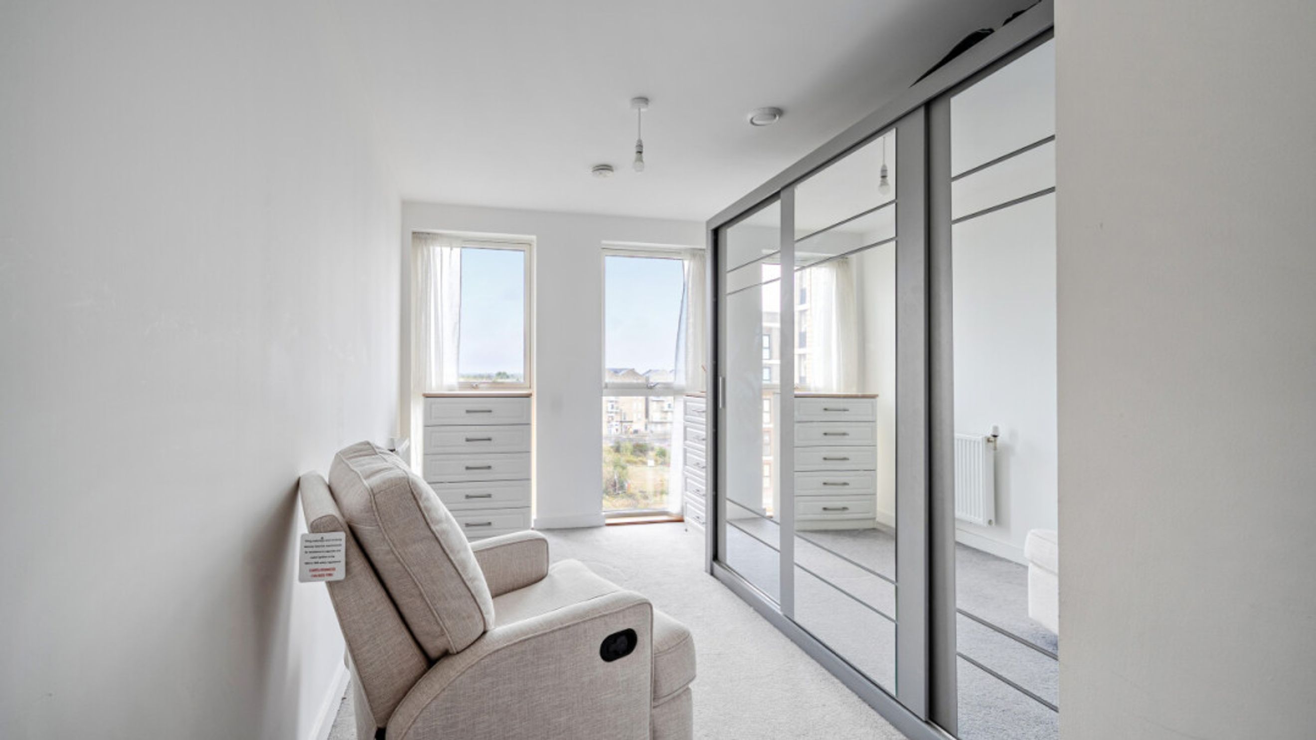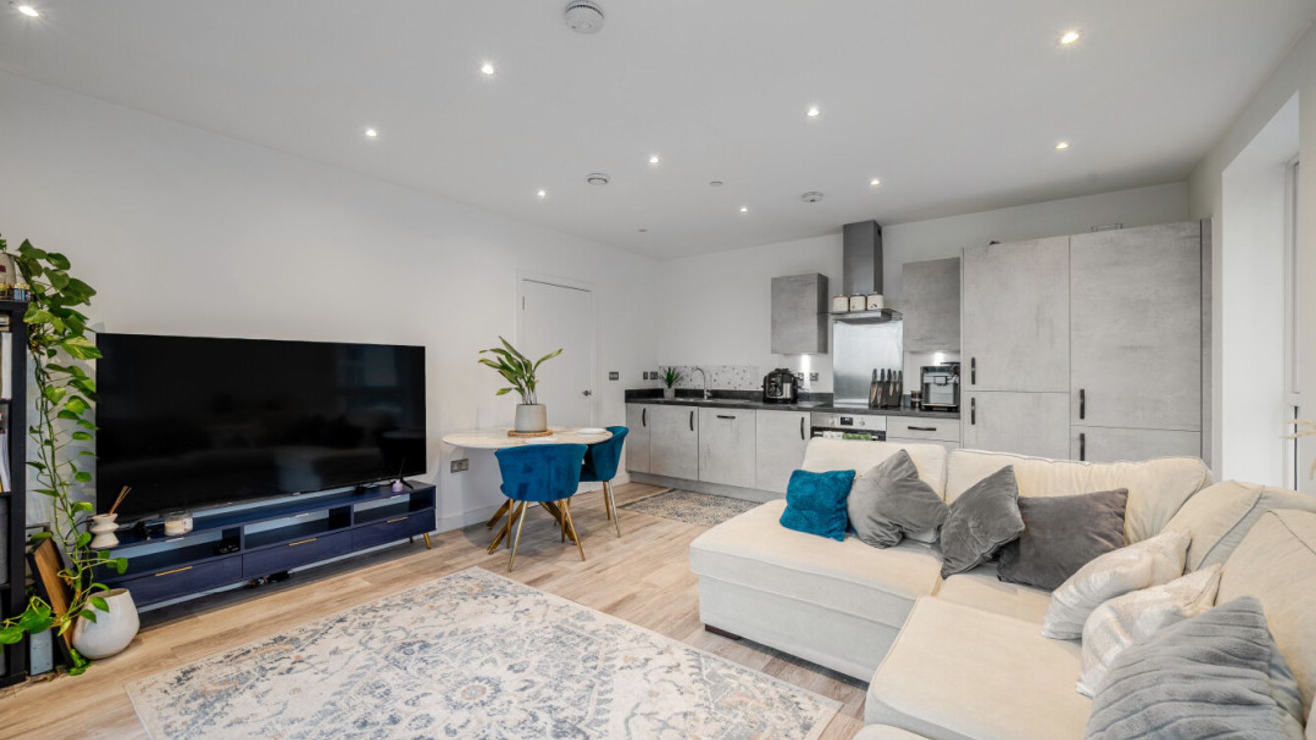 This apartment centres on a dual aspect open-plan kitchen and living area, flooded with natural light, which opens onto a private balcony. The modern kitchen is fitted with matt grey wall and base units, with stylish under-cupboard lighting, and a marble effect worktop. It also benefits from integrated appliances including a fridge freezer, oven, hob, extractor fan and dishwasher. There are two generous double bedrooms. the master including mirrored wardrobes. The second bedroom is currently used as a dressing room. A contemporary family bathroom completes the accommodation. This property comes with no parking but there is a visitor parking allowance of 100 hours per calendar month.