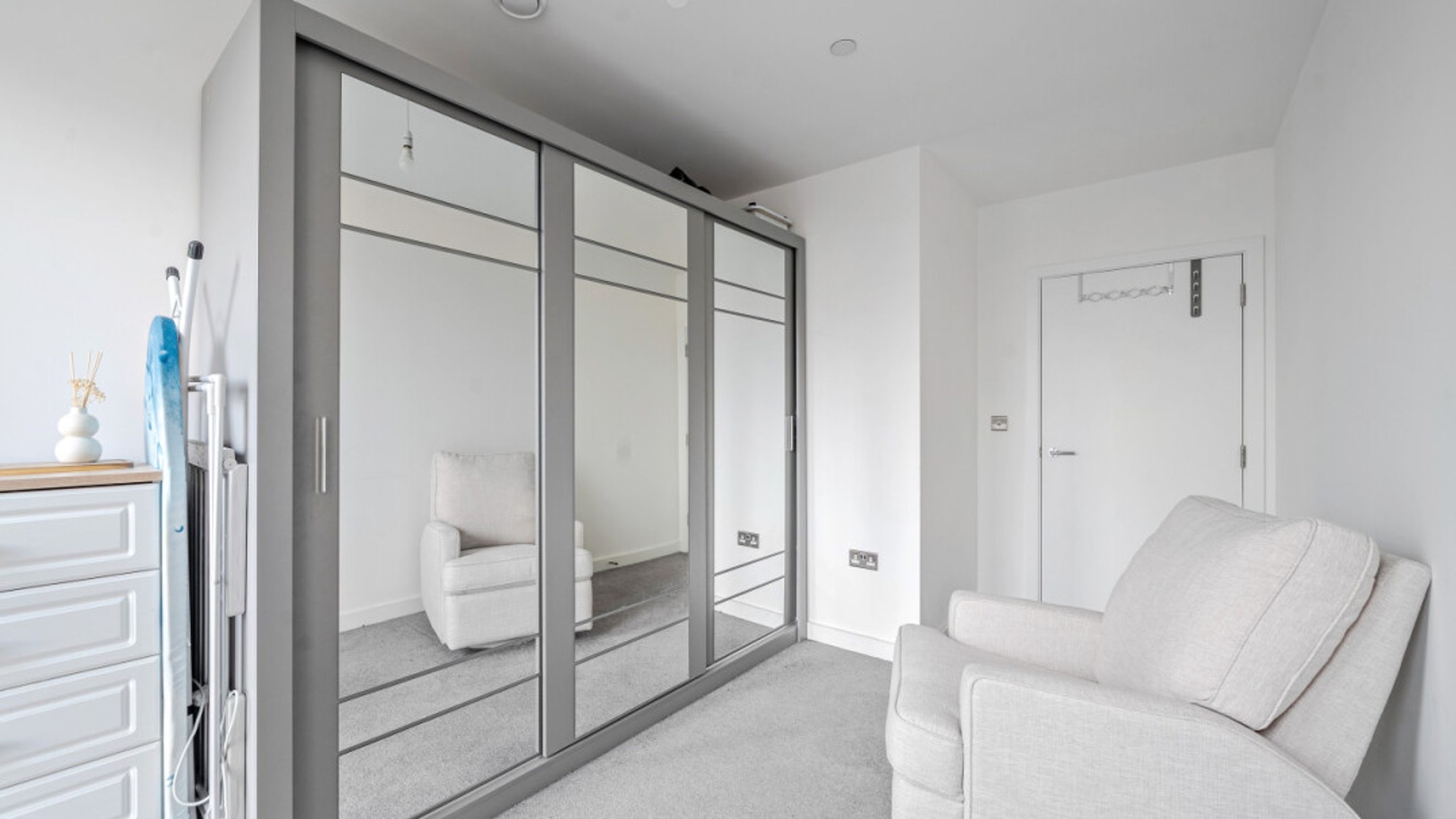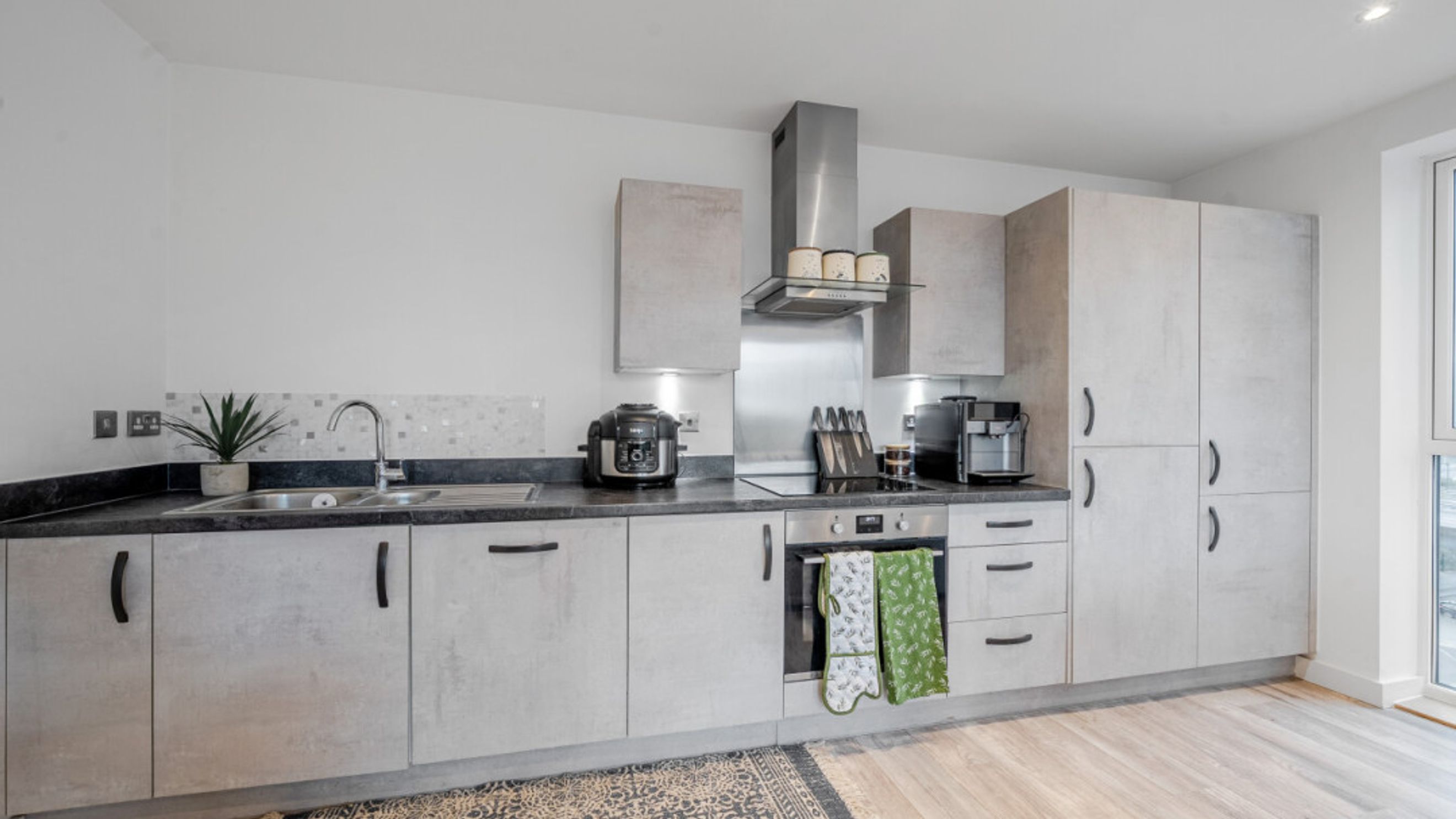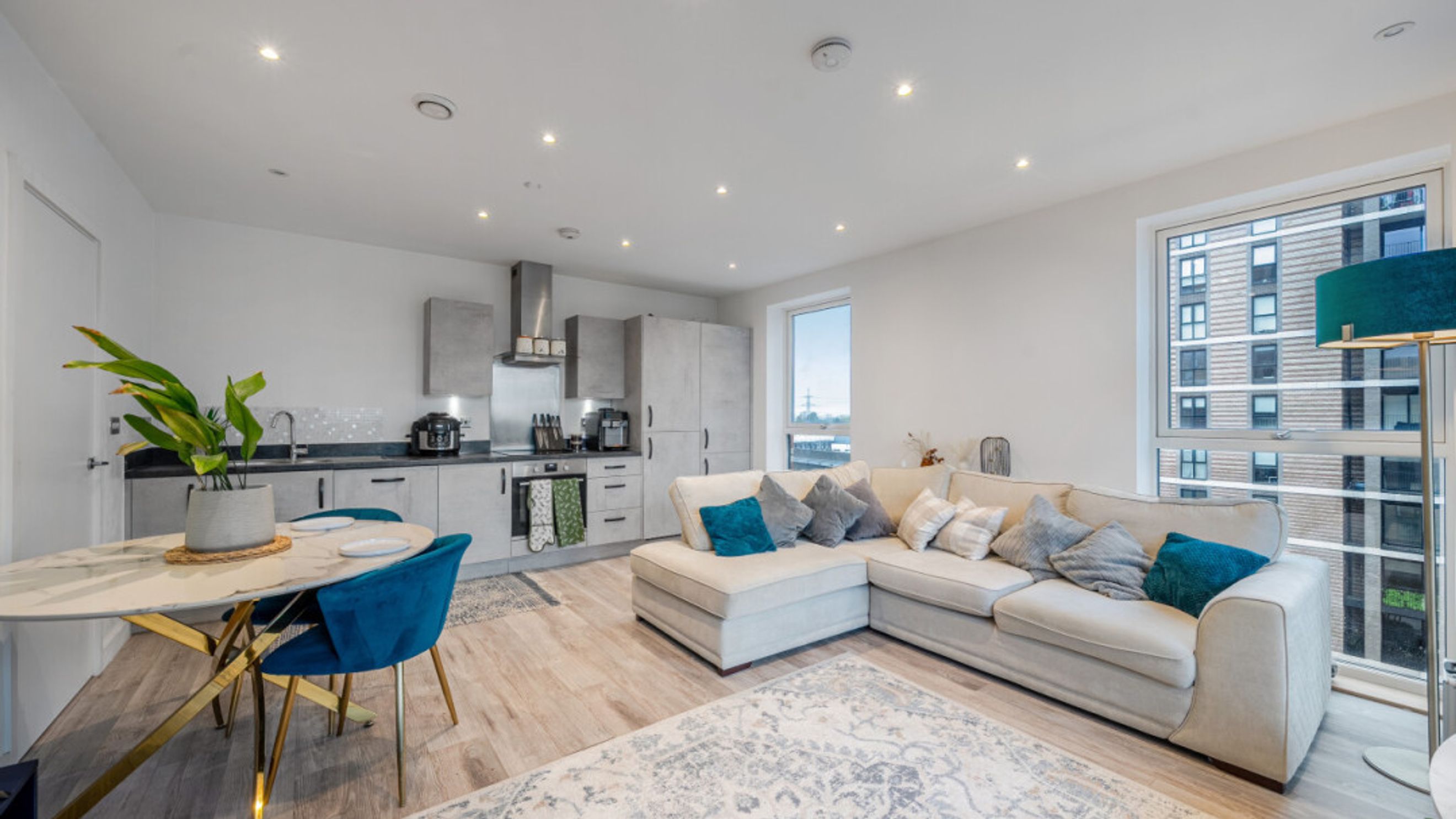 This apartment centres on a dual aspect open-plan kitchen and living area, flooded with natural light, which opens onto a private balcony. The modern kitchen is fitted with matt grey wall and base units, with stylish under-cupboard lighting, and a marble effect worktop. It also benefits from integrated appliances including a fridge freezer, oven, hob, extractor fan and dishwasher. There are two generous double bedrooms. the master including mirrored wardrobes. The second bedroom is currently used as a dressing room. A contemporary family bathroom completes the accommodation. This property comes with no parking but there is a visitor parking allowance of 100 hours per calendar month.