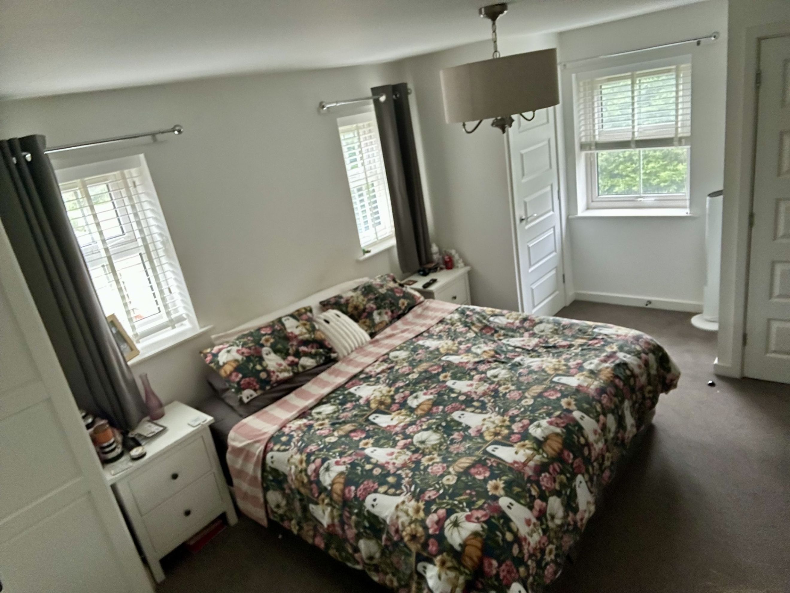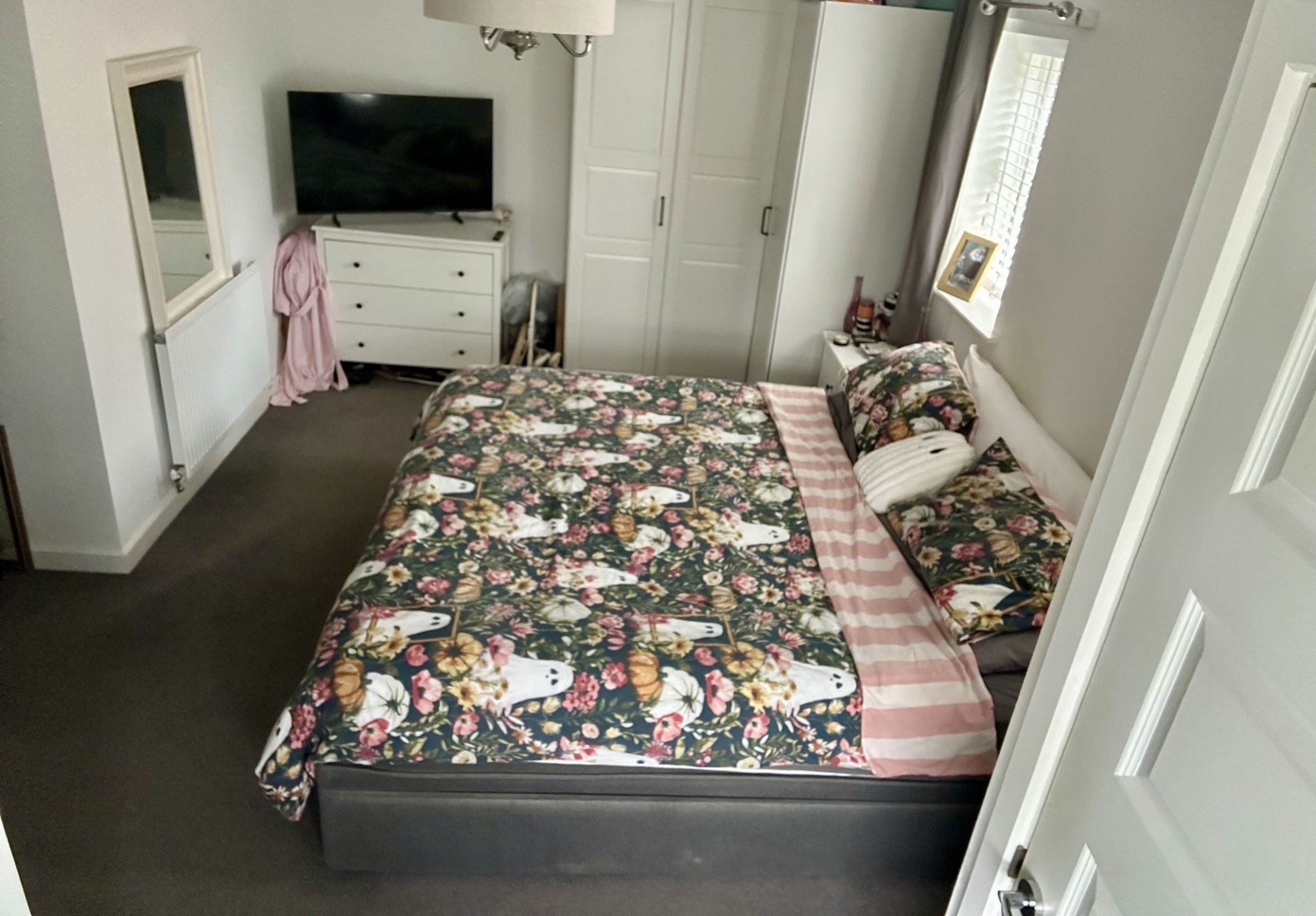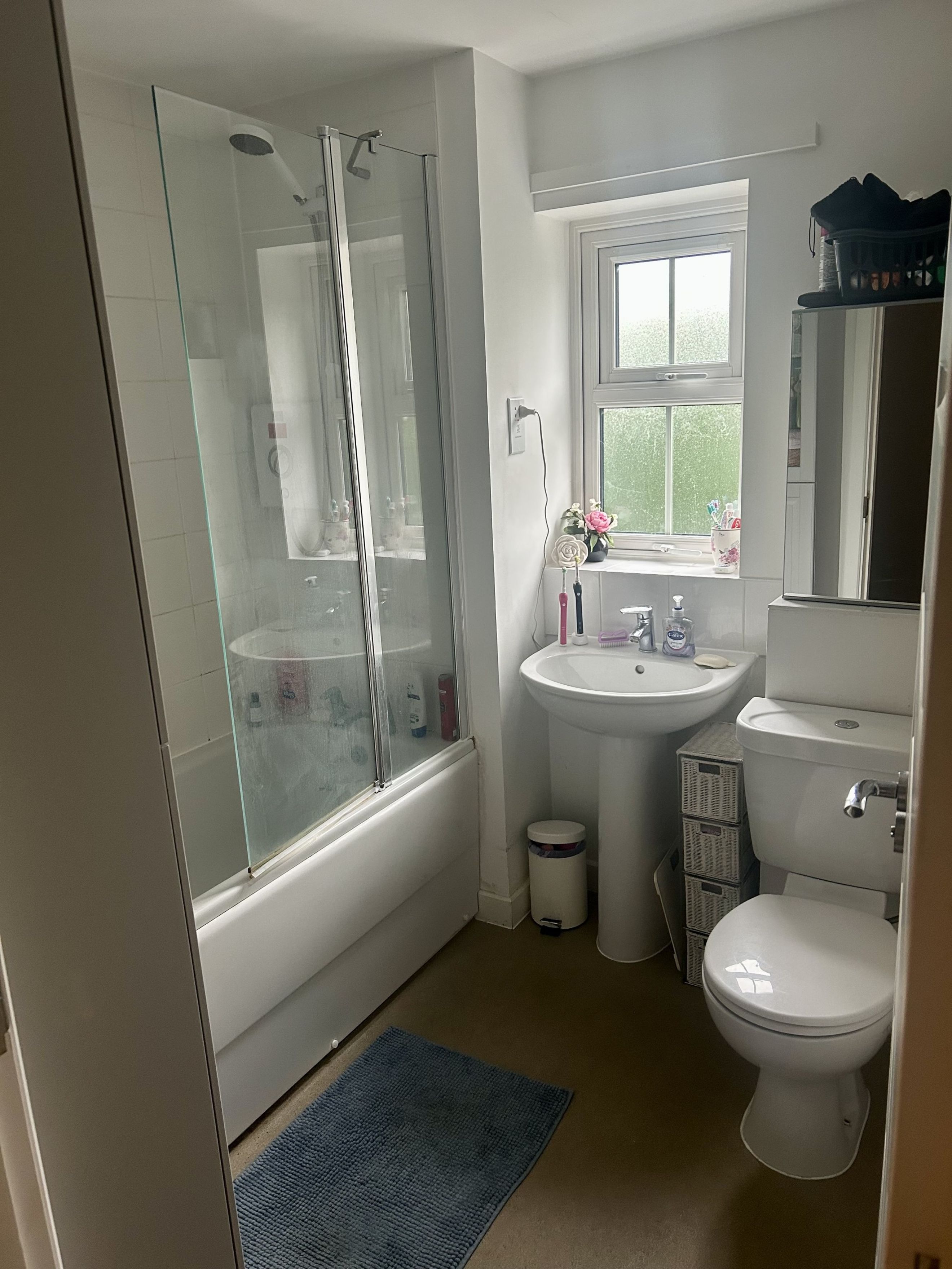 Upstairs, the property features 3 bedrooms— 2 generous doubles and 1 single. The master bedroom includes 2 built-in storage cupboards. The family bathroom is fitted with a modern three-piece suite, including a shower over the bath and a window for natural light.