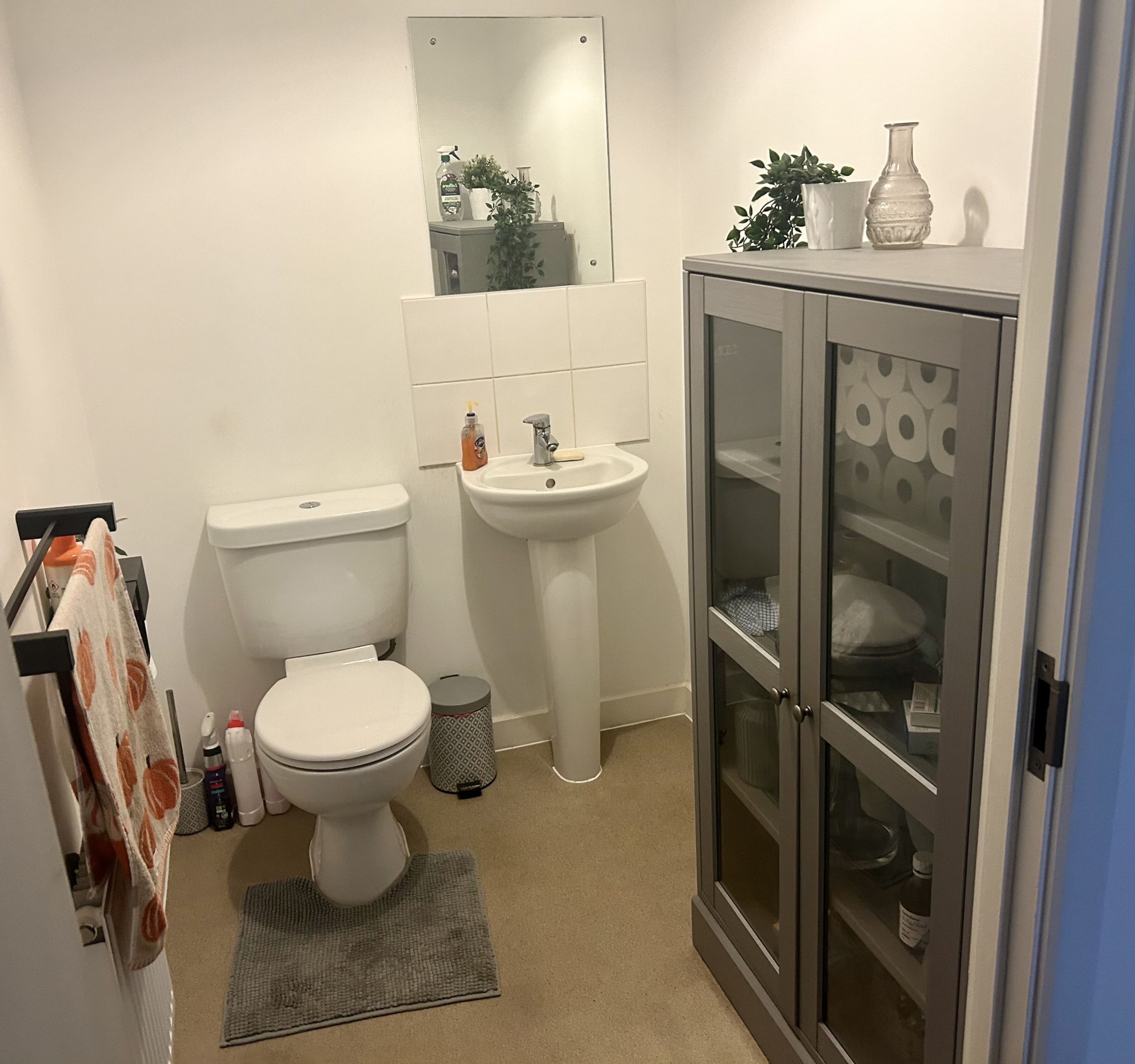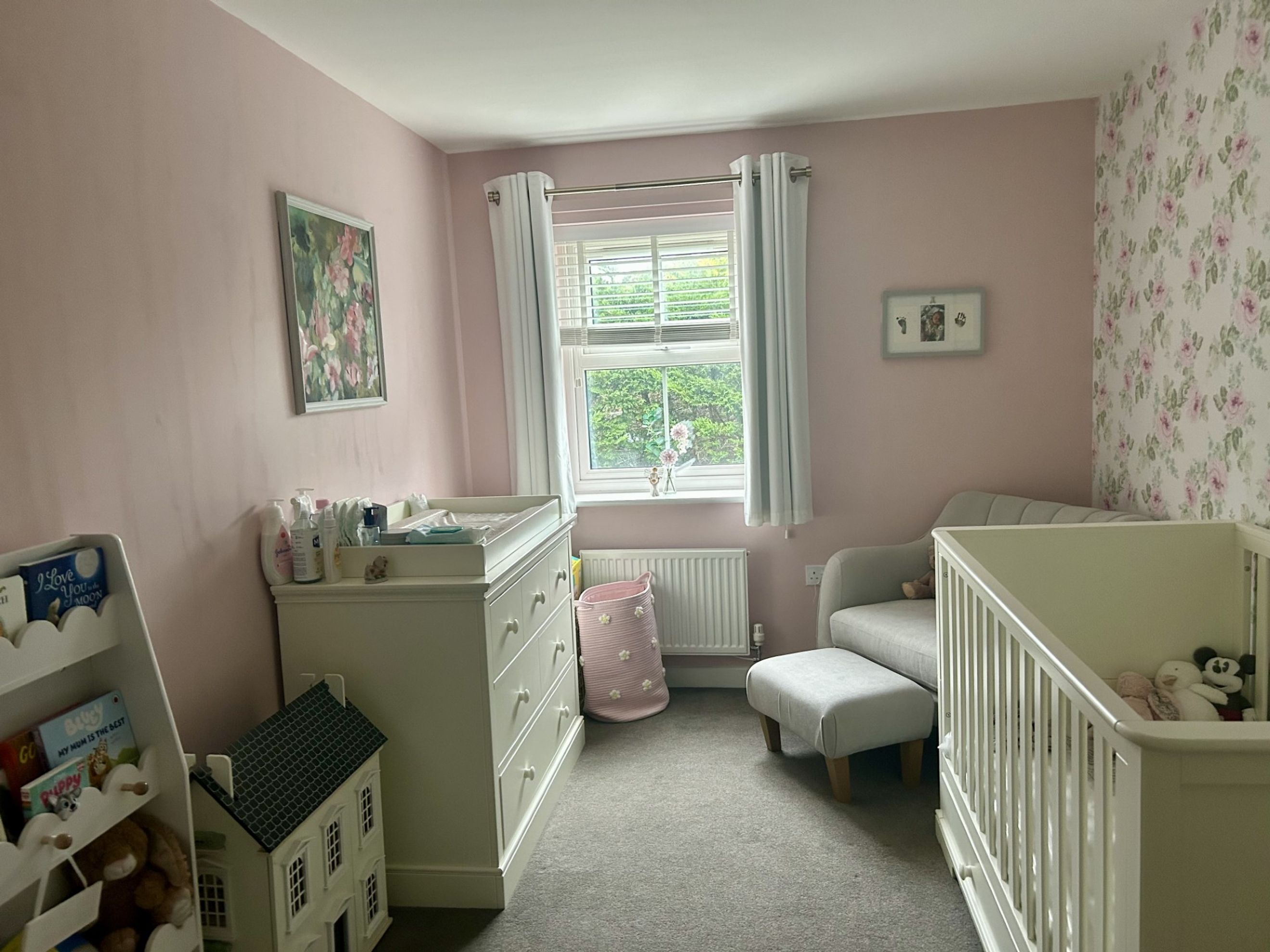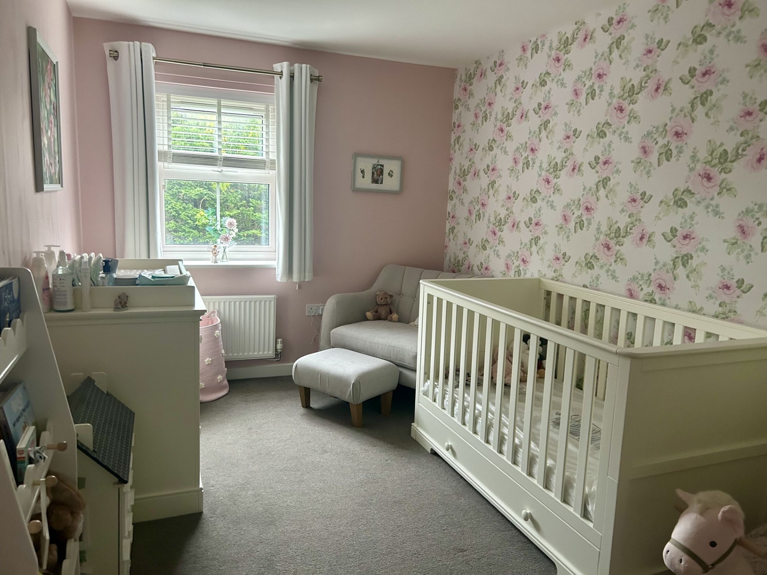Upstairs, the property features 3 bedrooms— 2 generous doubles and 1 single. The master bedroom includes 2 built-in storage cupboards. The family bathroom is fitted with a modern three-piece suite, including a shower over the bath and a window for natural light.