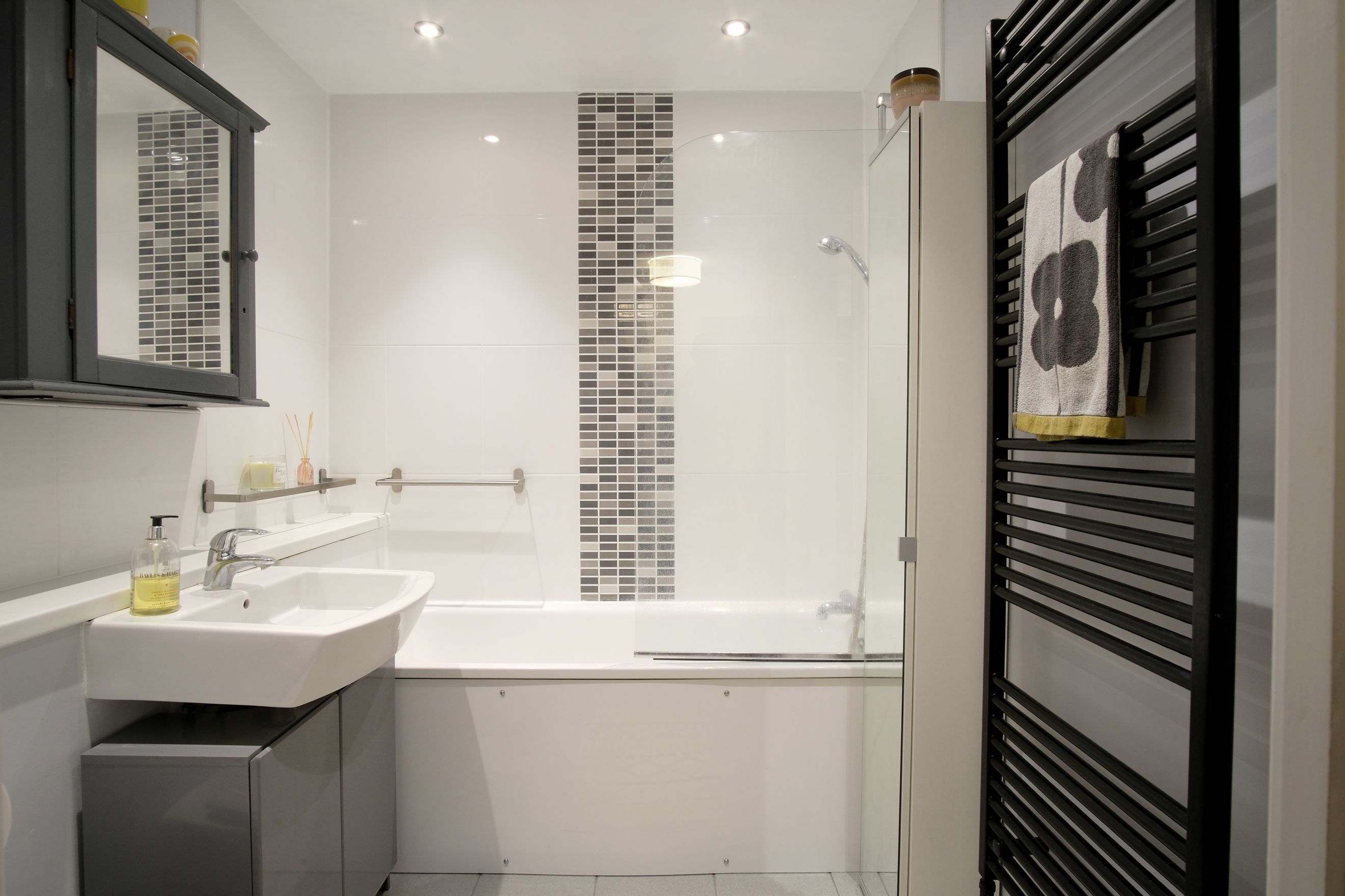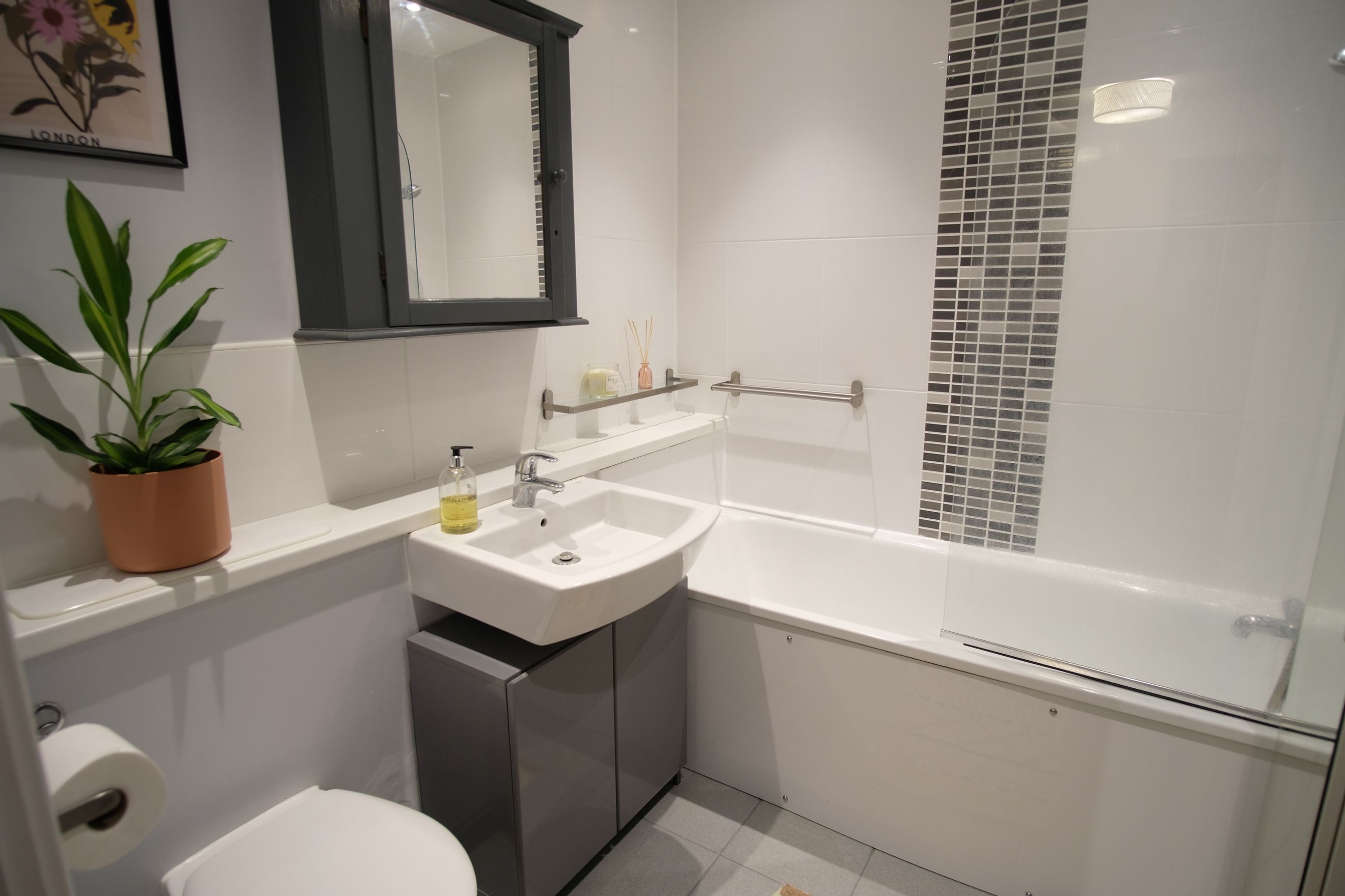 Main bathroom fitted with a modern white suite, wall-mounted basin, concealed cistern WC, and tiled finishes. The en-suite adds convenience and privacy to the main bedroom.