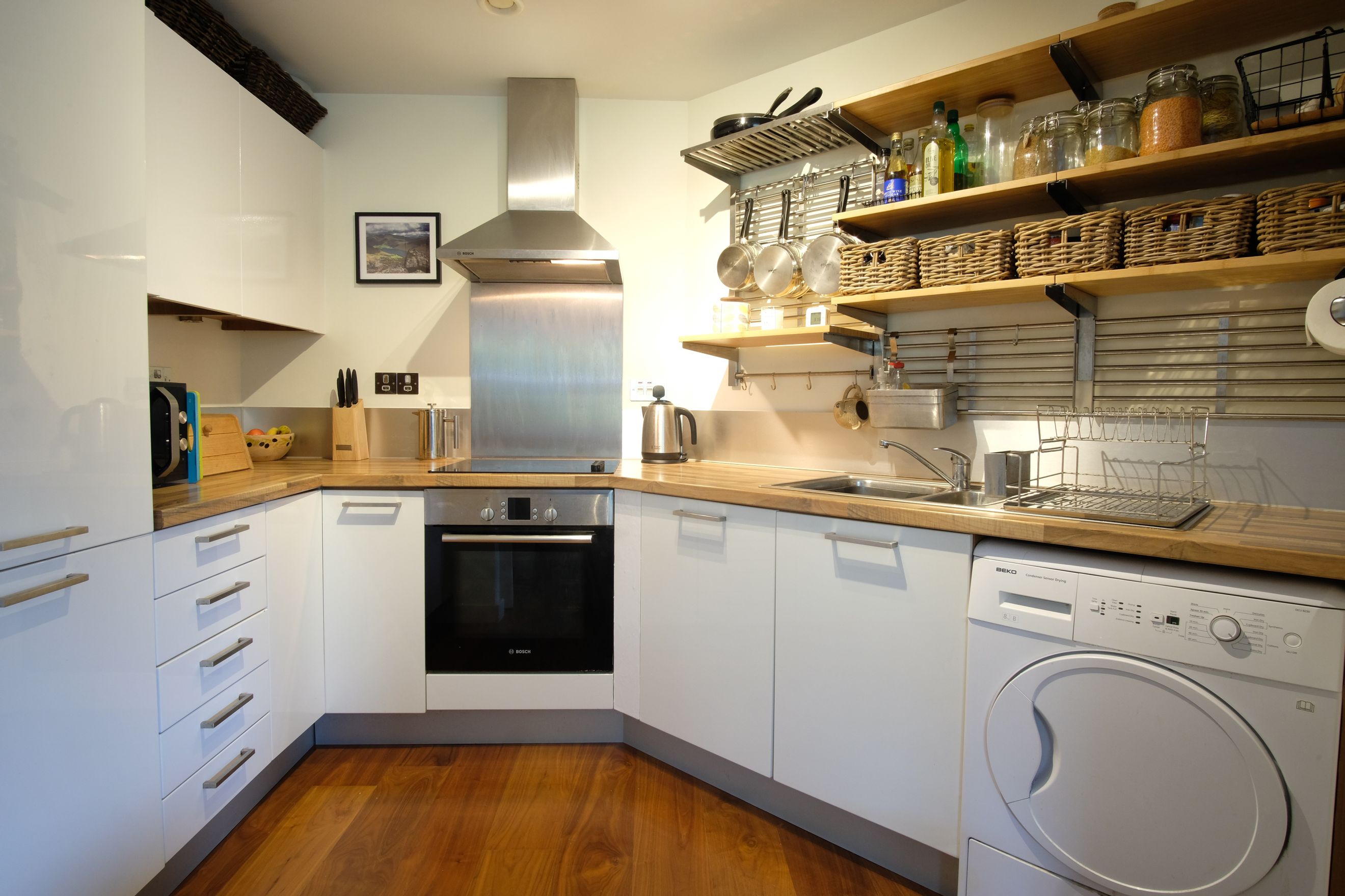 Contemporary fitted kitchen with integrated Bosch appliances (fridge freezer, oven and ceramic hob), and ample worktop space. Designated space for a dishwasher or tumble dryer.