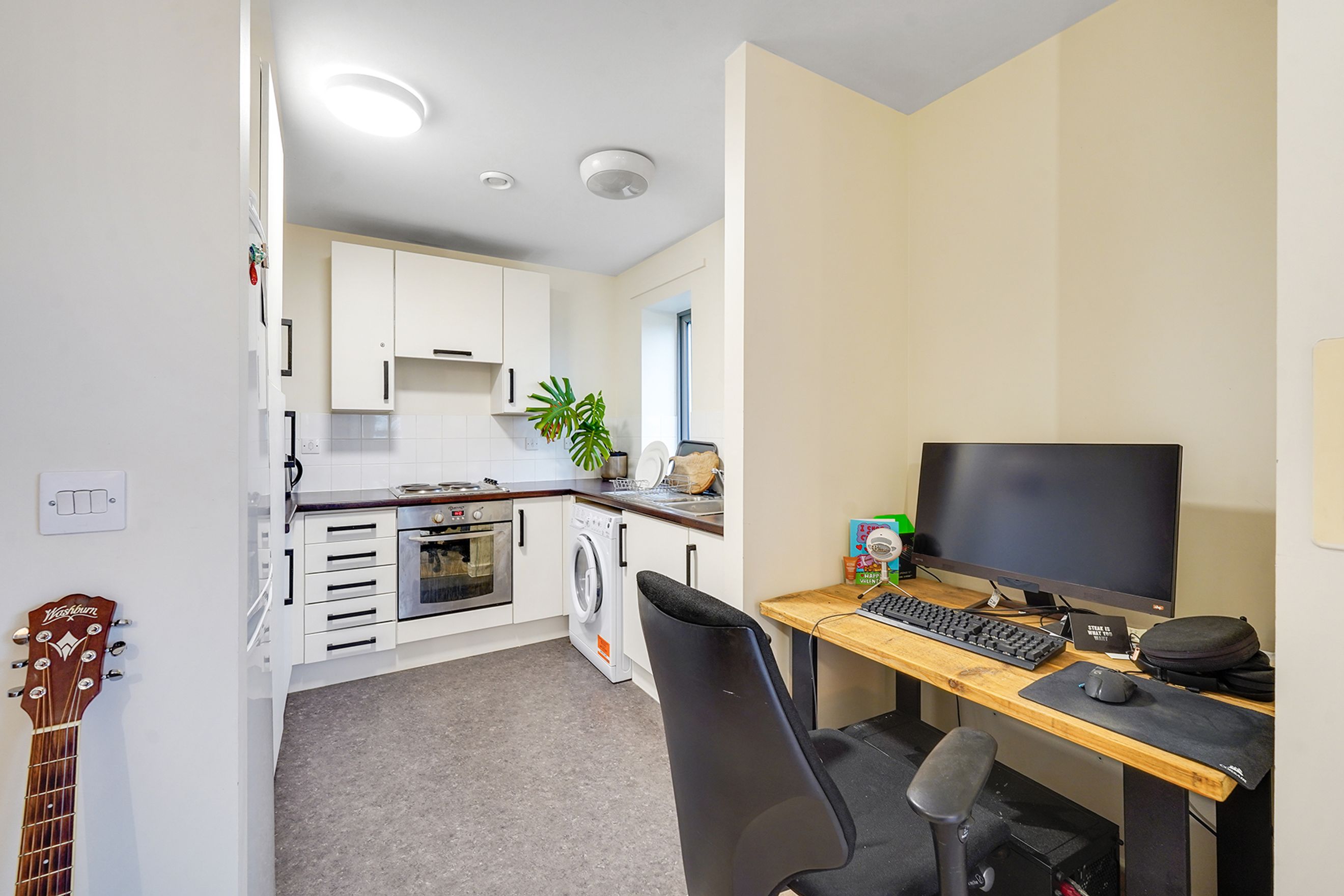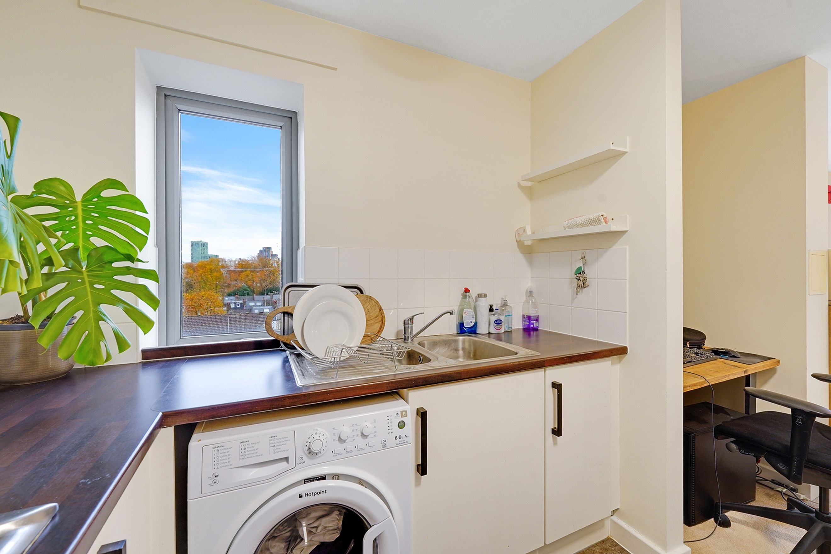 The kitchen has converted storage space, good surface area and space for appliances. The flat has newly fitted electric heaters throughout as well as a new hot water tank. There is also built in storage in the hall, making the most of the space.
