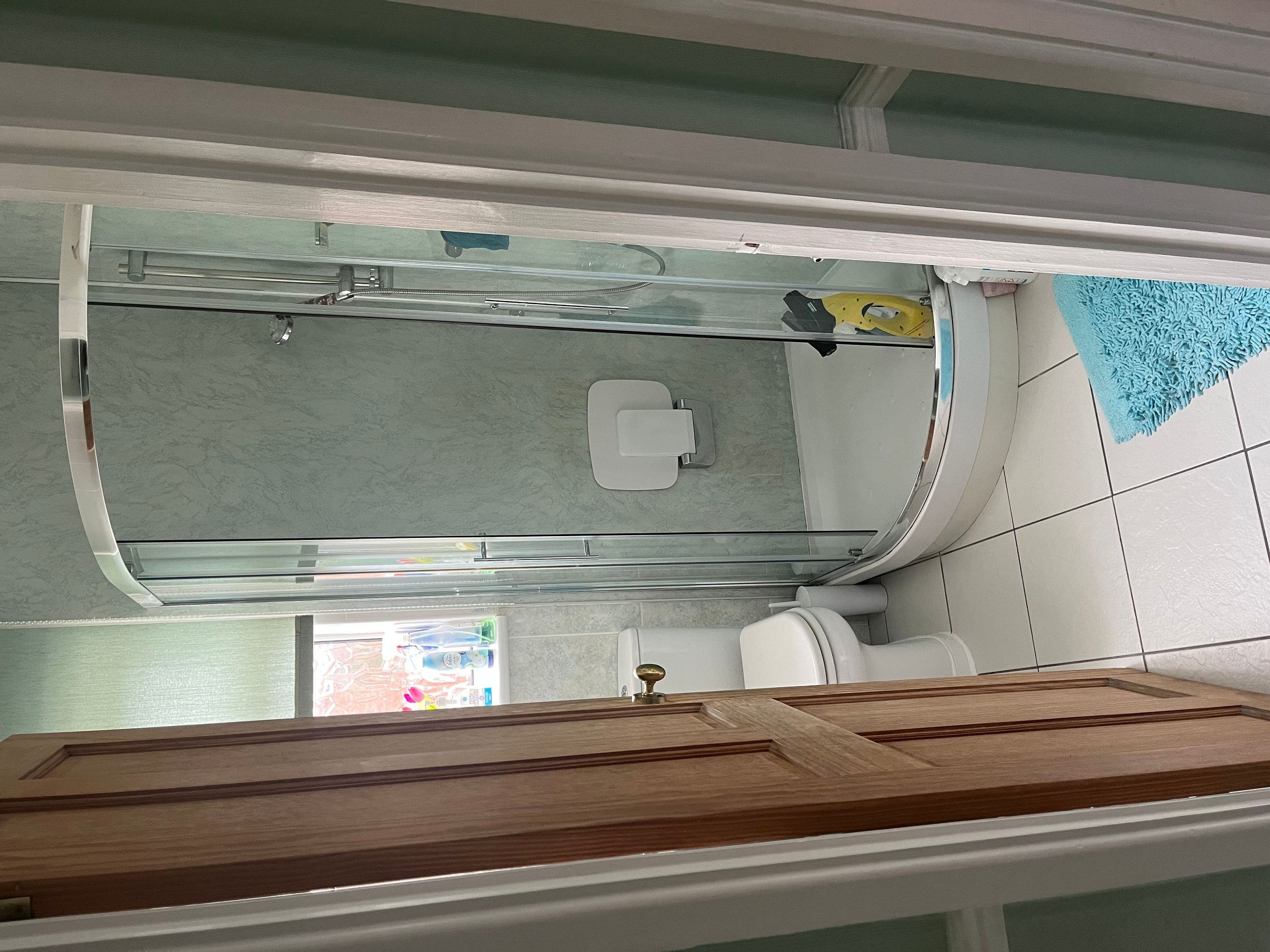 Bathroom - Tiled floor with floor heating element not currently connected. Window to rear and water heated towel rail. Partly tiled and grouted full height and partly bathroom water proof panels no grouting required. Quadrant corner shower with temperature-controlled mixer taps. Hand basin with cupboard, mirrored wall cupboard above with electric shaver point and light. Low level WC pan.