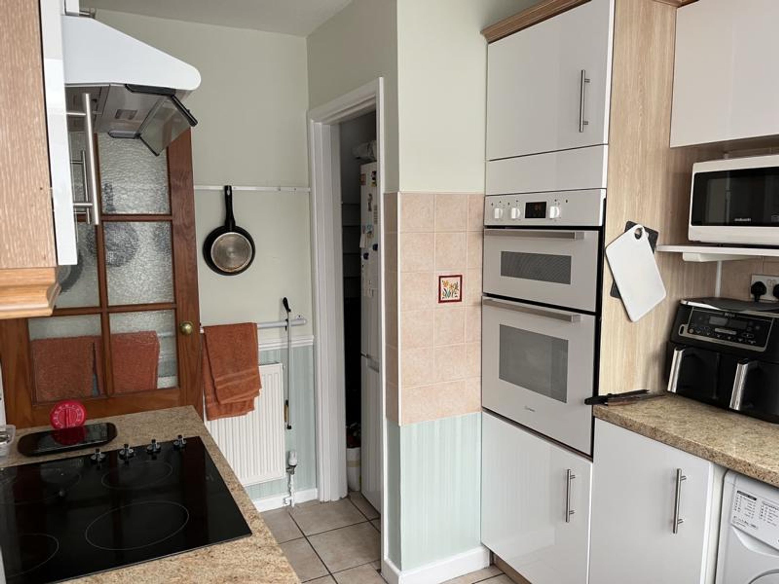 Kitchen - Tiled floor, central heating radiator and towel rail, access to understairs for storage, gas and electric smart meters, fuse box and space for fridge freezer. Substantial kitchen wall and base units, door frontage replaced in 2024/5. Tall double oven and grill, electric ceramic hob with fitted filter over microwave oven shelf. Fitted stainless steel sink and taps with access under to water stopcock, plus free-standing washing machine and integrated slimline dishwasher. Rear door to; conservatory full width of house 2700mm deep, water isolation taps, lighting and two double power sockets, low energy use electric wall heater.