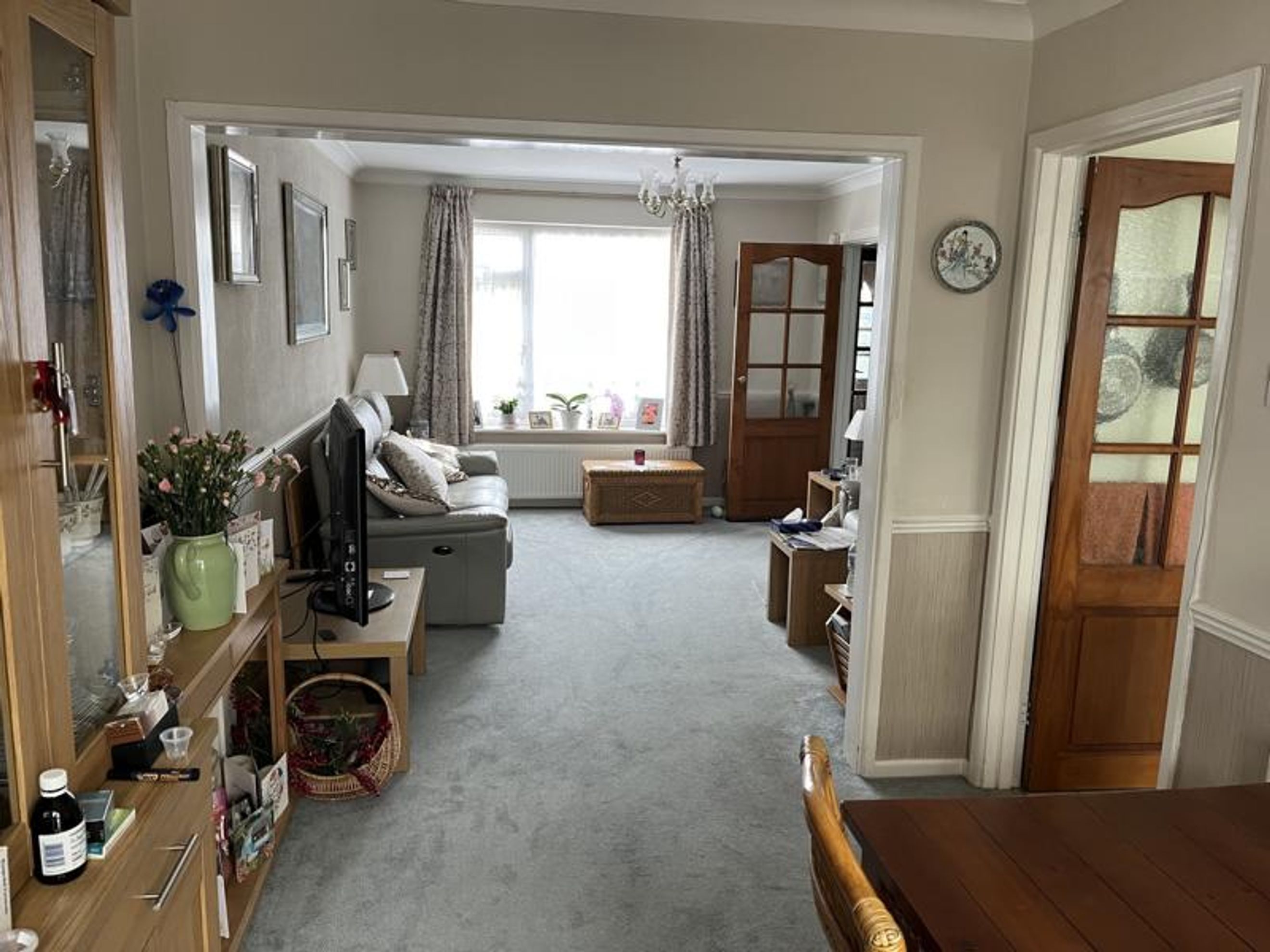 Dining room area, central heating radiator, two double power sockets, rear French doors to conservatory. Fully carpeted. Single door leading to;