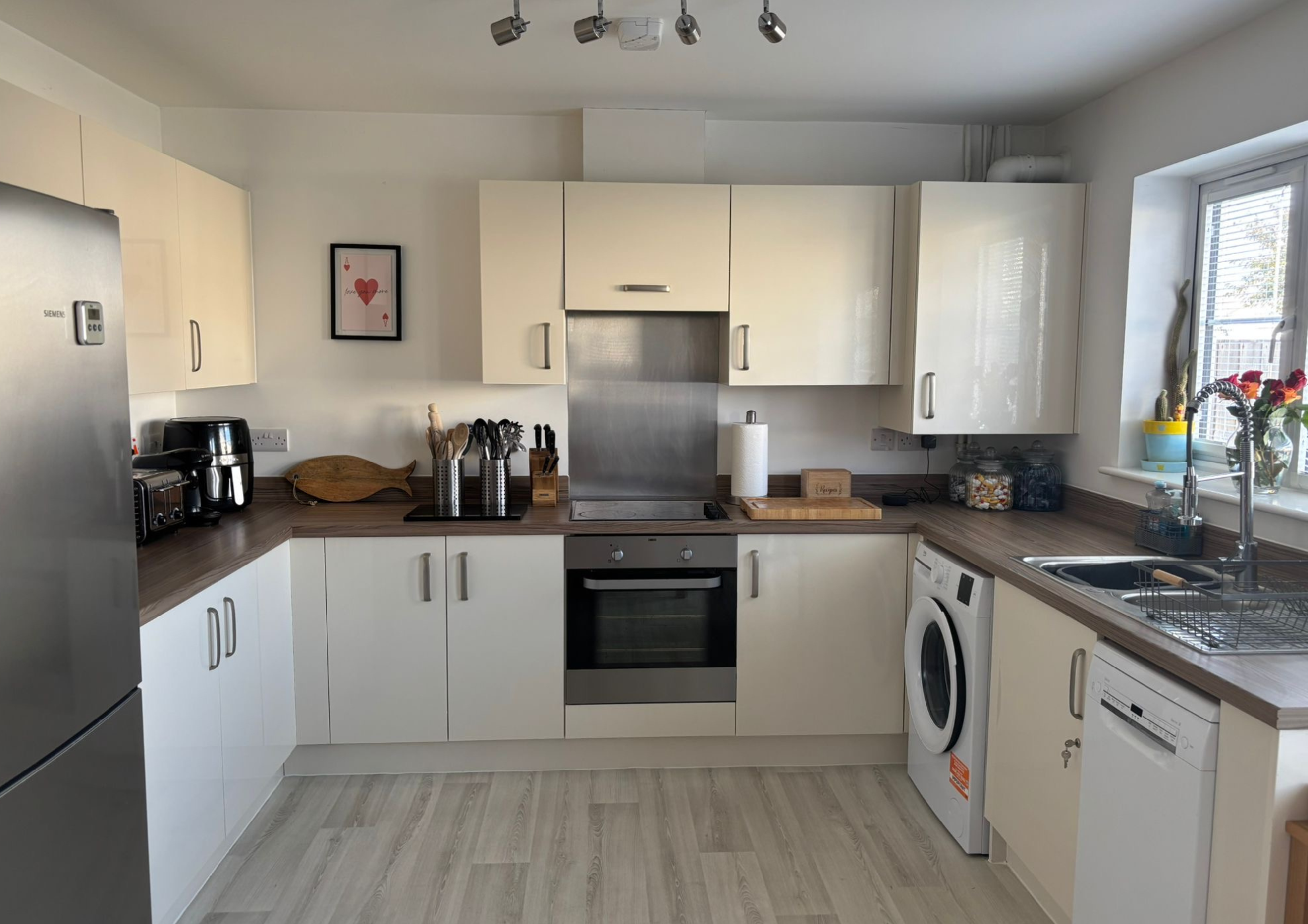 · A generously sized kitchen with dining area with a hob & oven, featuring double doors into the garden at the rear of the house. The kitchen also has access to a downstairs toilet with mirror over the sink and a spacious storage cupboard. Plumbing in place for a washing machine and dishwasher.