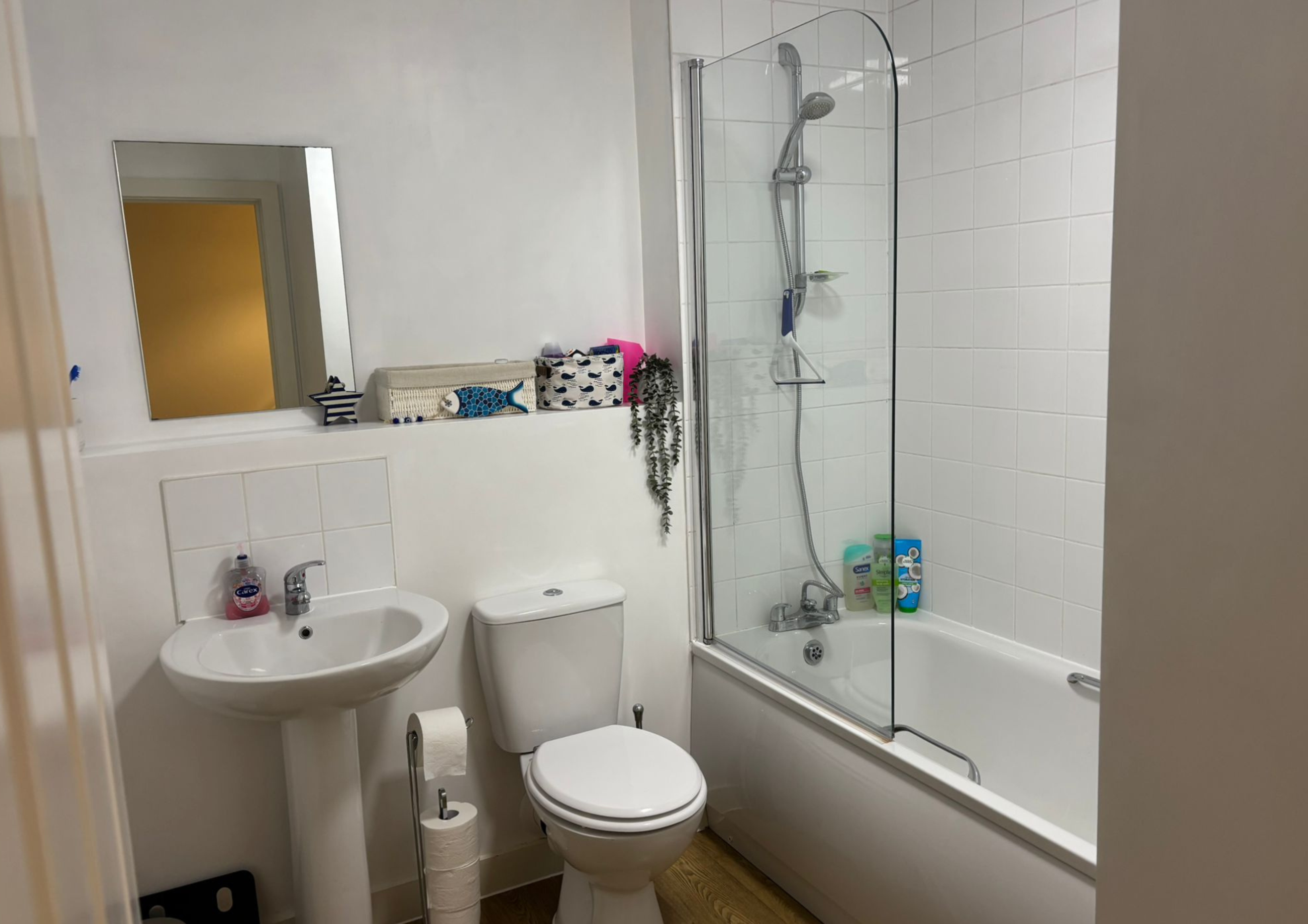 · A modern family bathroom with full-sized bath with overhead shower, toilet, heated towel rail and mirror over sink.
