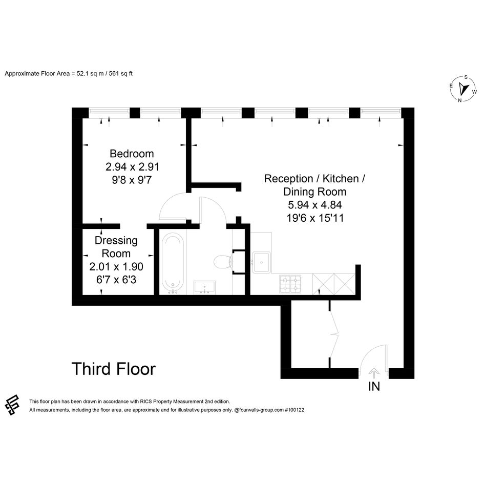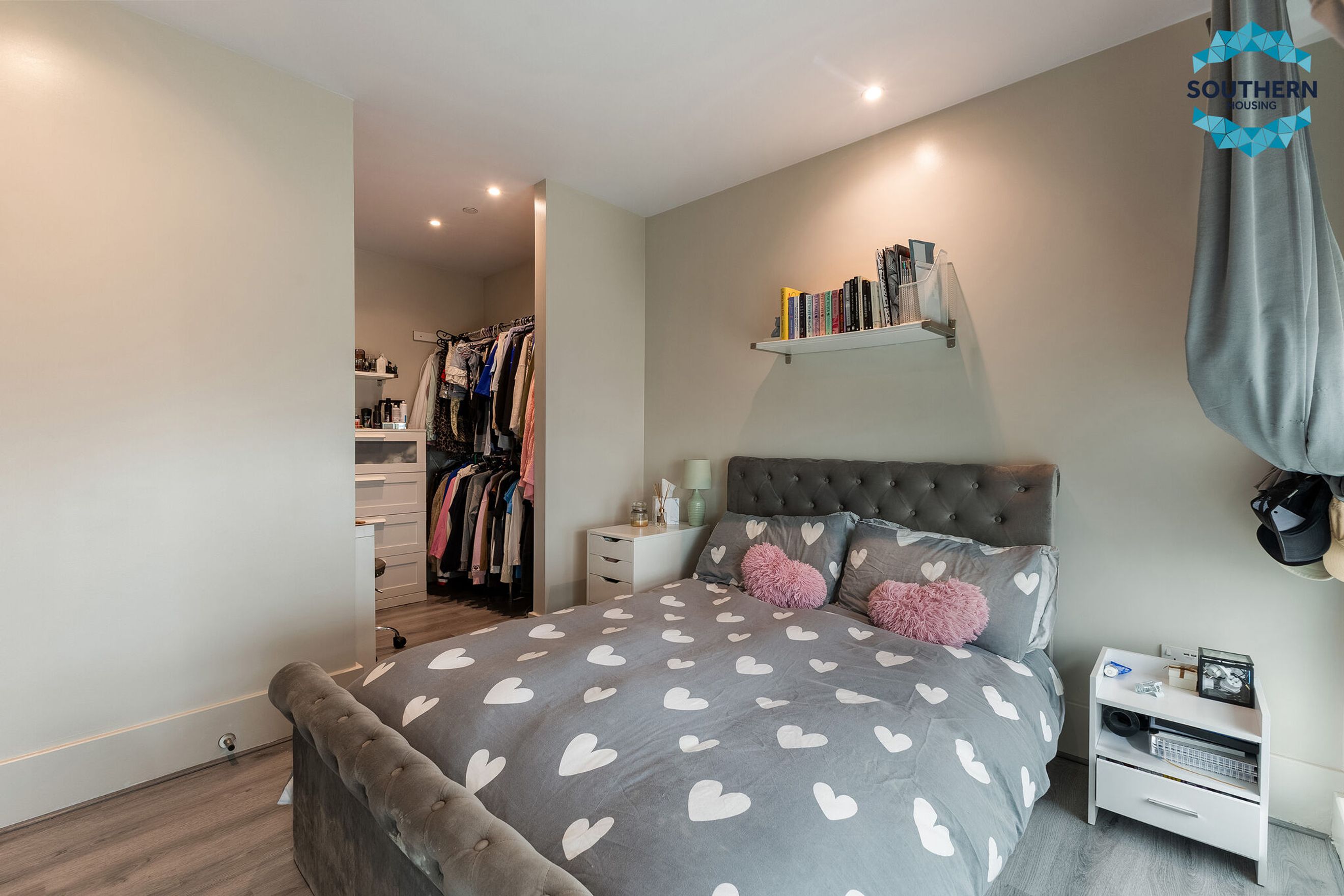 The double bedroom offers ample space for a large bed and benefits from an adjoining dressing room, adding a touch of luxury and functionality. Floor-to-ceiling windows throughout the apartment flood the space with natural light, while bespoke oak flooring and high-quality finishes enhance the premium feel.
