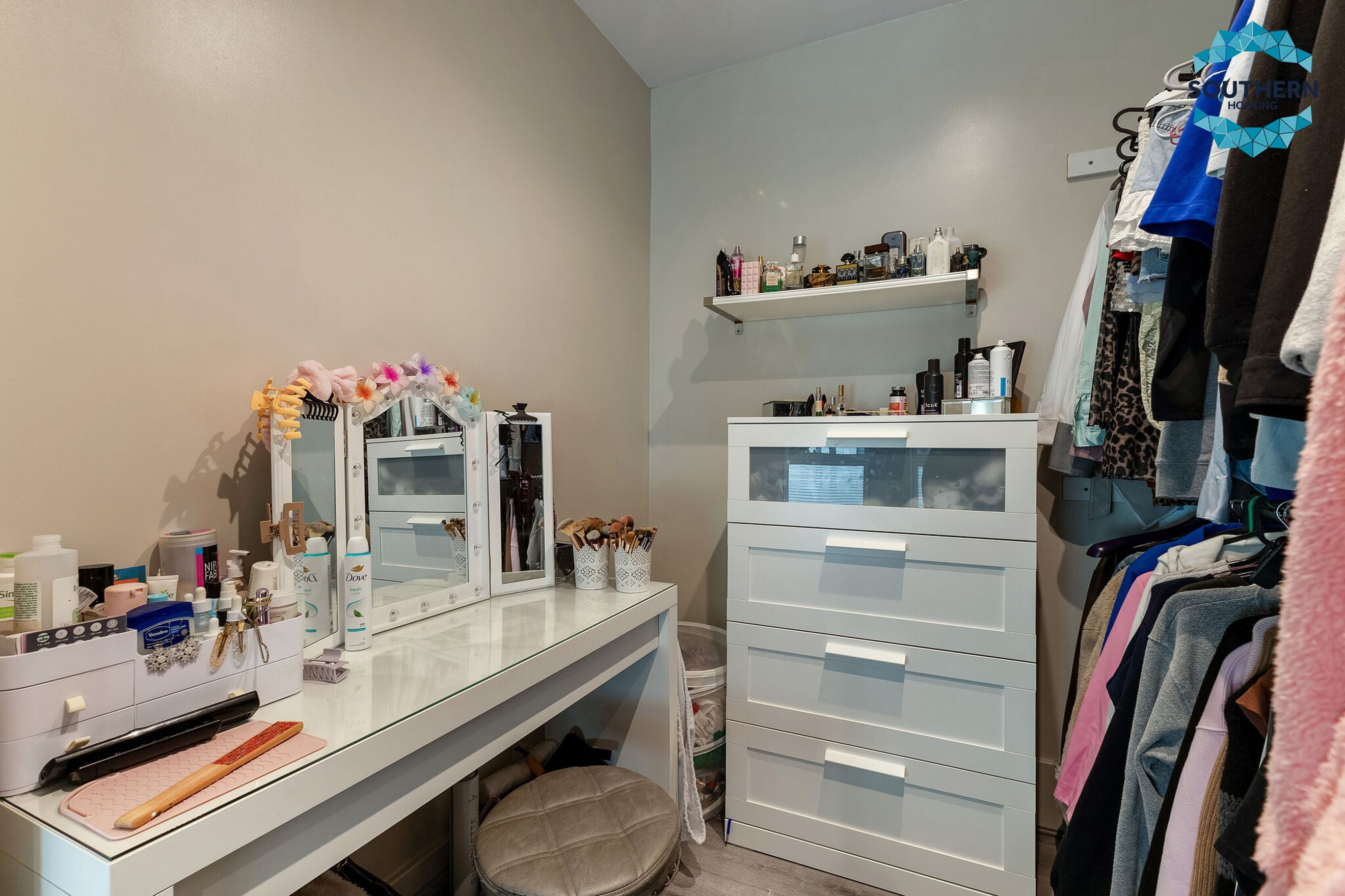 The open-plan layout ensures a seamless flow between the kitchen and living space, ideal for both relaxing and entertaining. A generous storage cupboard is located near the entrance, providing practical space for everyday essentials and helping to maximise the usable floor area.