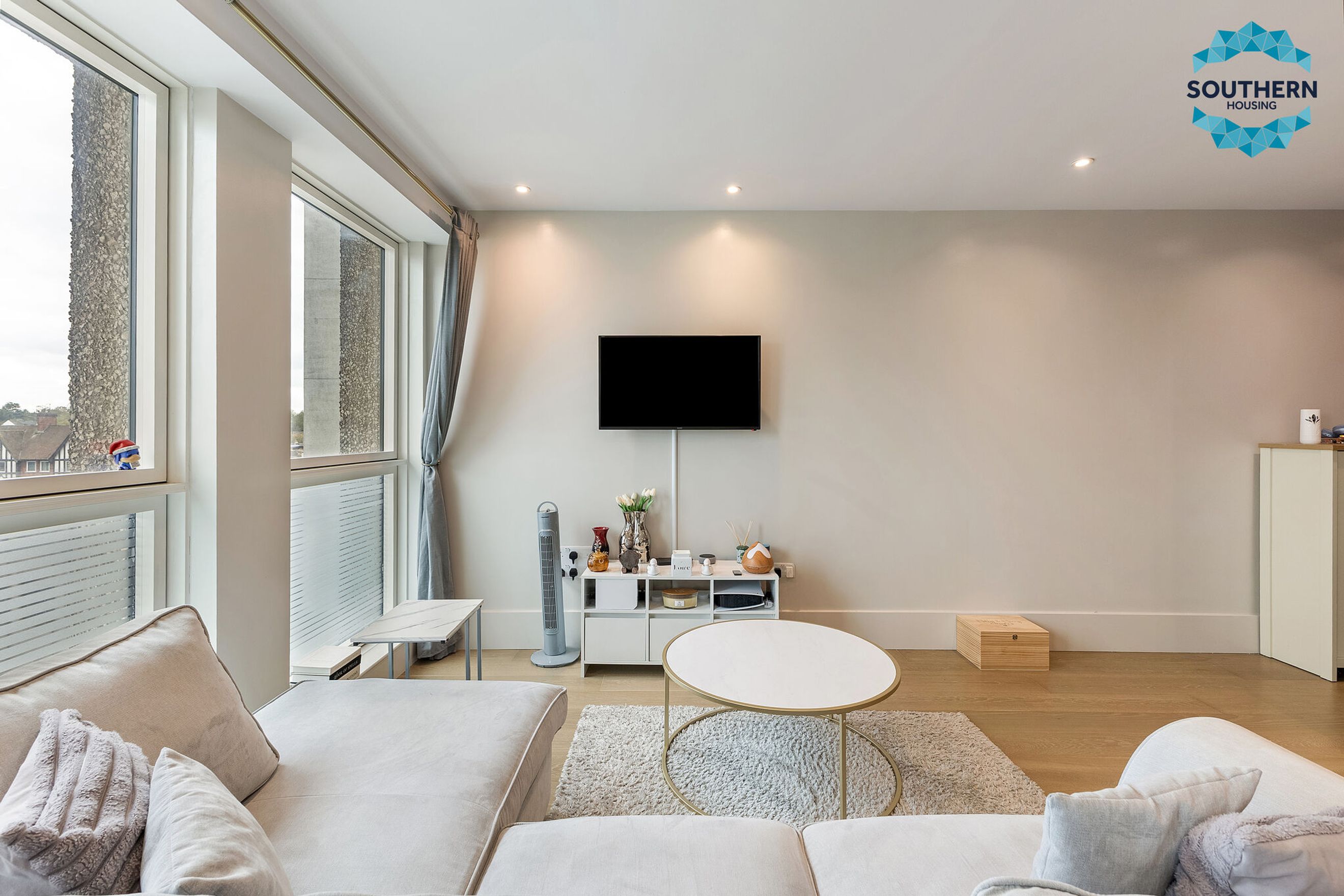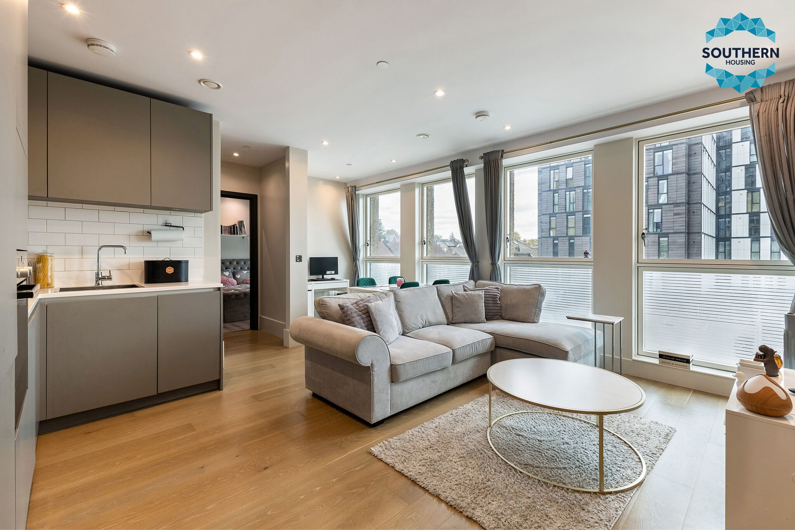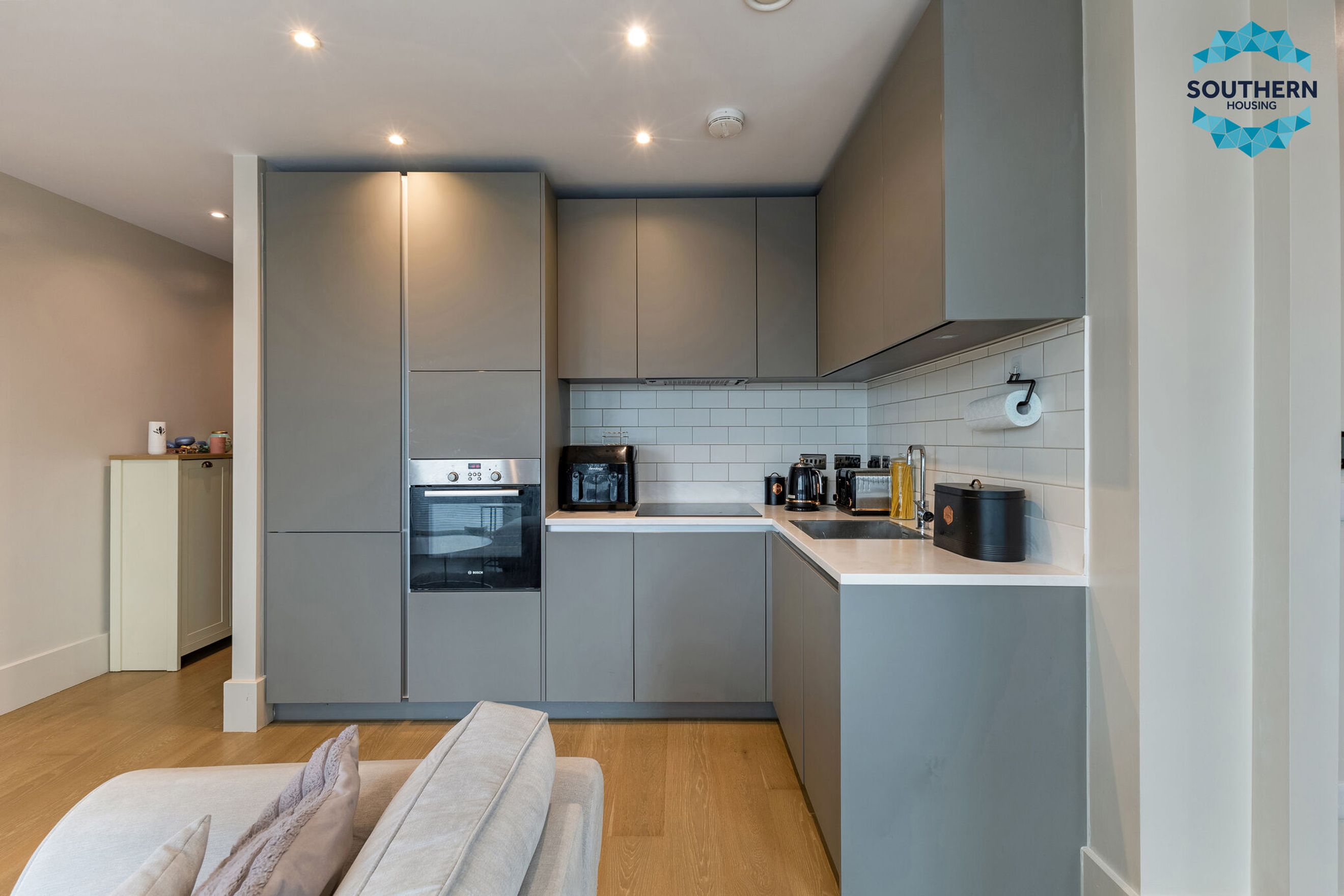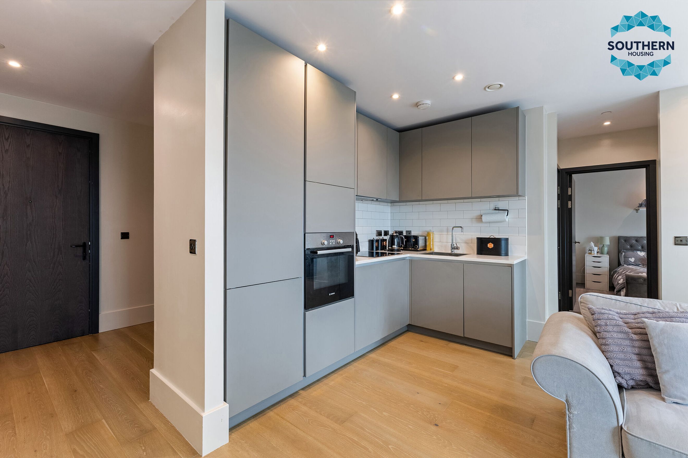 This stylish and contemporary apartment boasts a bright, south-facing aspect and a spacious open-plan kitchen and living area. The kitchen is well-equipped with ample cupboard space and integrated appliances, including an oven, hob, extractor fan, and fridge/freezer—perfect for modern, convenient living.