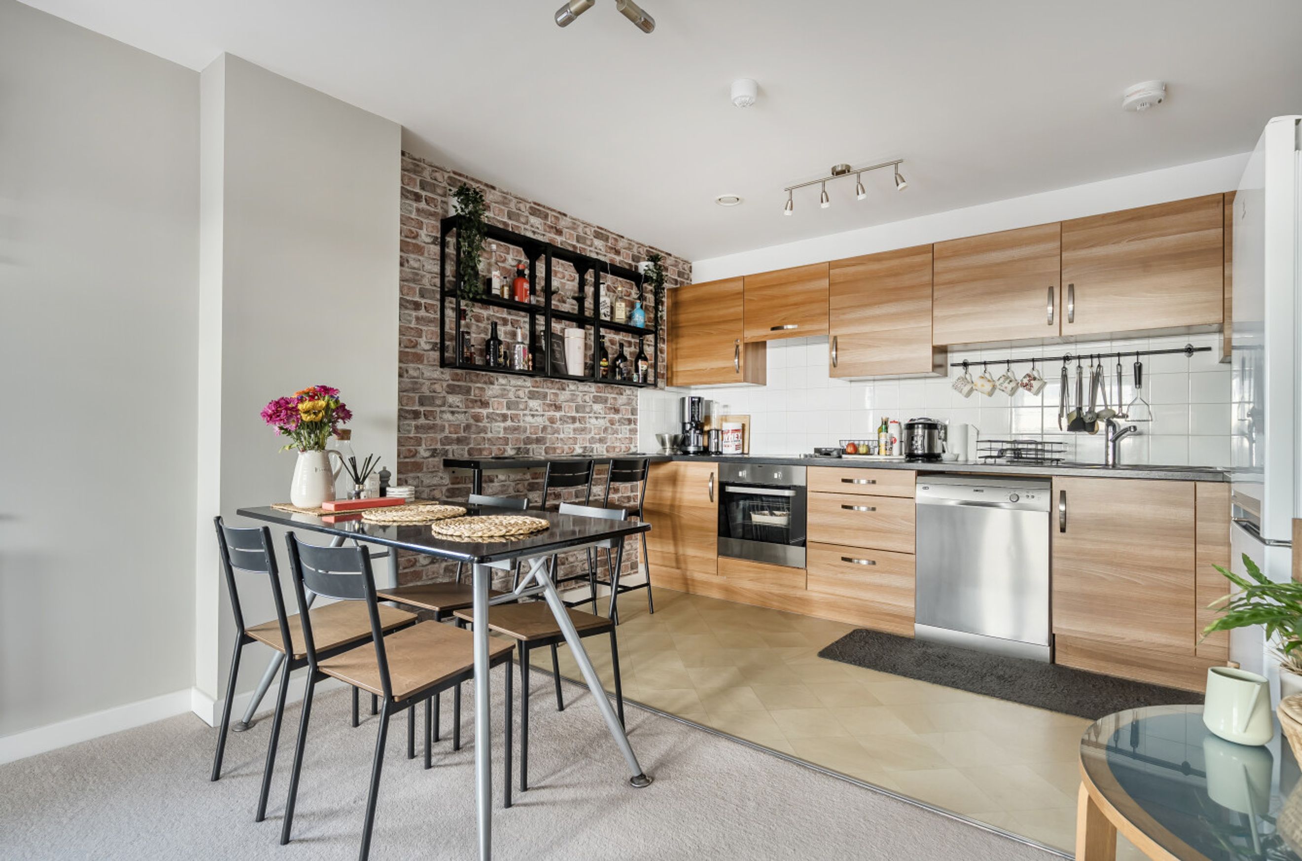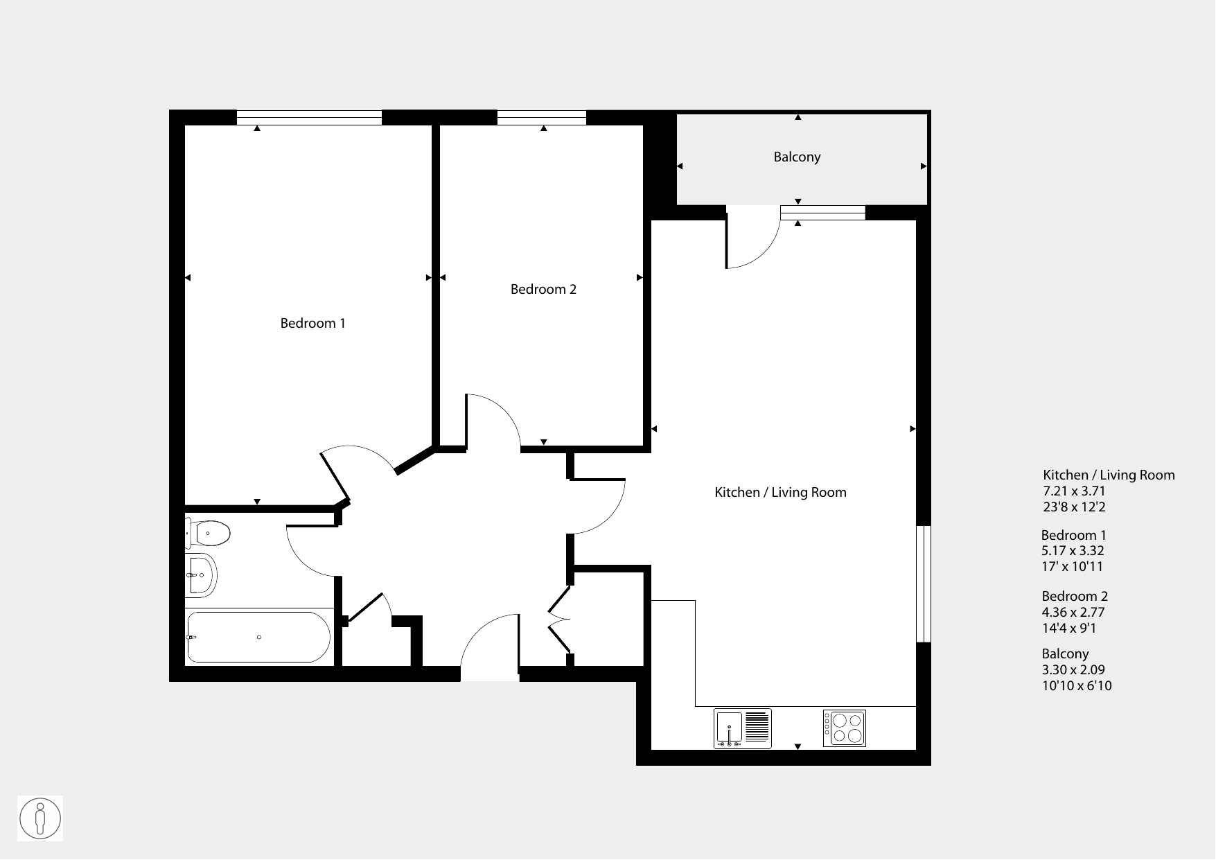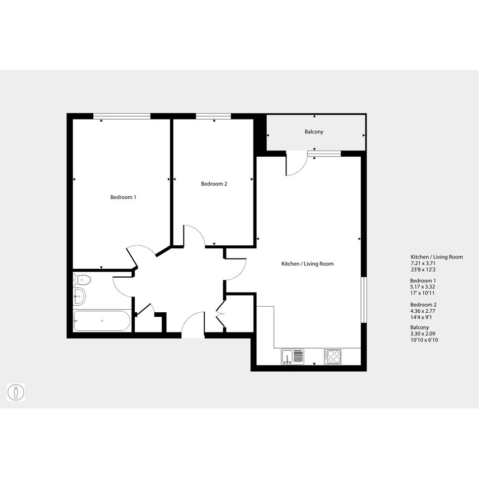 Featuring an open-plan living area with doors to your balcony. The kitchen has an integrated oven, hob and hood. There are two comfortable double bedrooms. The bathroom has a modern, white suite.