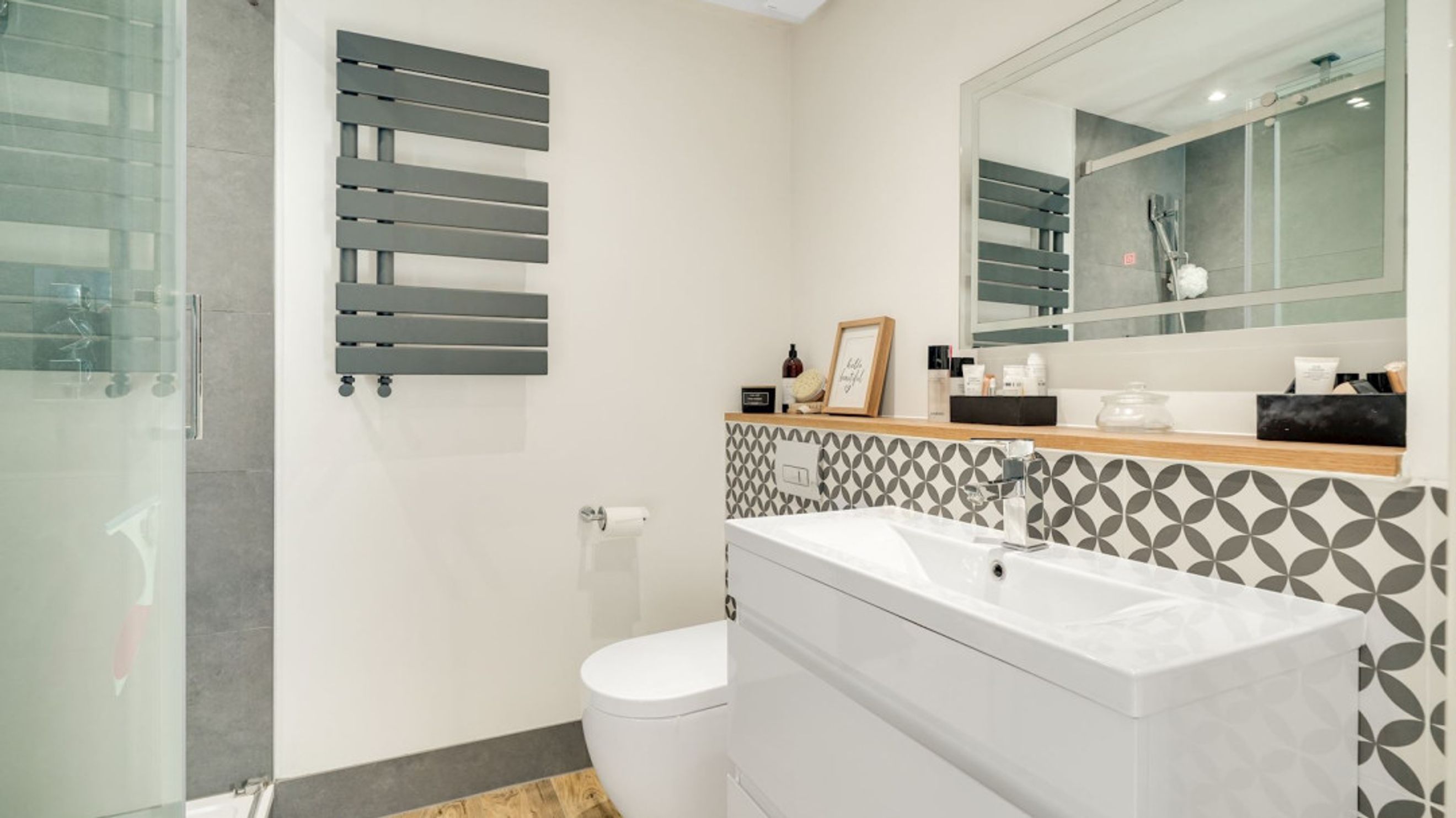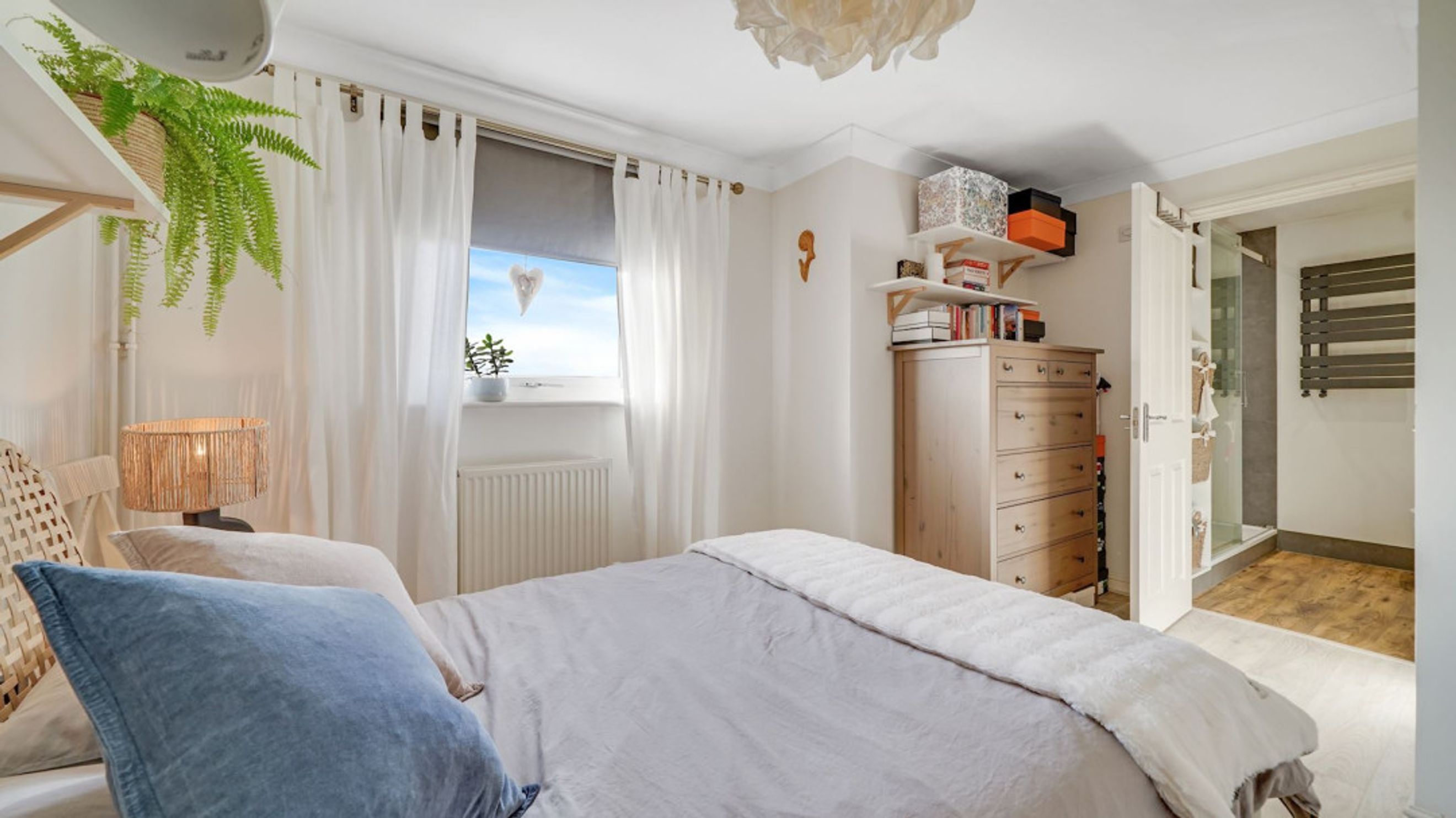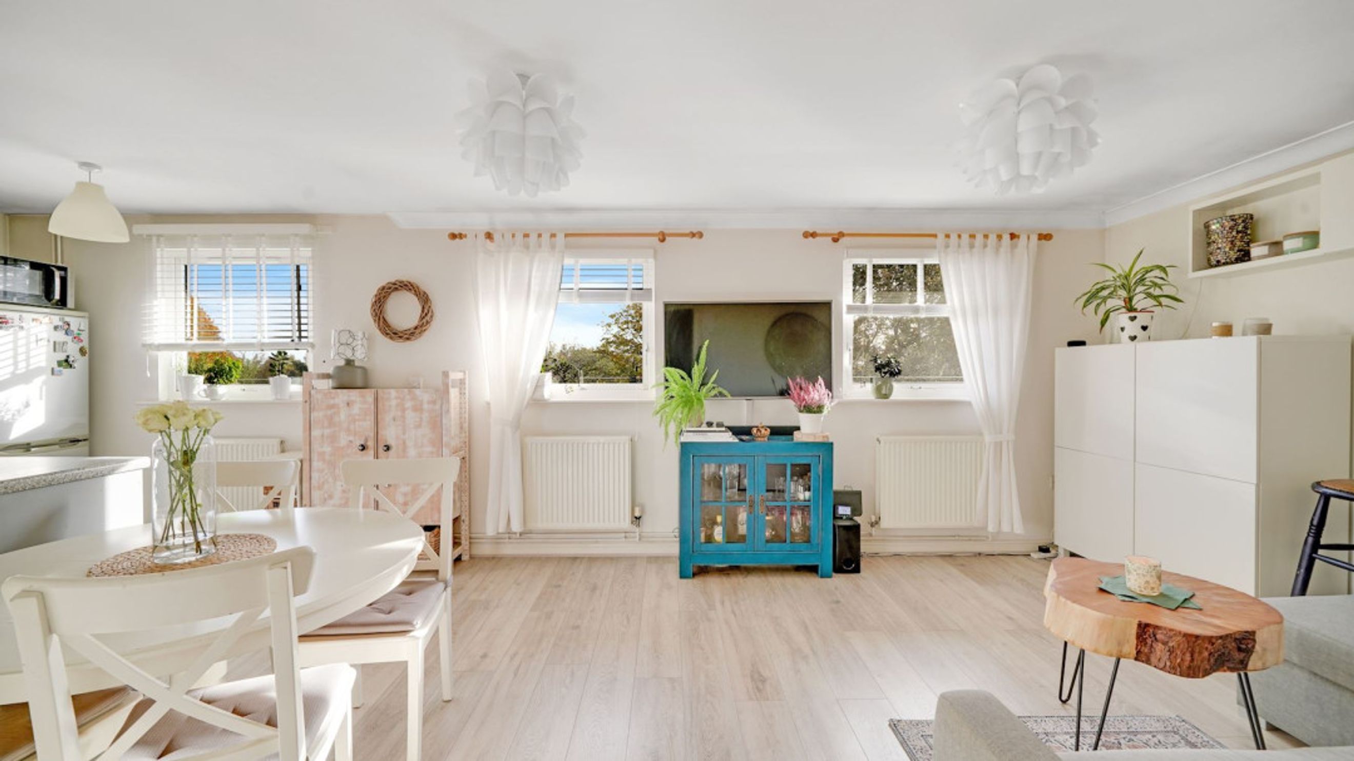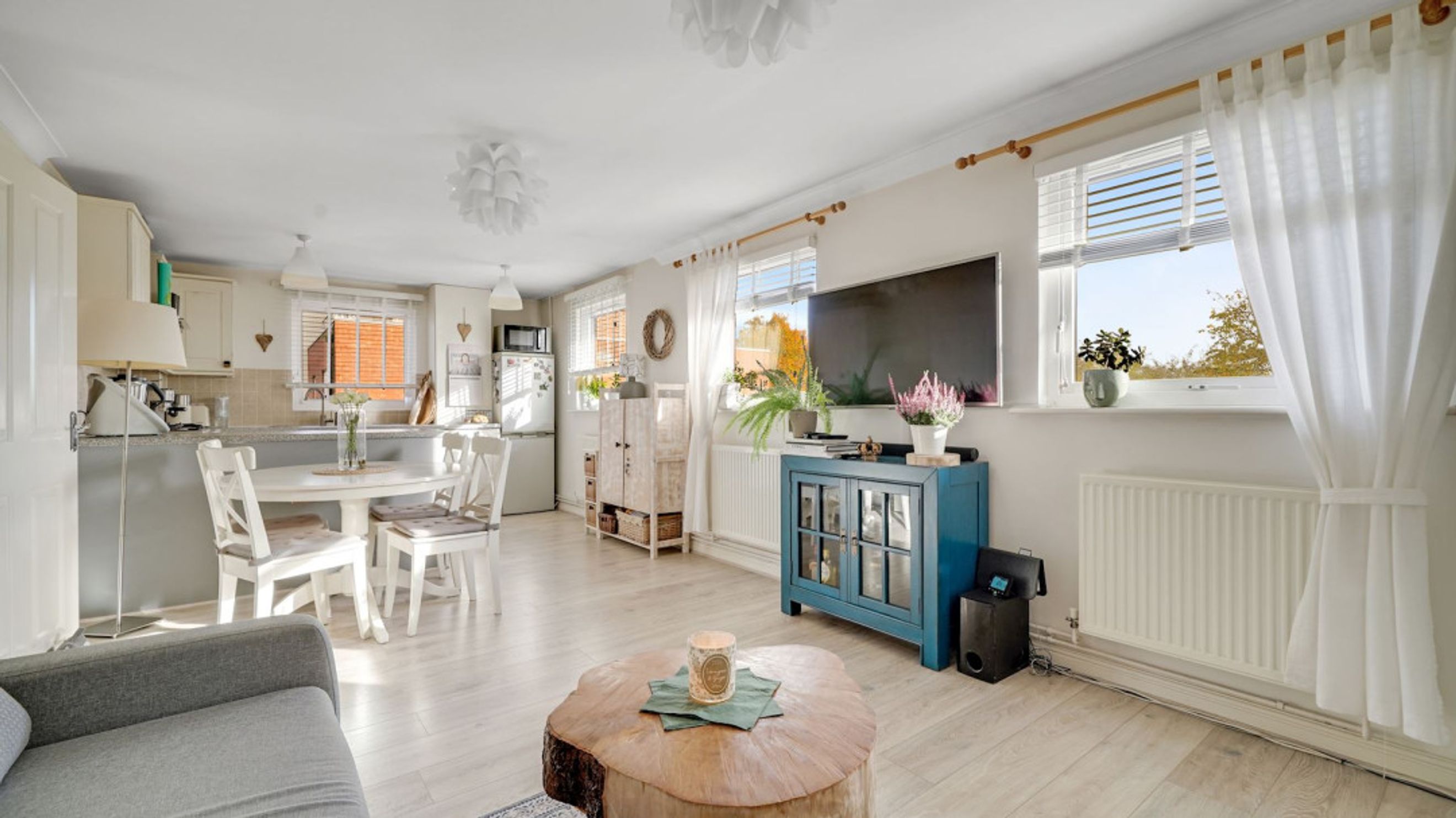 The property offers approximately 65 sqm of internal space, featuring a bright open-plan living and dining area with a contemporary fitted kitchen and integrated appliances. The principal bedroom benefits from an en-suite shower room, while the second double bedroom is served by a modern family bathroom.