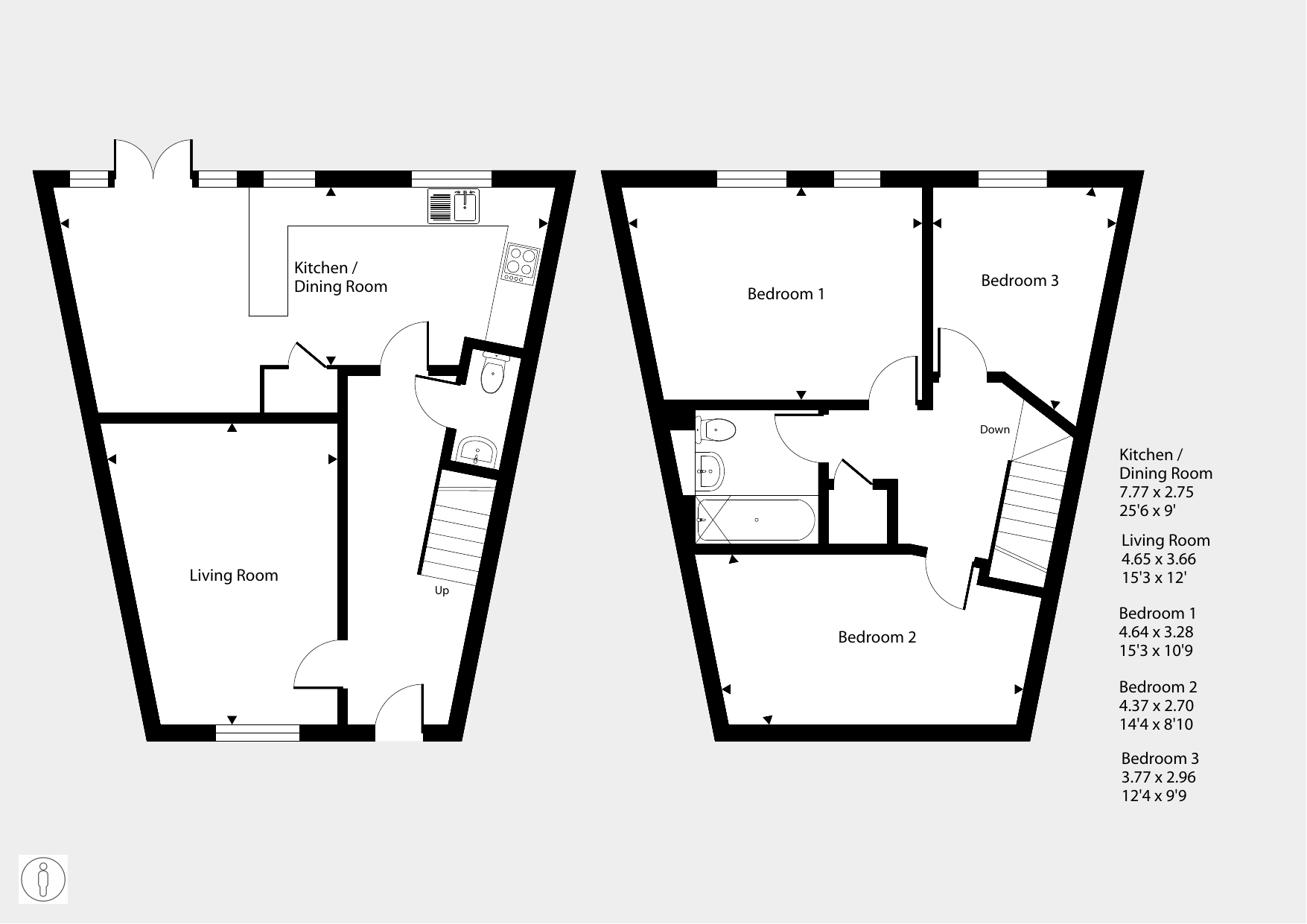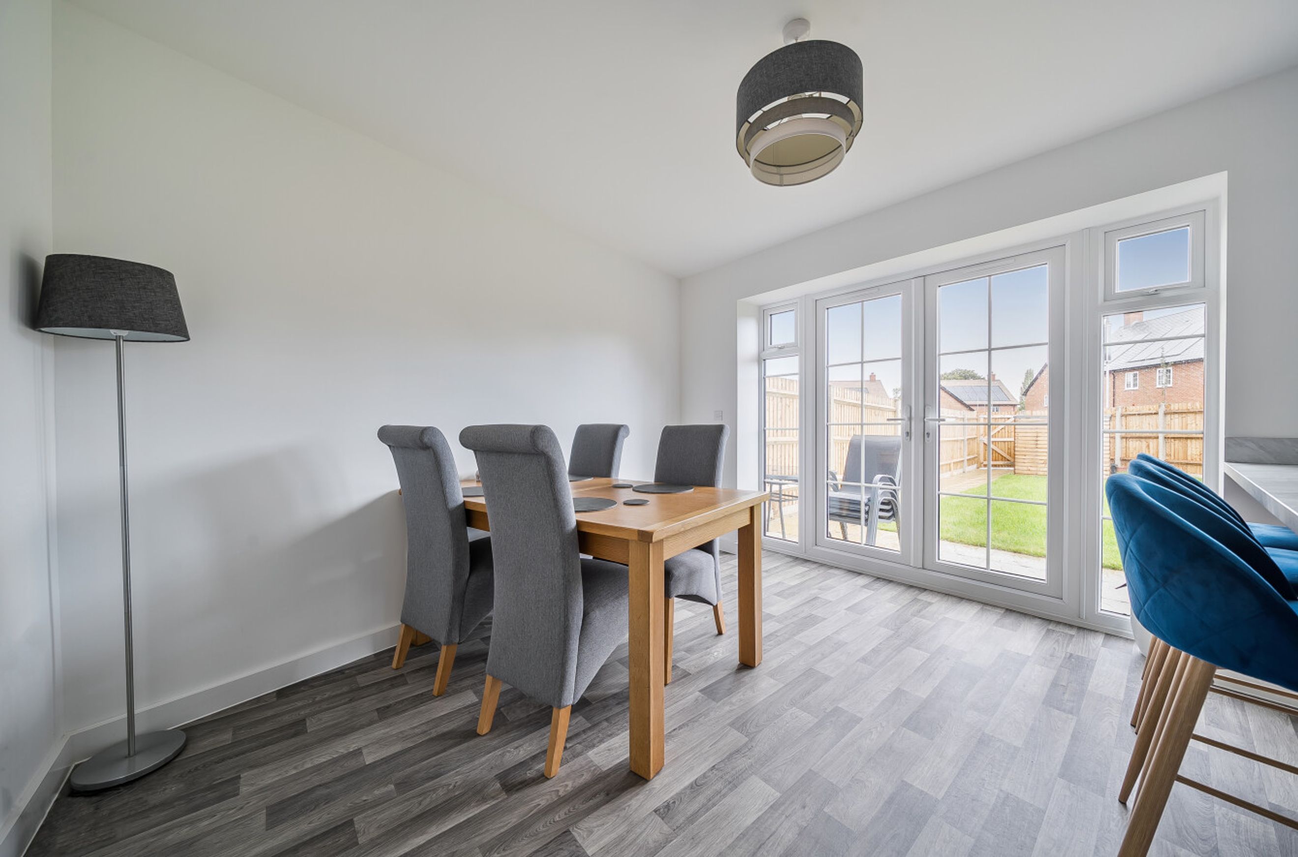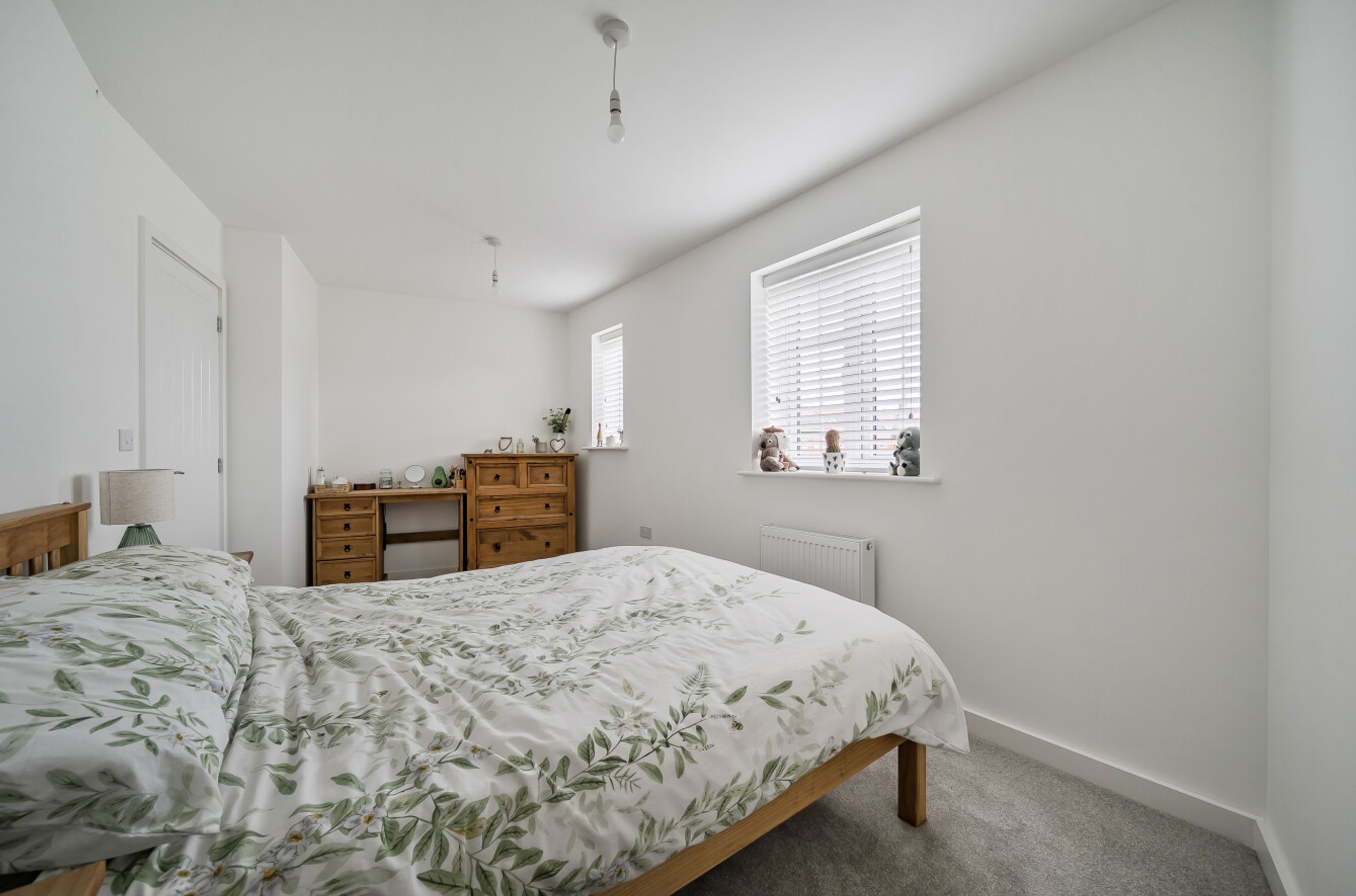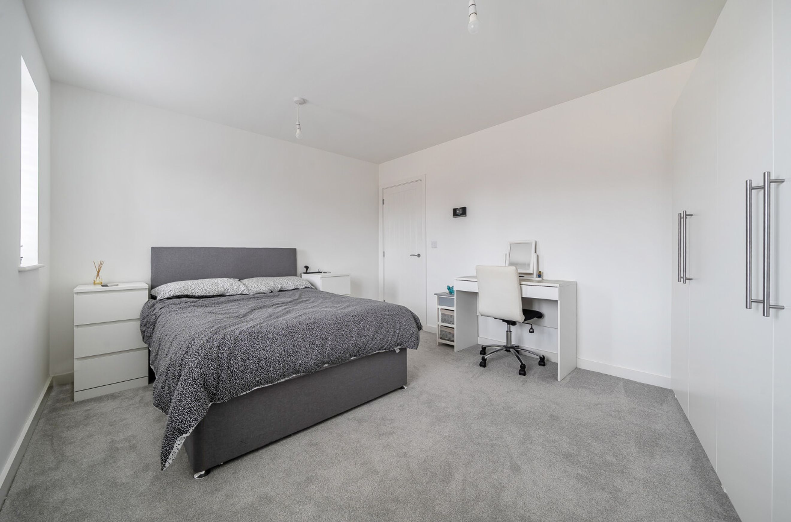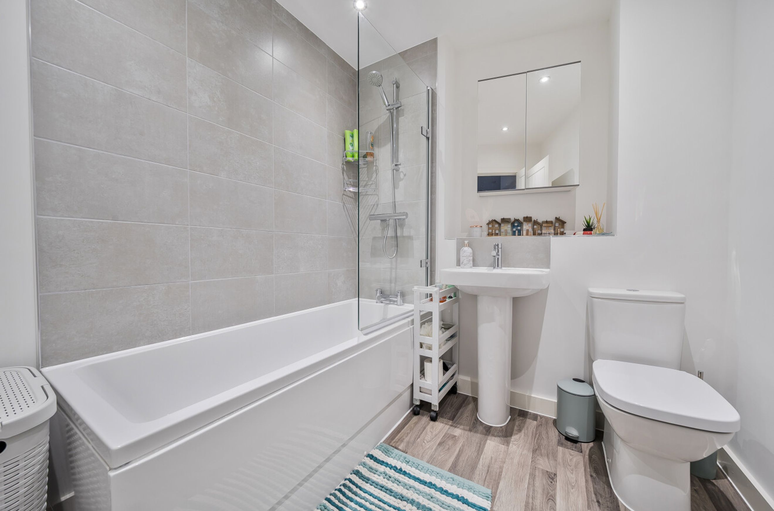 Upstairs, there are three comfortable bedrooms. The bathroom has a modern, white suite.