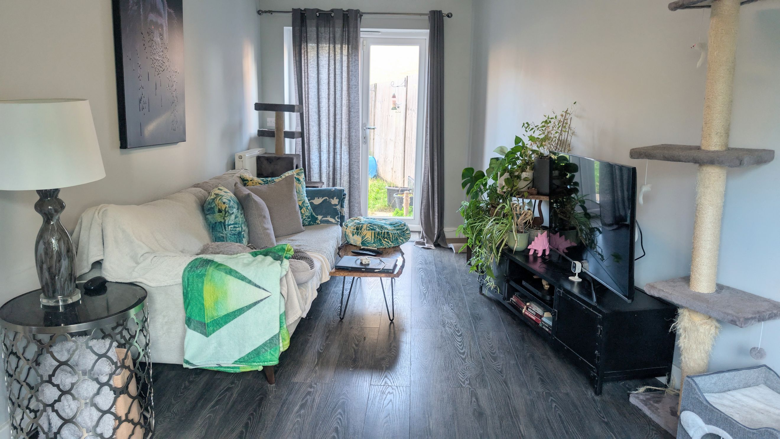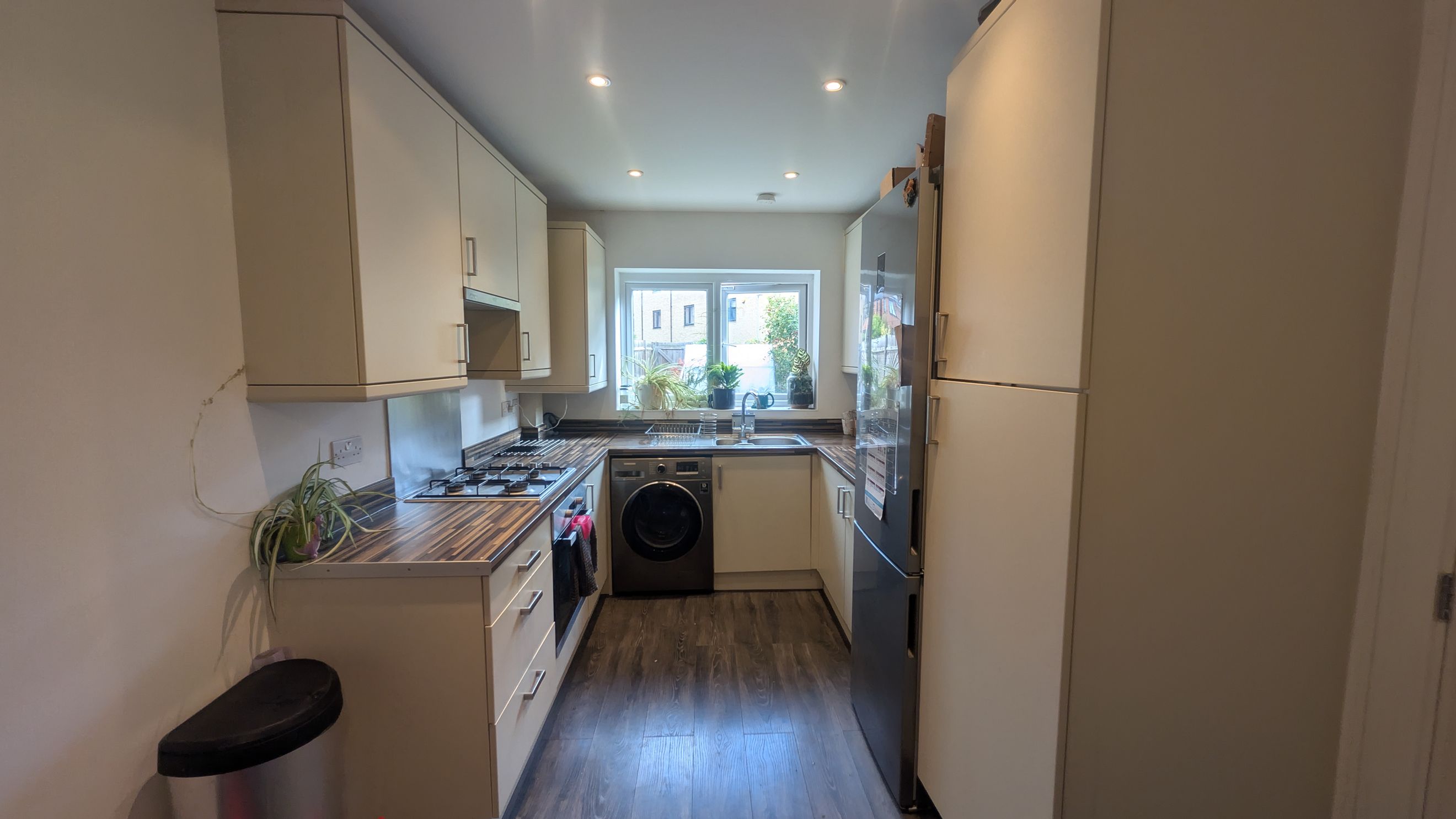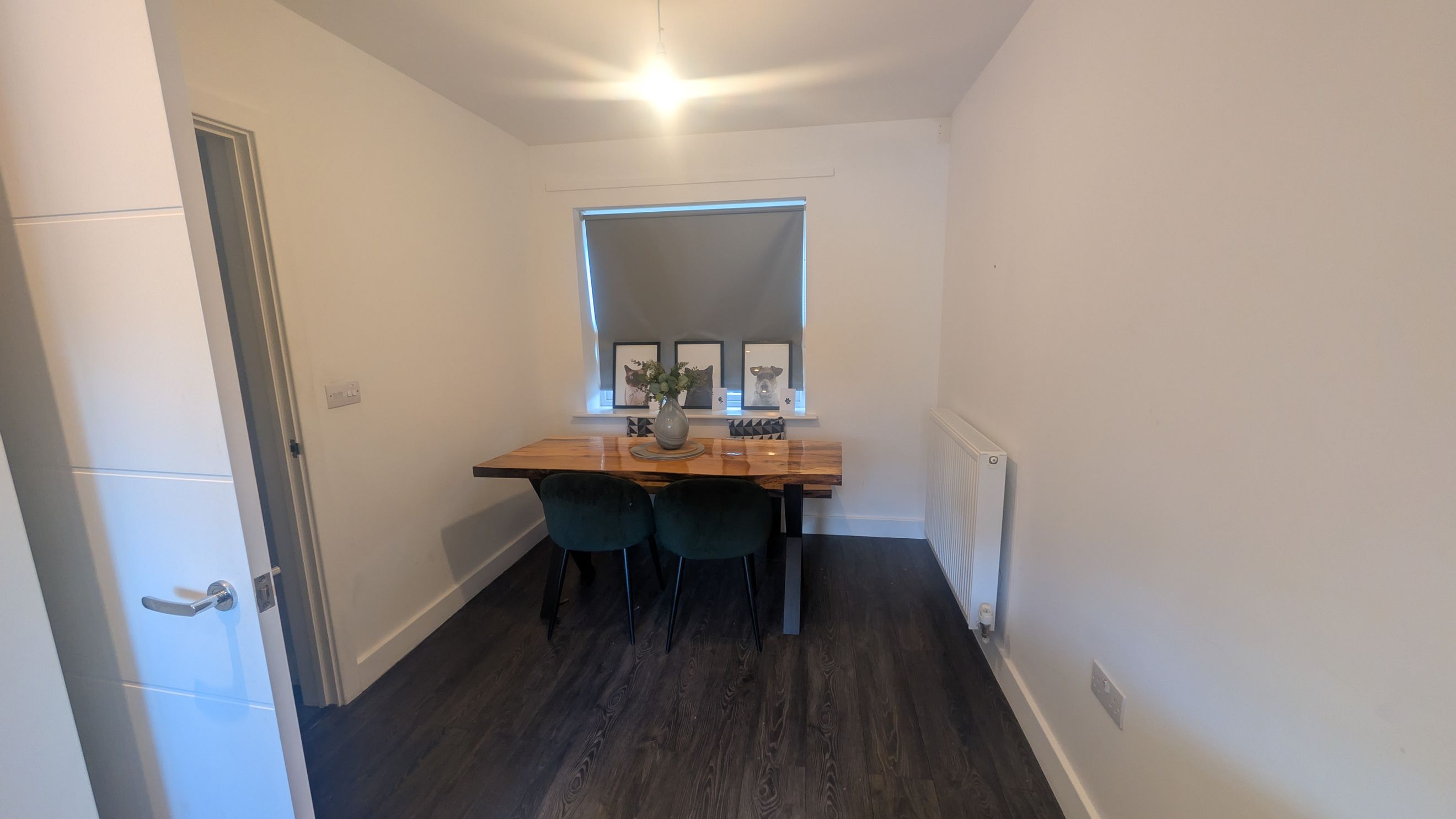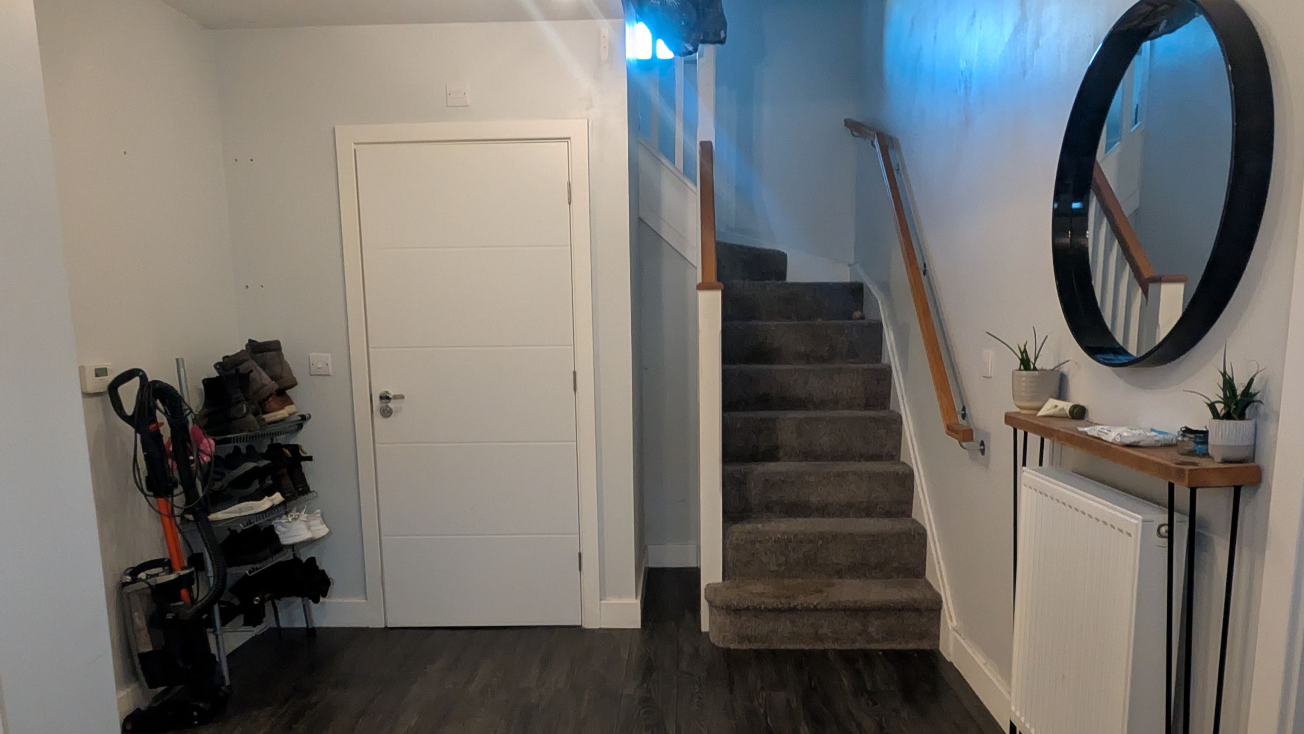 Large entryway with downstairs bathroom and storage cupboard. The kitchen and dining room are open plan. The living room opens out to the garden.