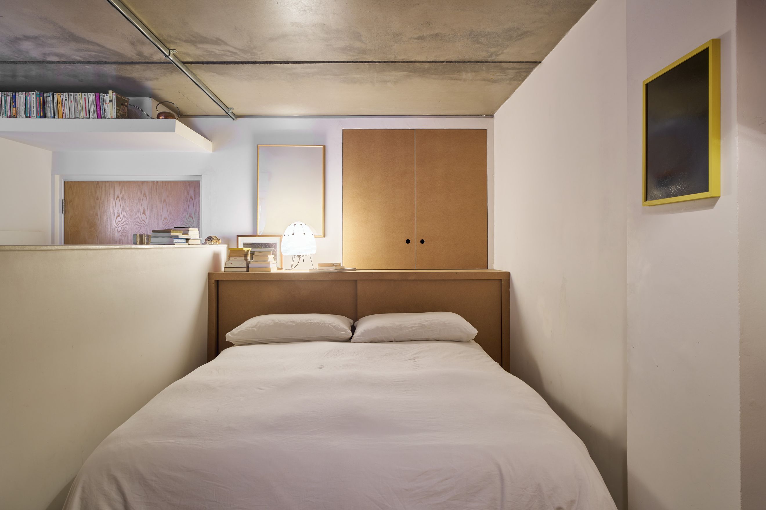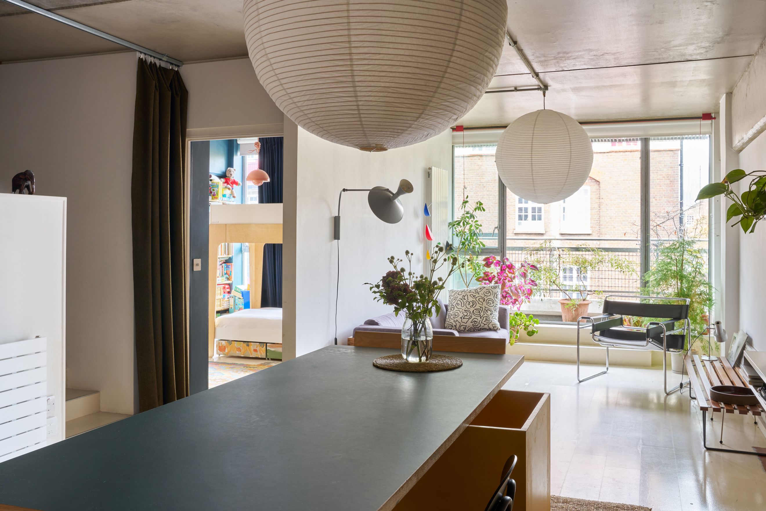 The front door opens into a central hallway that leads to a bright, open-plan living and dining area, featuring original concrete ceilings and exposed pillars. Floor-to-ceiling windows along the rear elevation flood the space with natural light and open onto a private balcony. A slightly raised nook off the main living area creates a flexible zone, ideal for a study or an occasional guest space. The bedroom also benefits from floor-to-ceiling glazing and built-in wardrobes for ample storage.