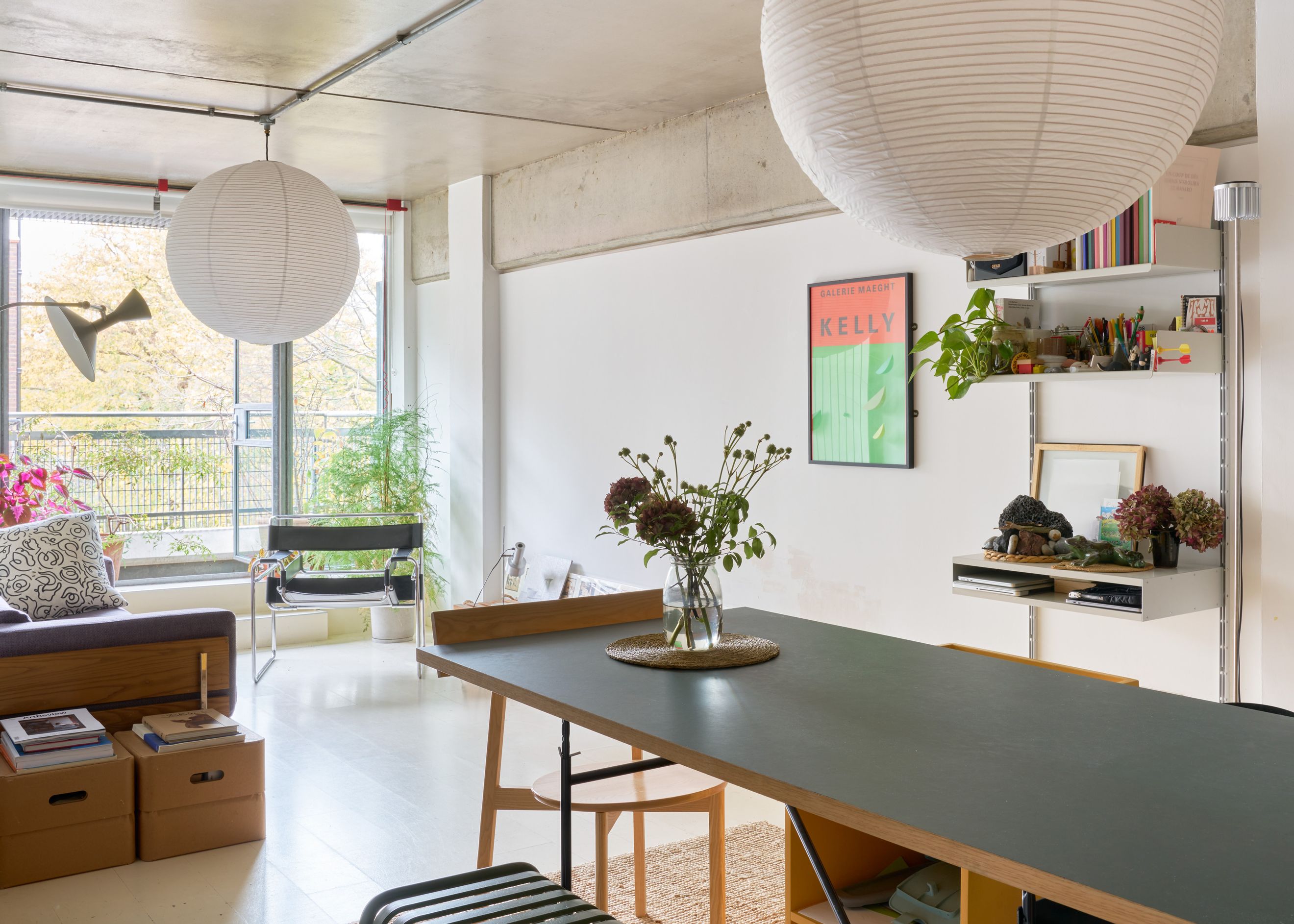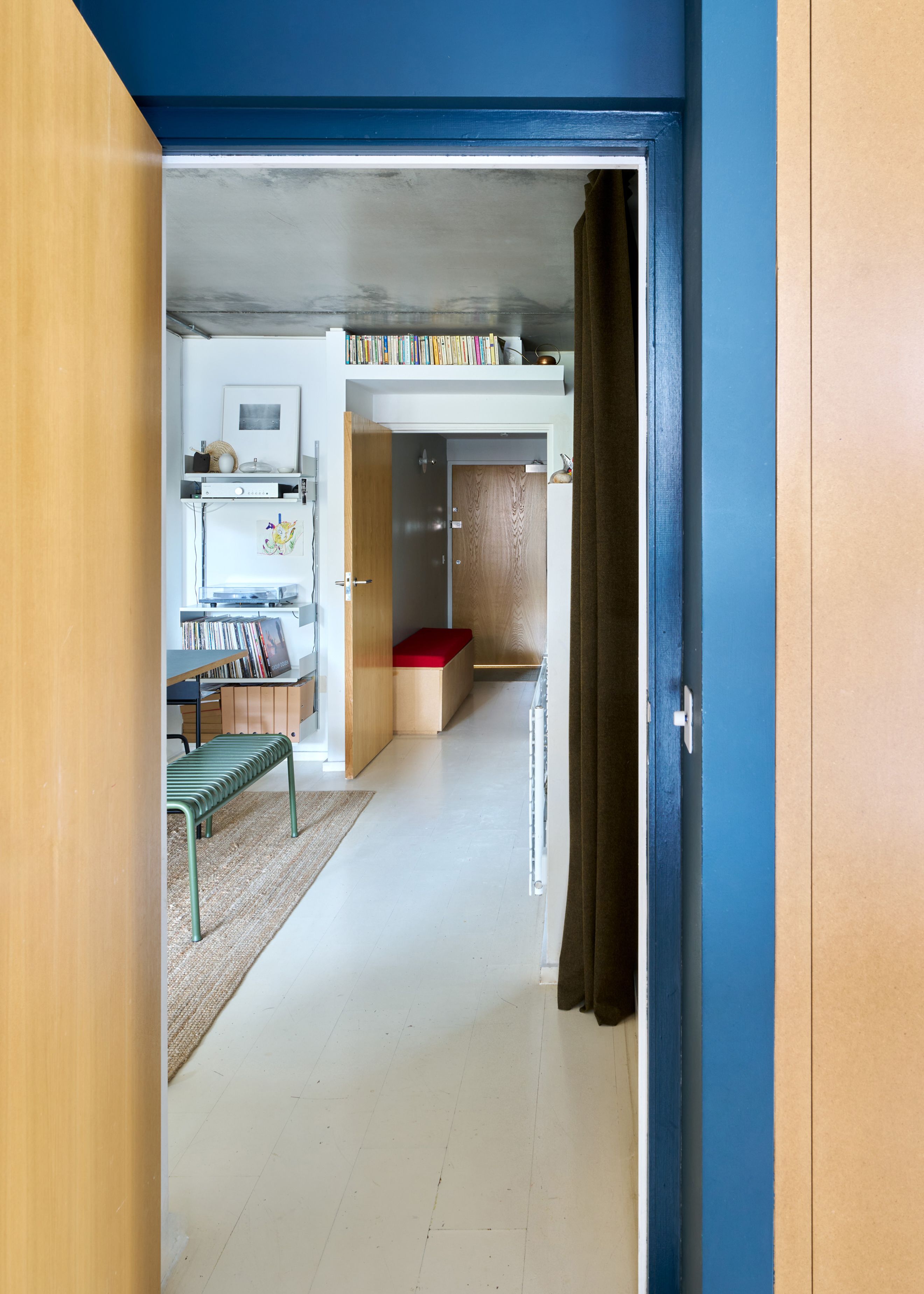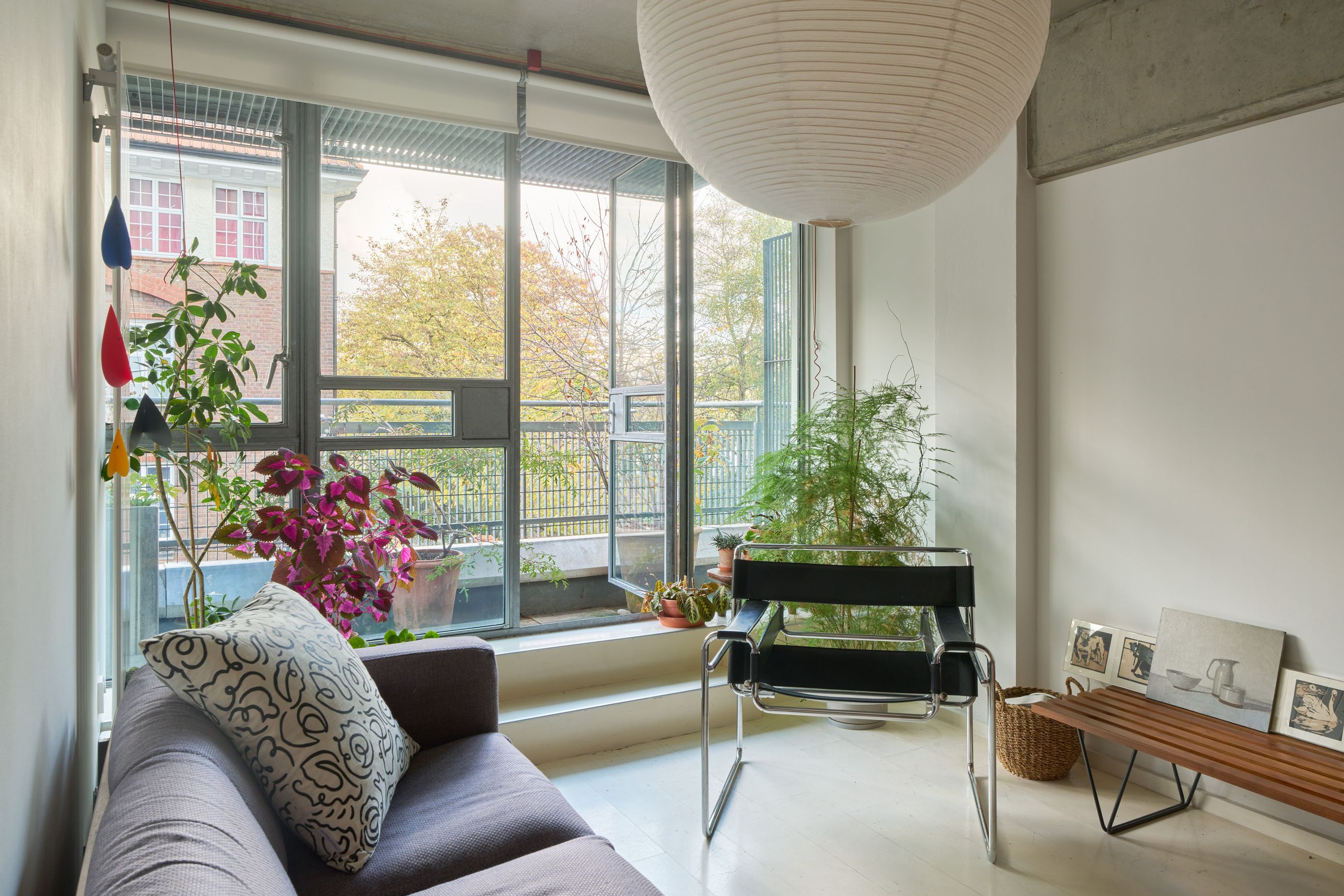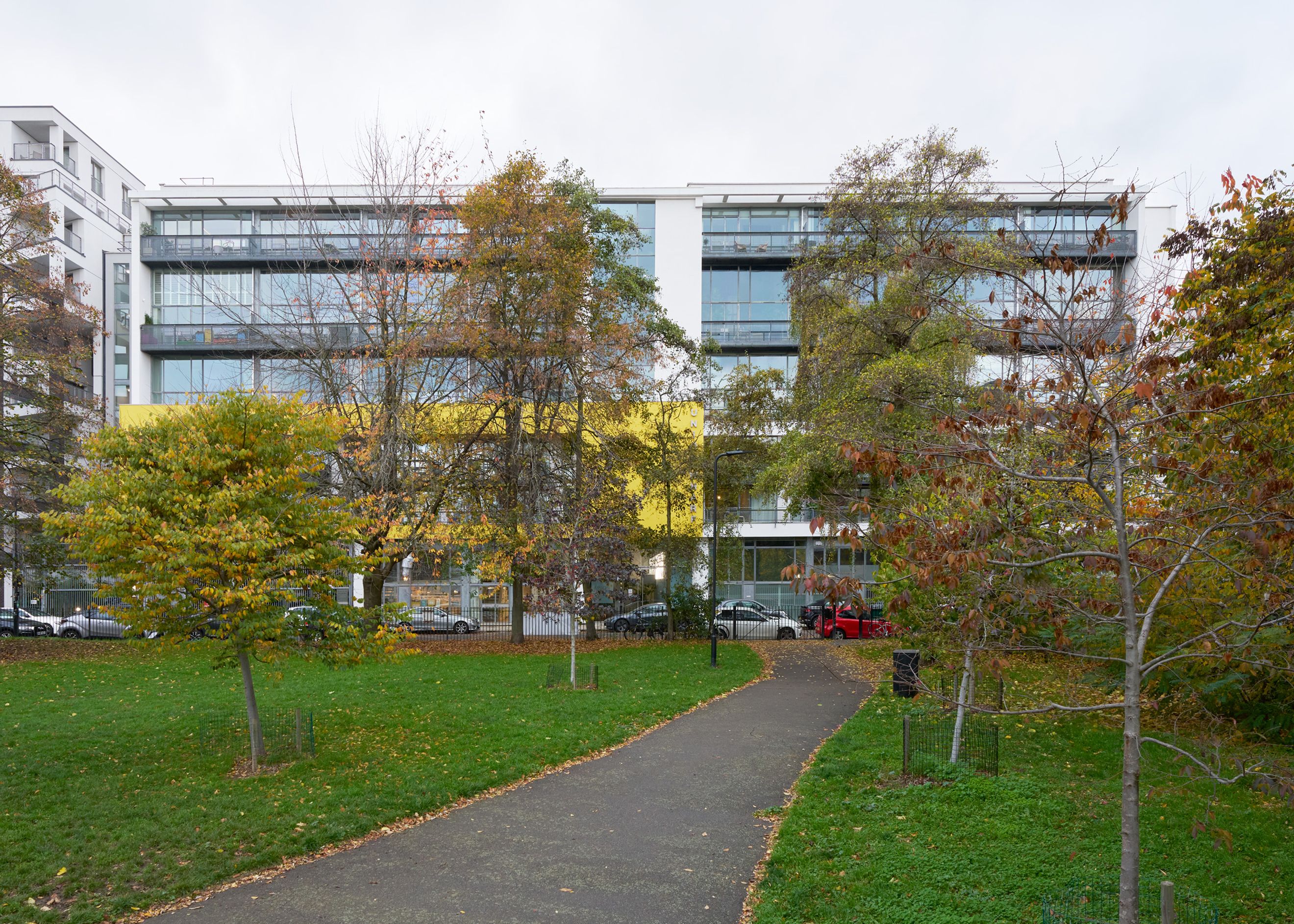 Situated on a quiet, no-through road leading to Regent’s Canal, the building stands at the western edge of Shepherdess Walk Park. Its steel-framed façade and expansive glazing give it a crisp, modern profile. A voluminous entrance lobby with concierge service provides stair and lift access to the apartment on the first floor.