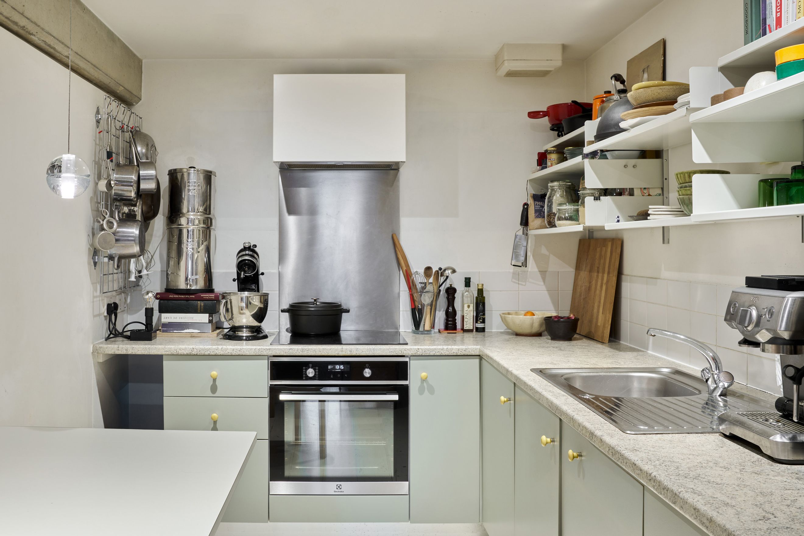 A spacious kitchen occupies one end of the plan, with integrated appliances, plenty of shelving, and a dishwasher.