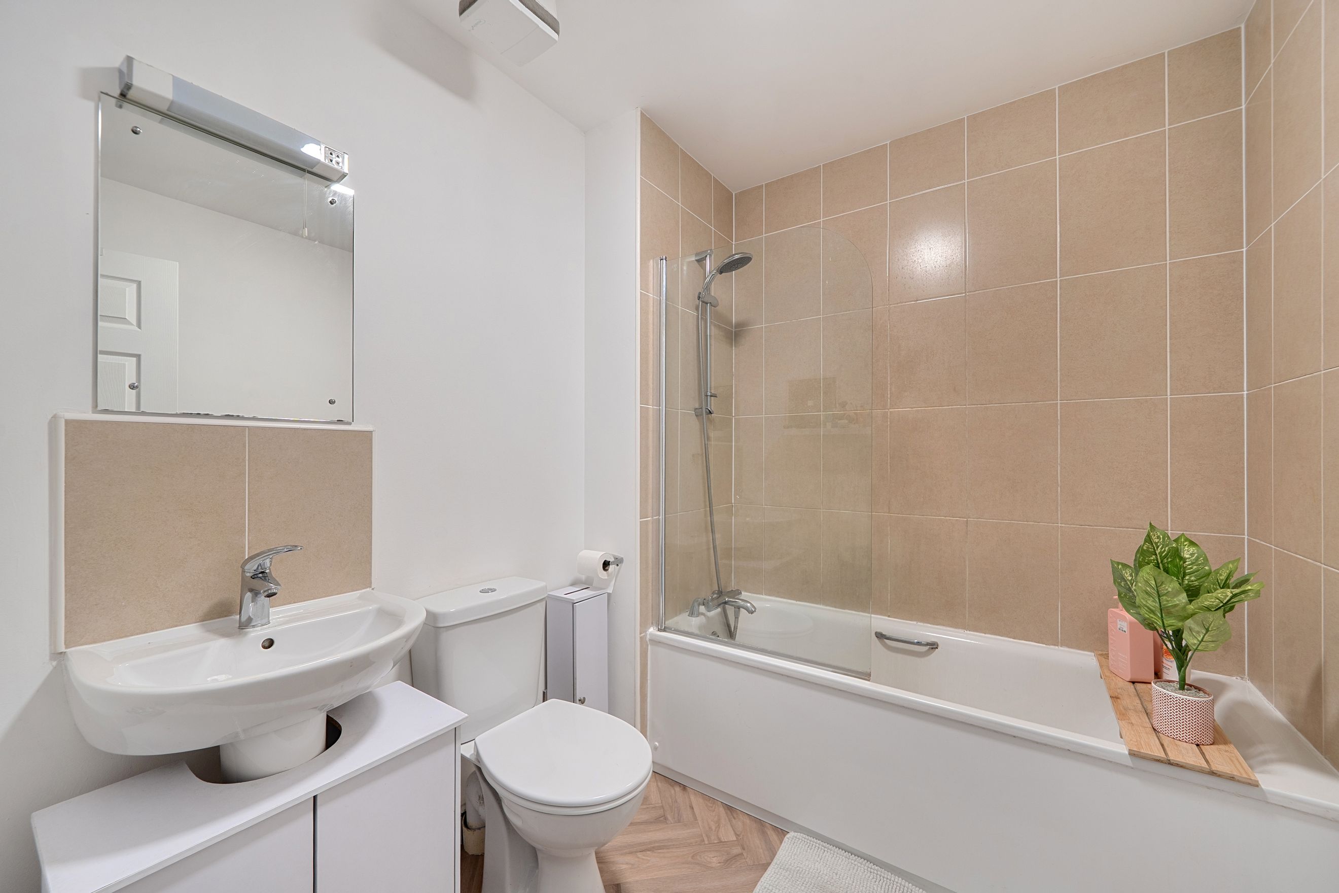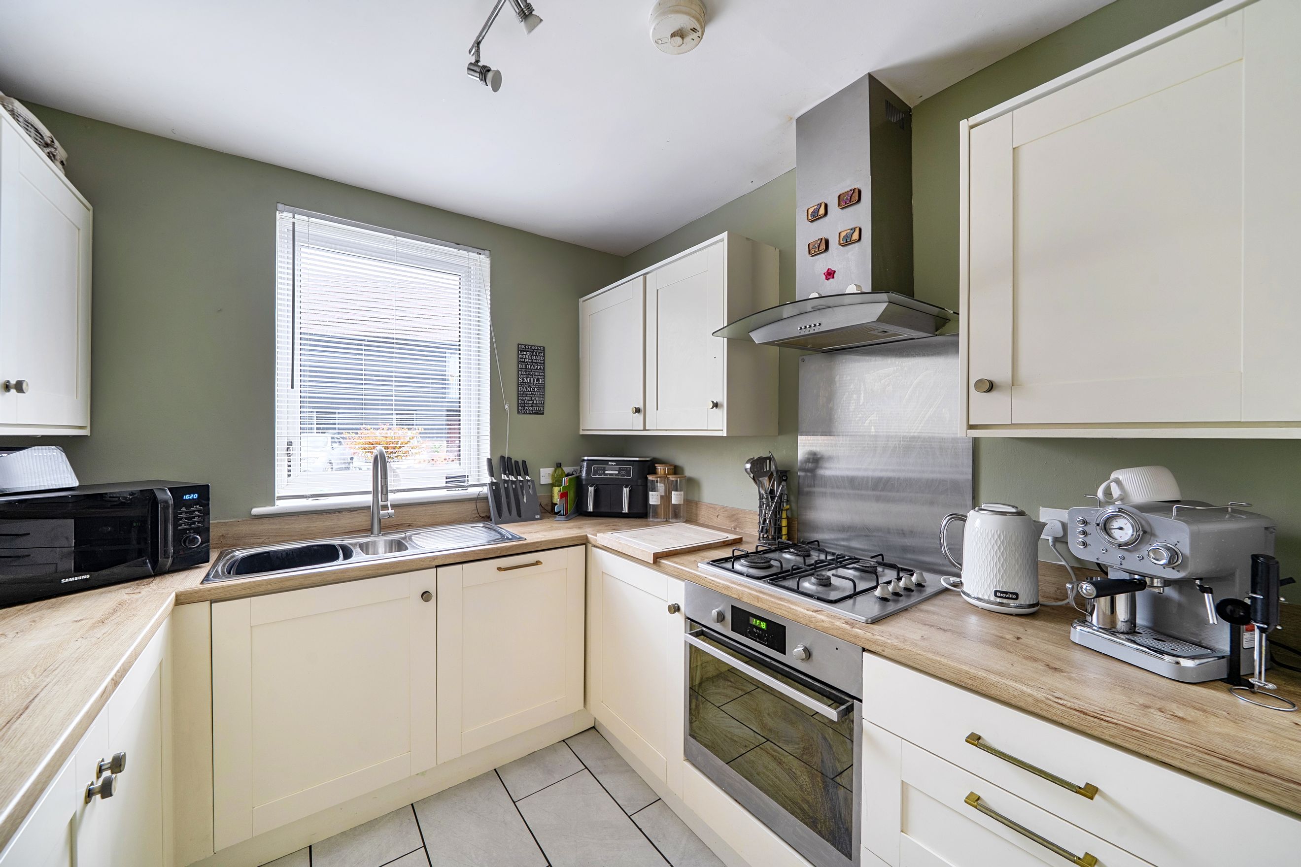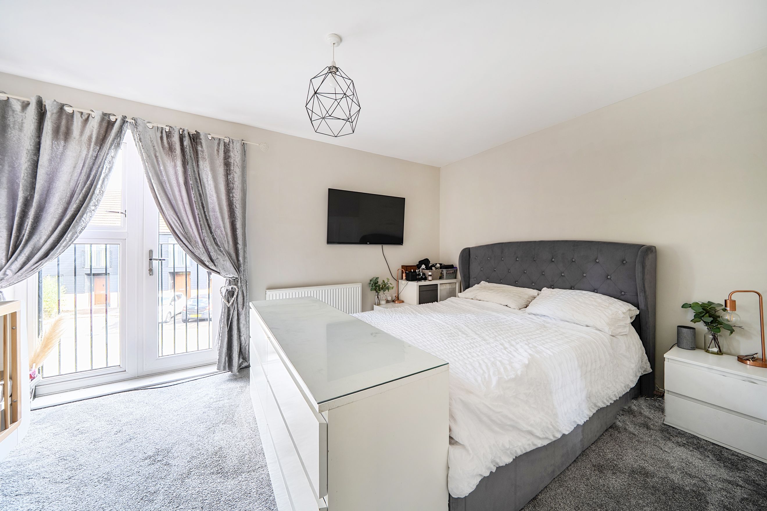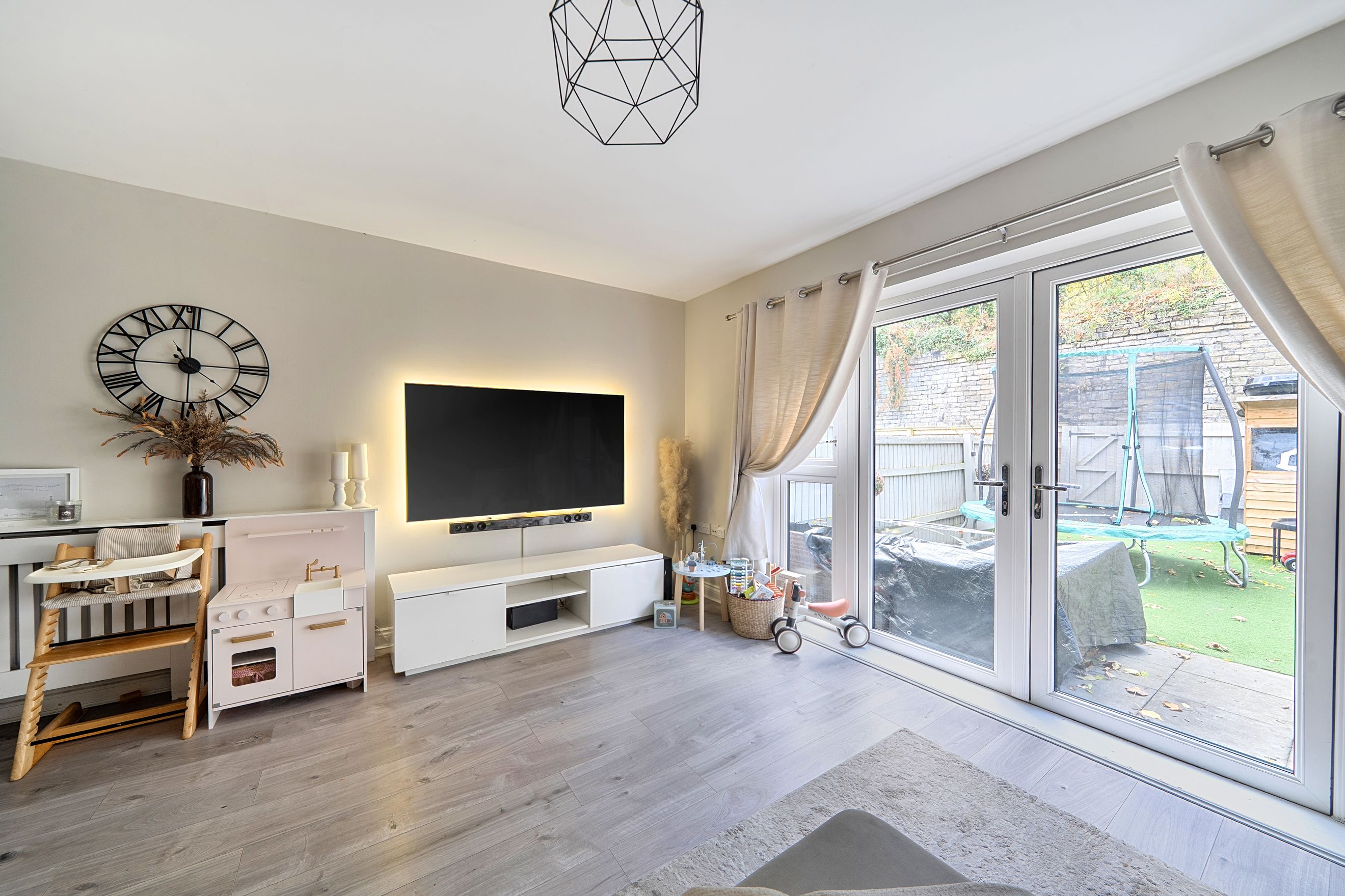 Upstairs, there are three comfortable bedrooms, with a Juliette balcony to the master. The bathroom has a modern, white suite. You'll also have two parking spaces and a back garden.