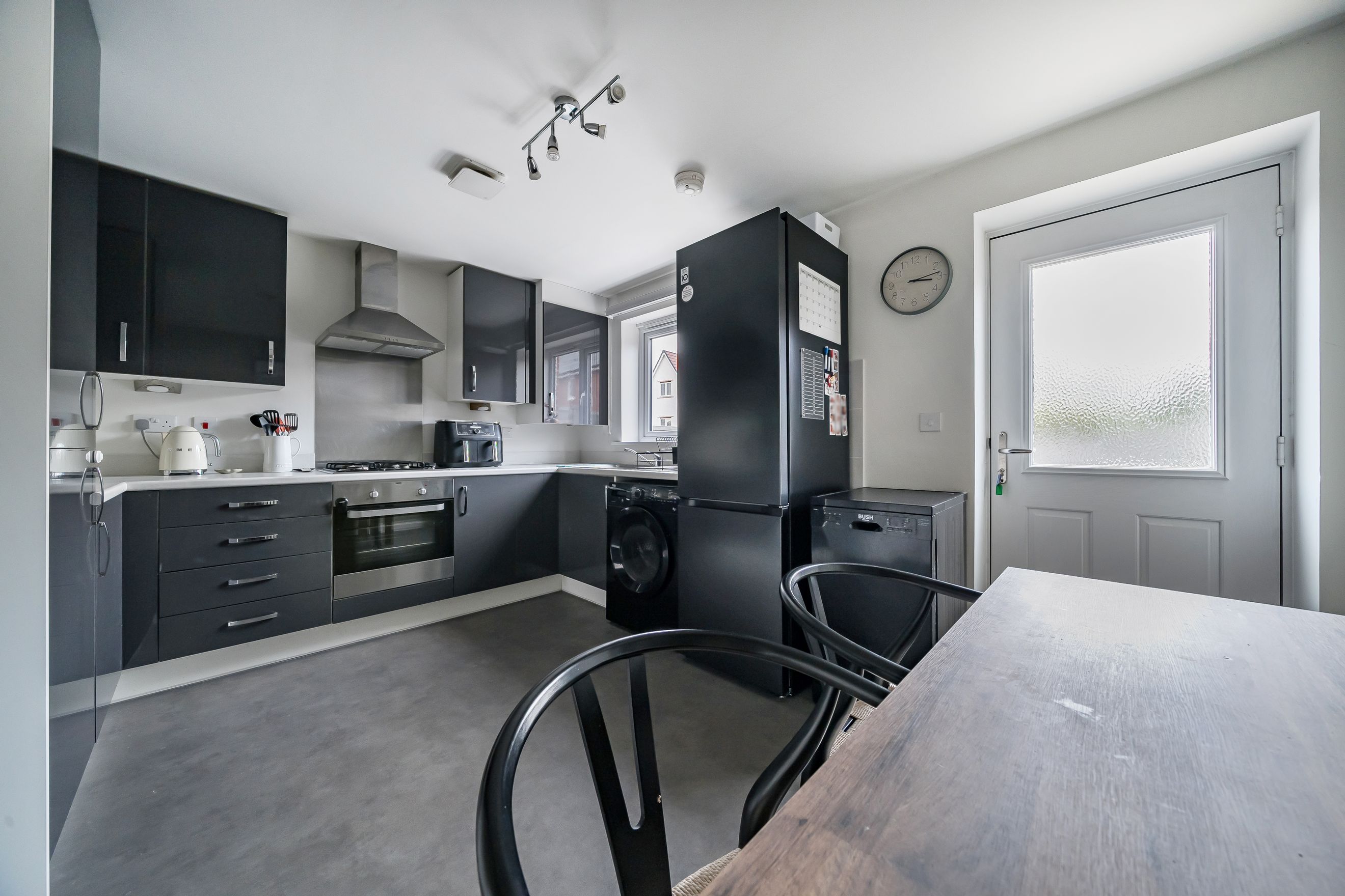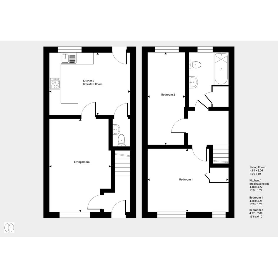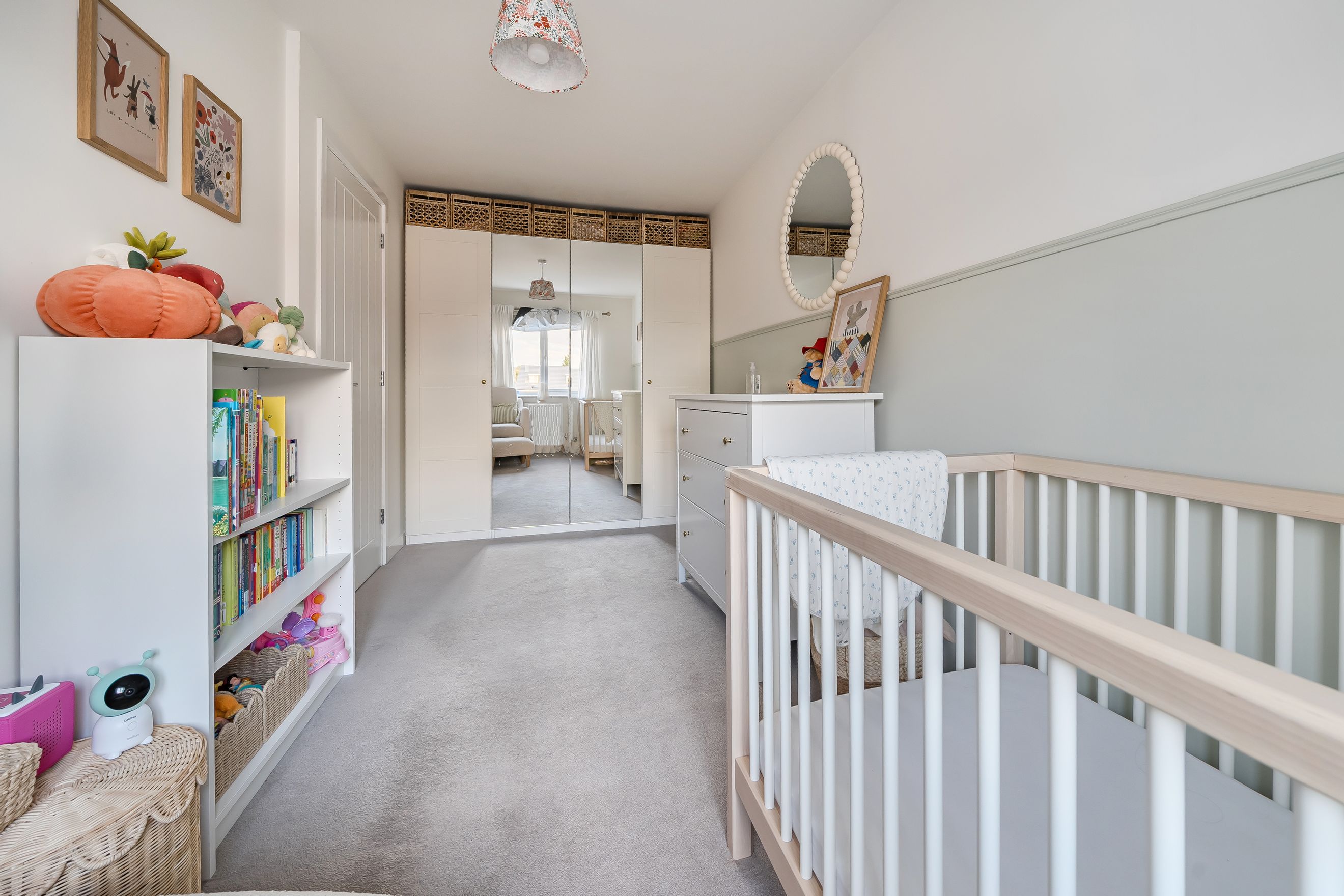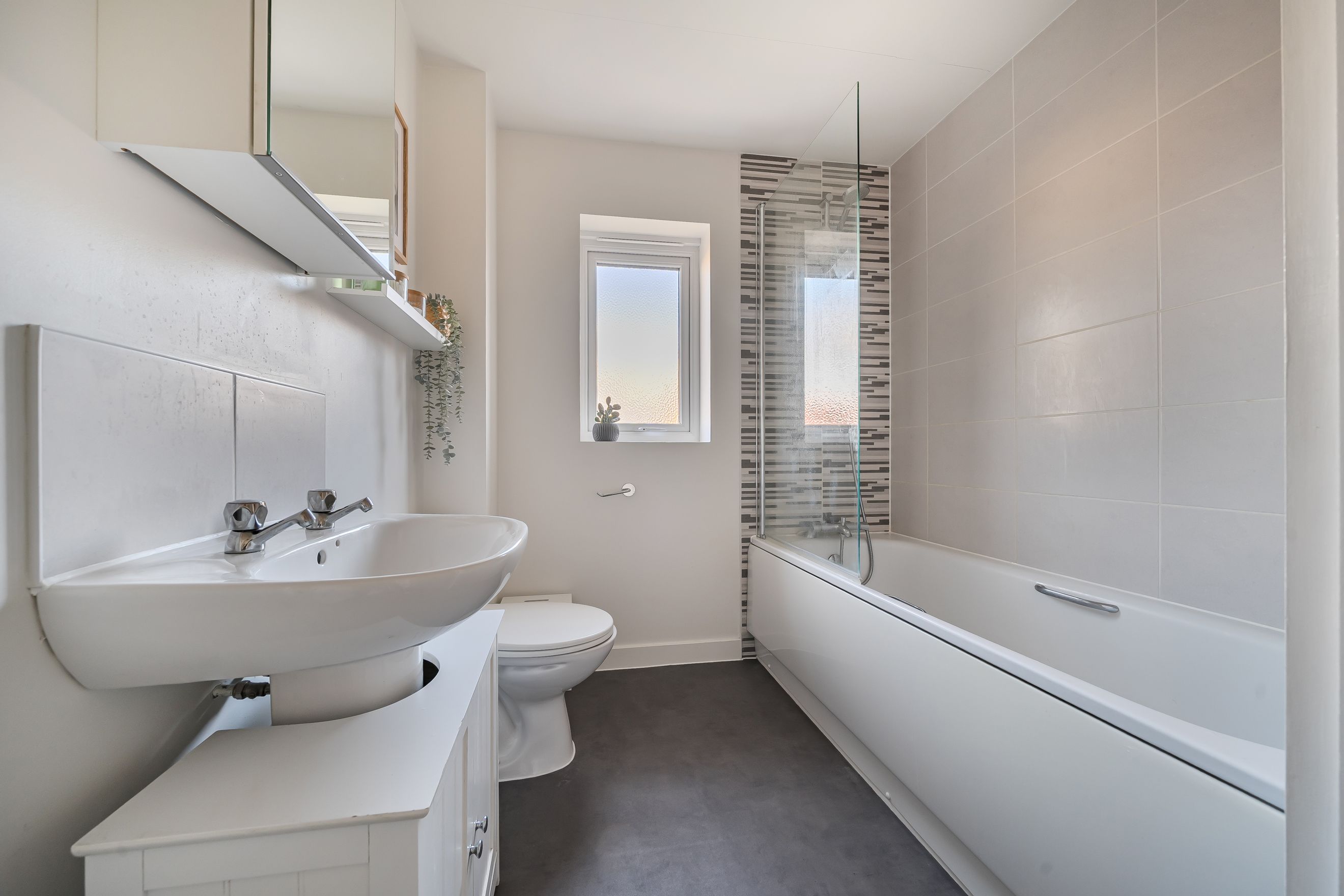 Upstairs, there are two comfortable bedrooms. The family bathroom has a modern, white suite.