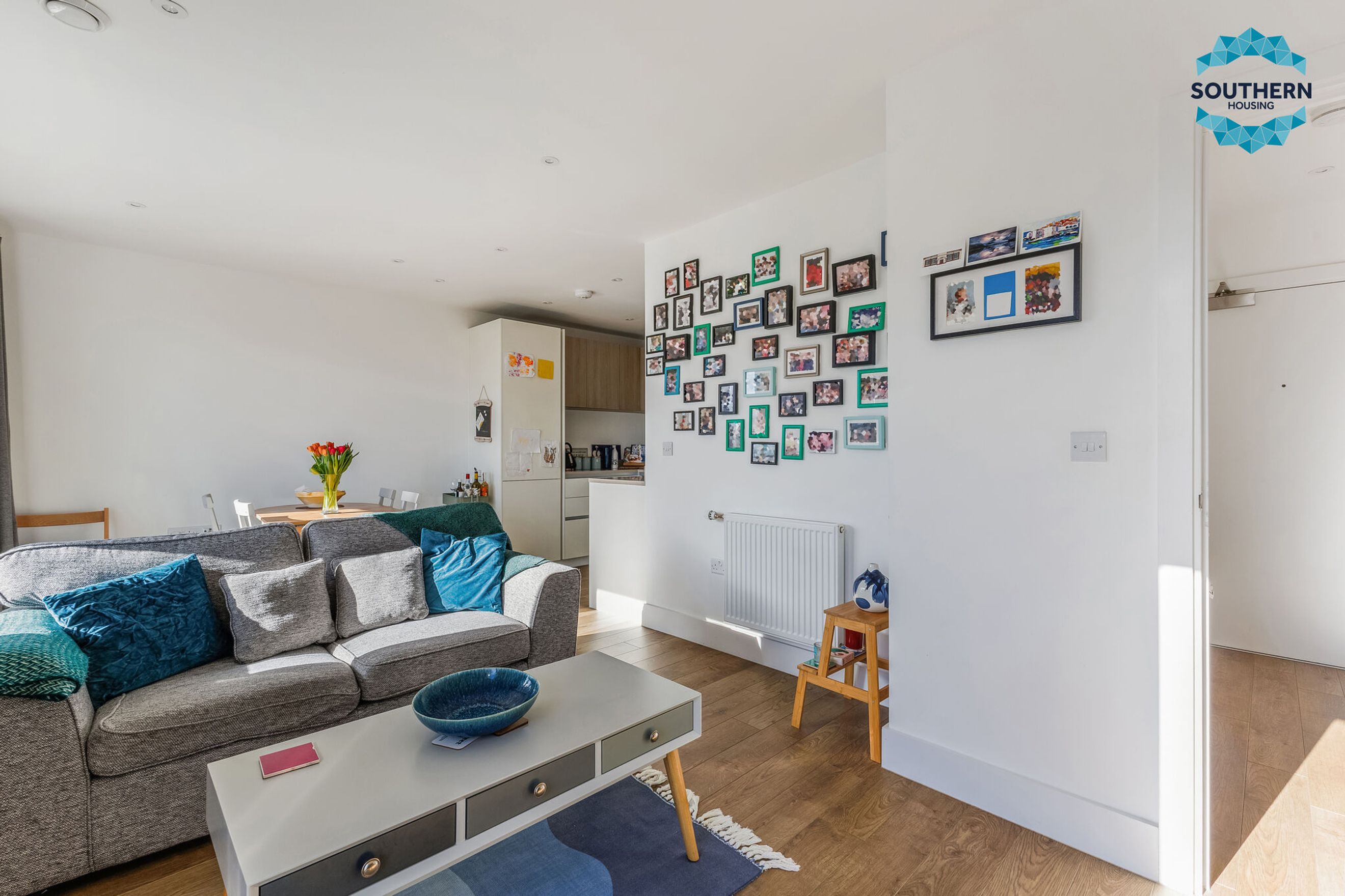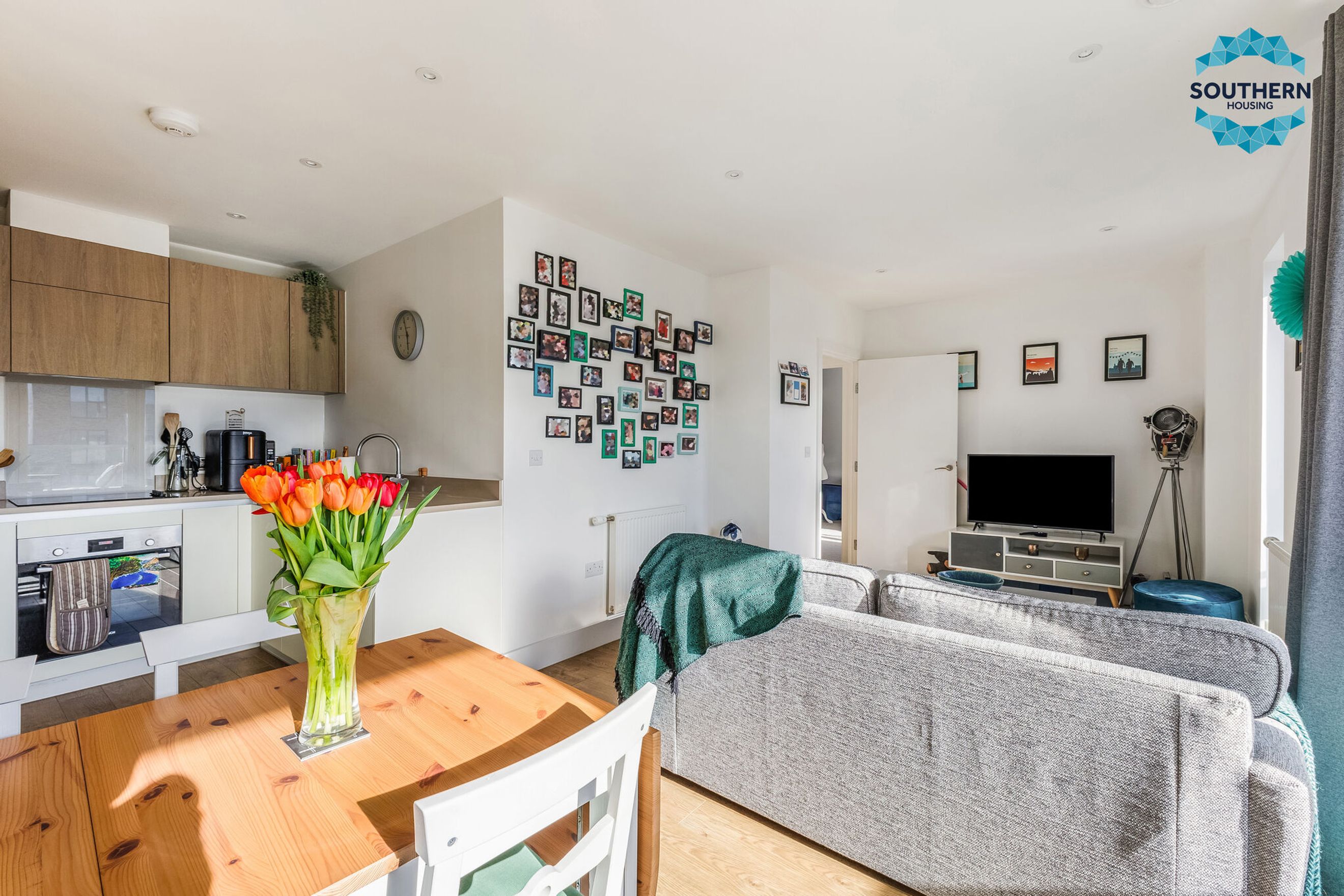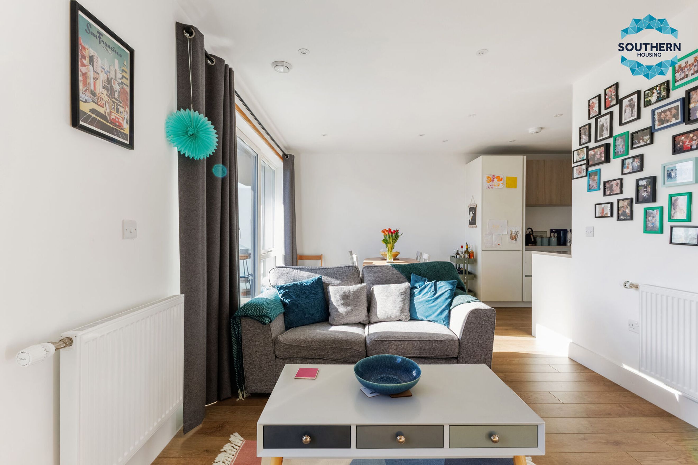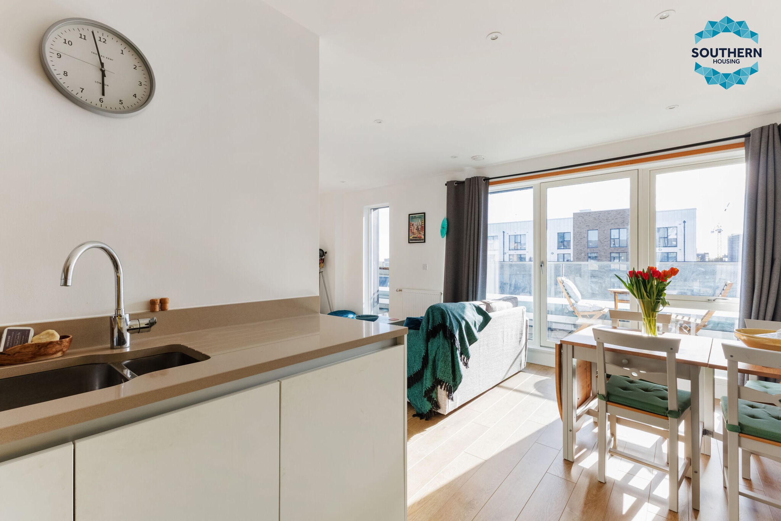 Step into a bright and welcoming entrance hall, complete with a handy storage cupboard. The heart of the home is a generous open-plan living area, thoughtfully laid out to combine the lounge, dining space, and kitchen. South-facing windows on the sixth floor provide elevated views and flood the space with natural light, creating a warm and inviting atmosphere.