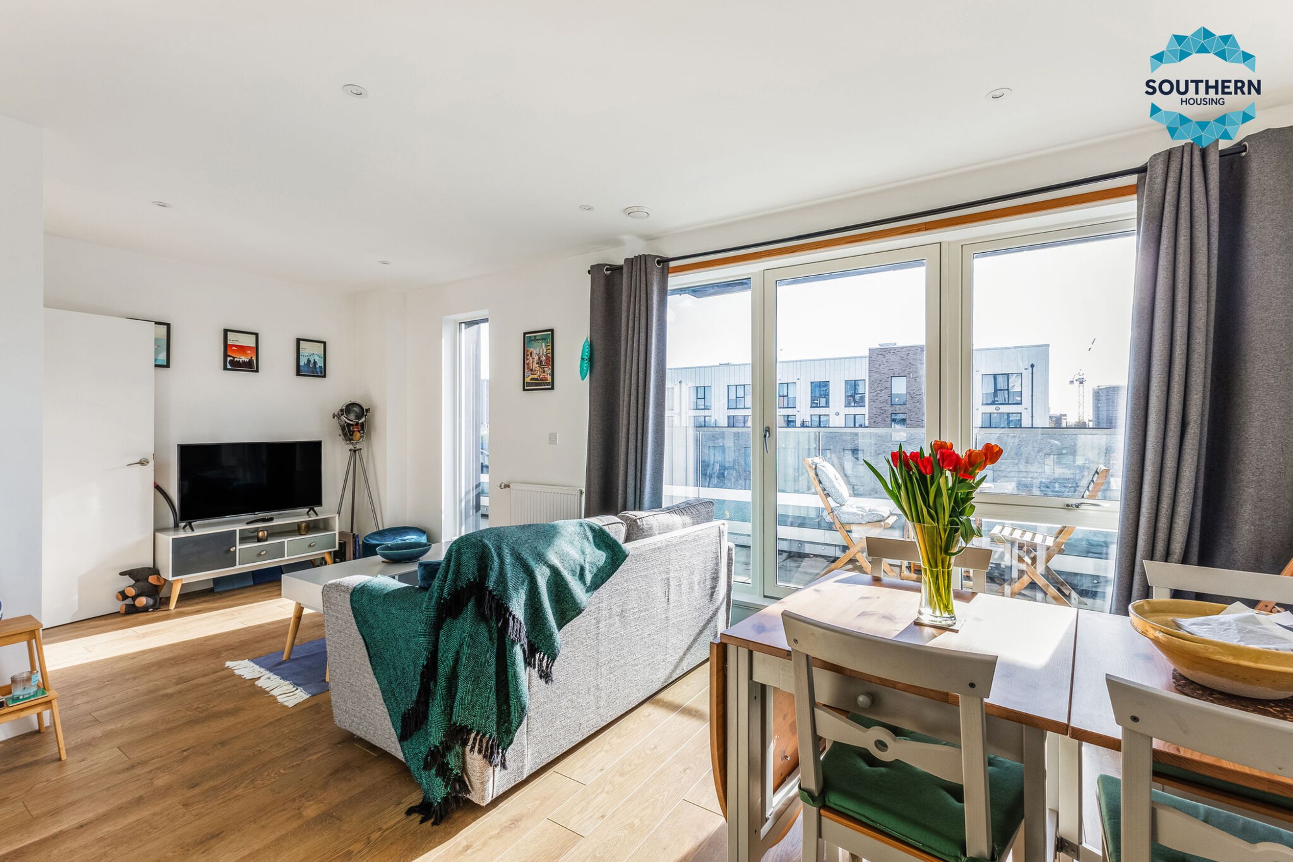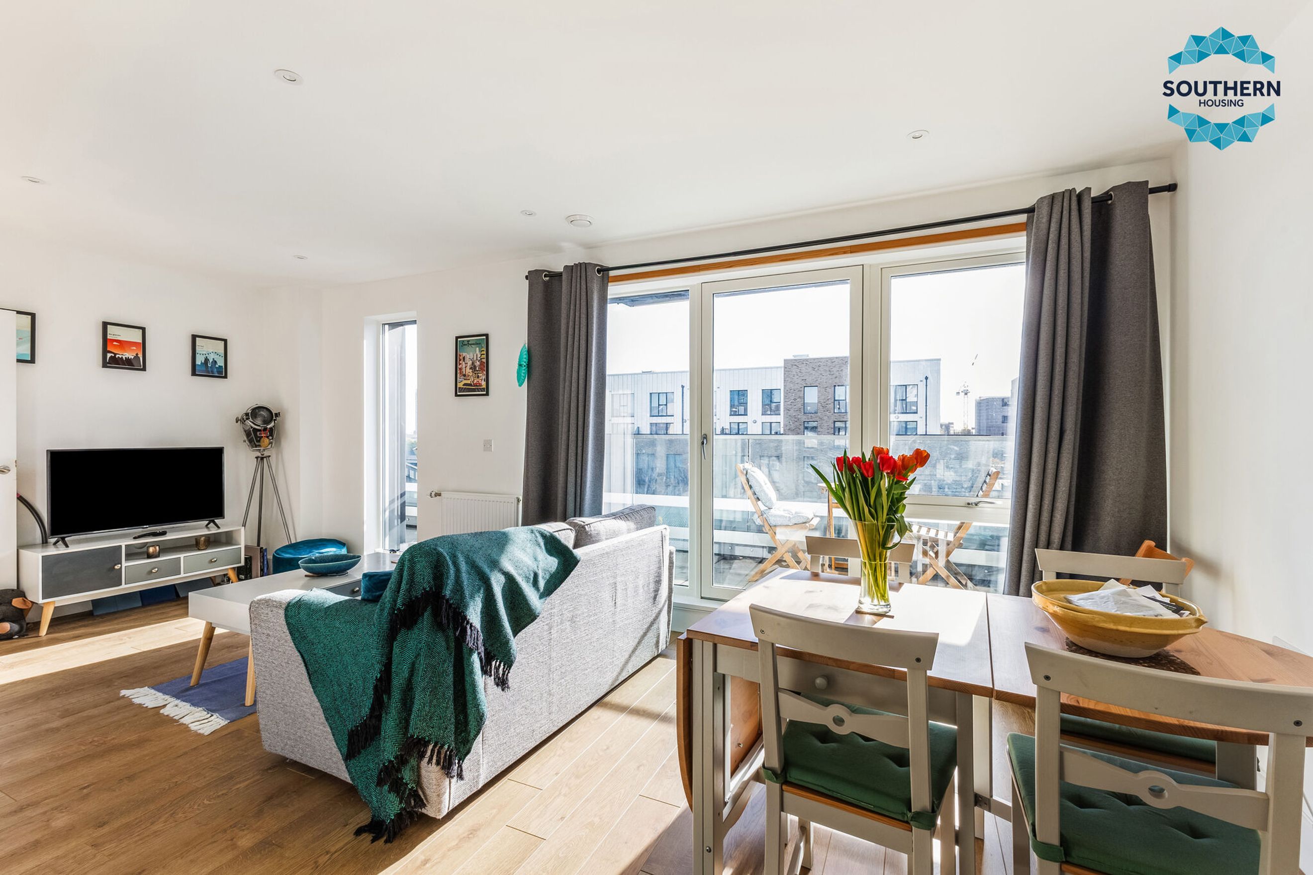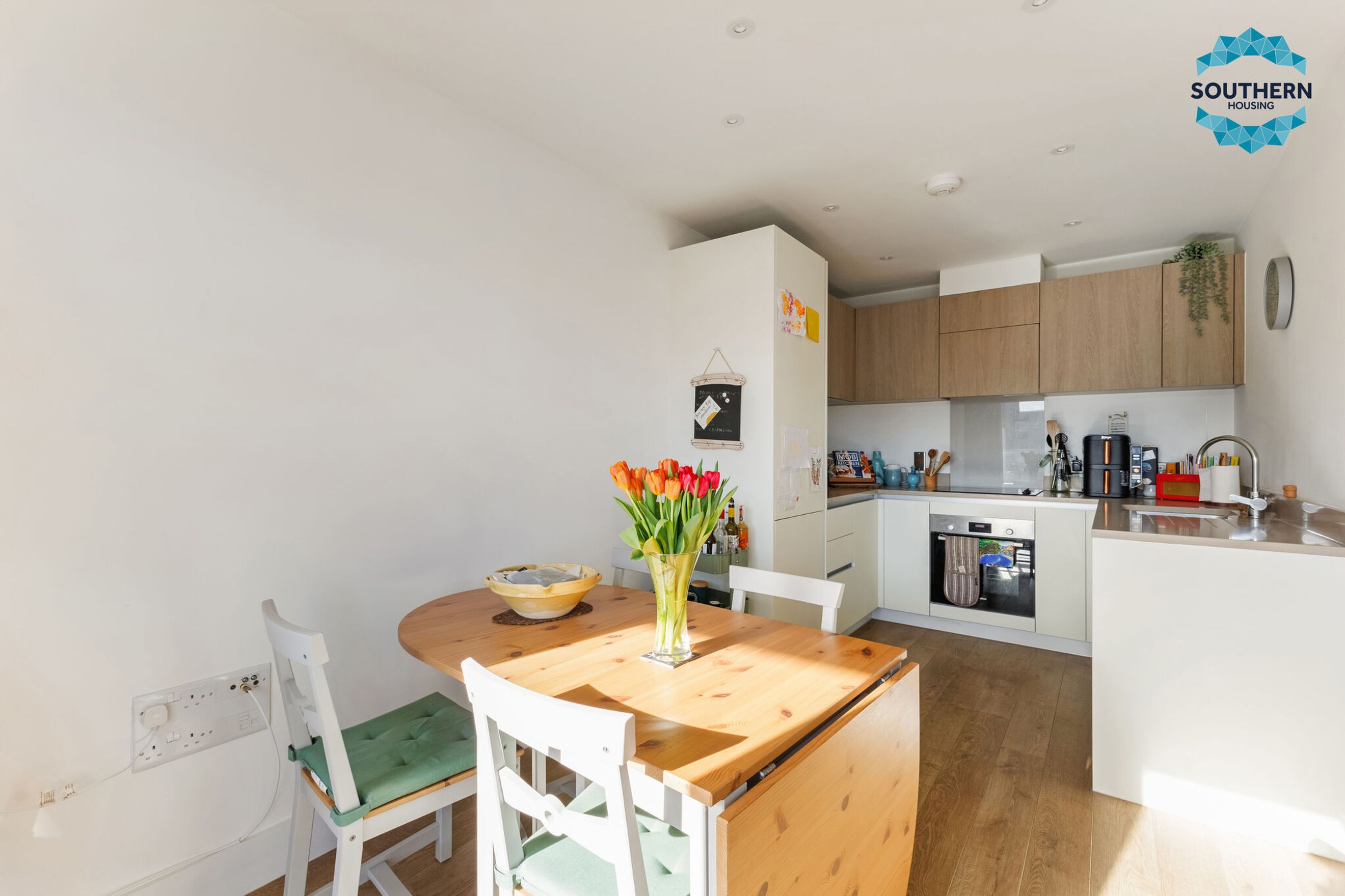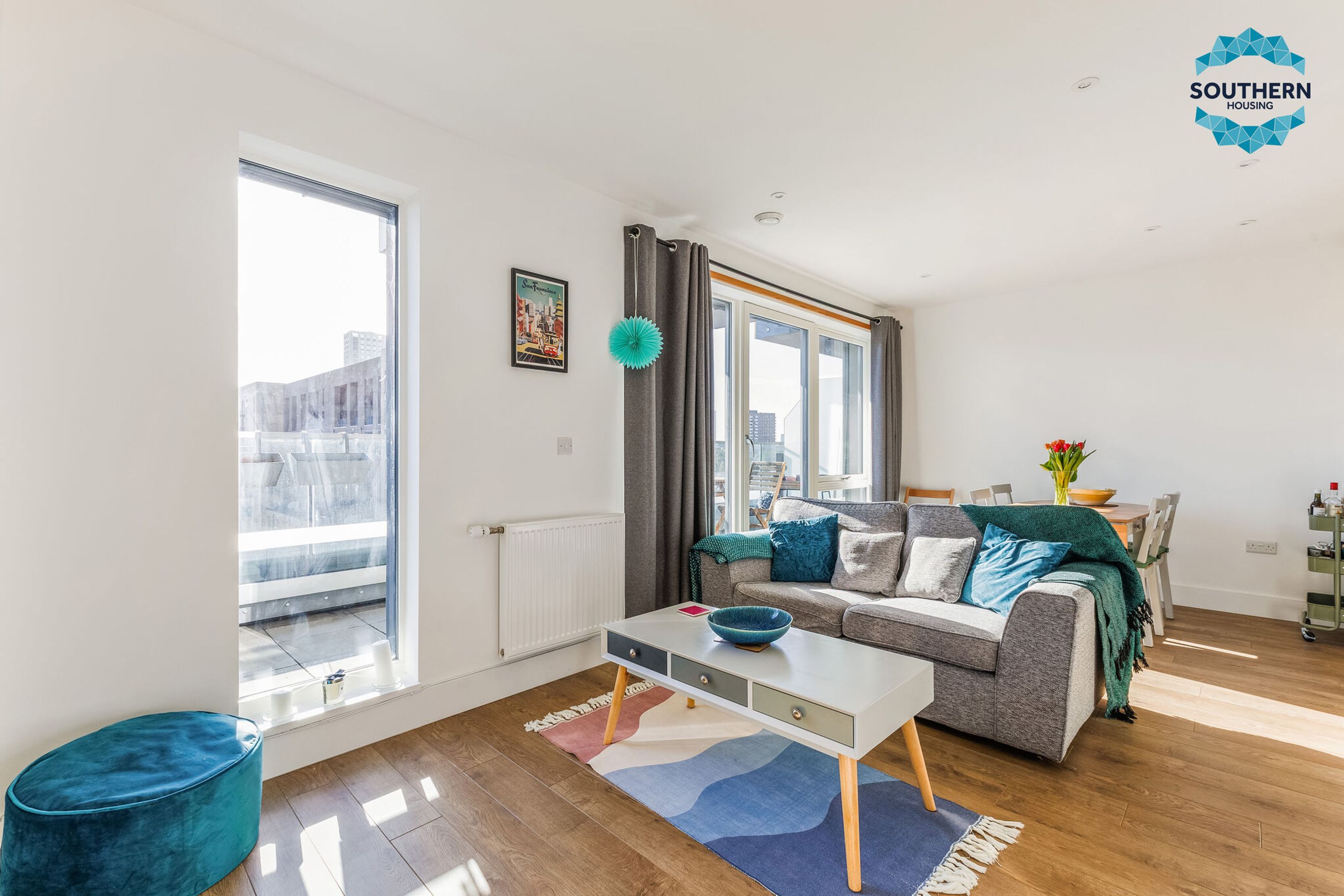 Step into a bright and welcoming entrance hall, complete with a handy storage cupboard. The heart of the home is a generous open-plan living area, thoughtfully laid out to combine the lounge, dining space, and kitchen. South-facing windows on the sixth floor provide elevated views and flood the space with natural light, creating a warm and inviting atmosphere.