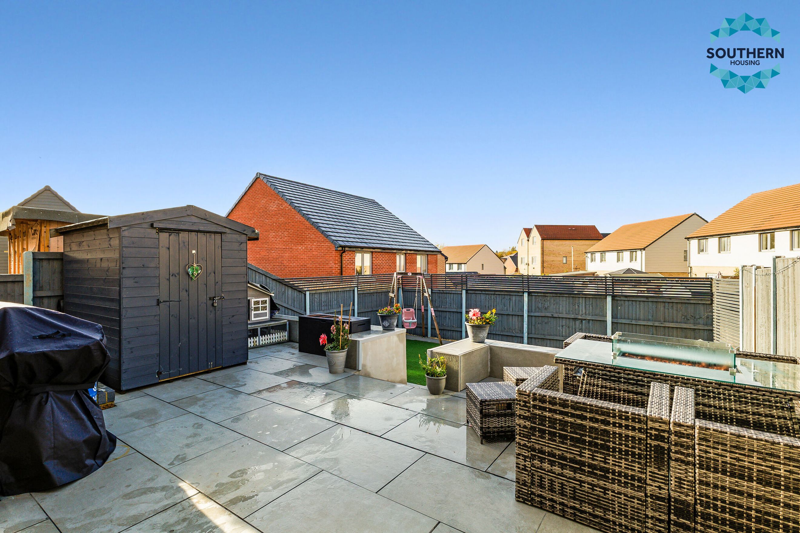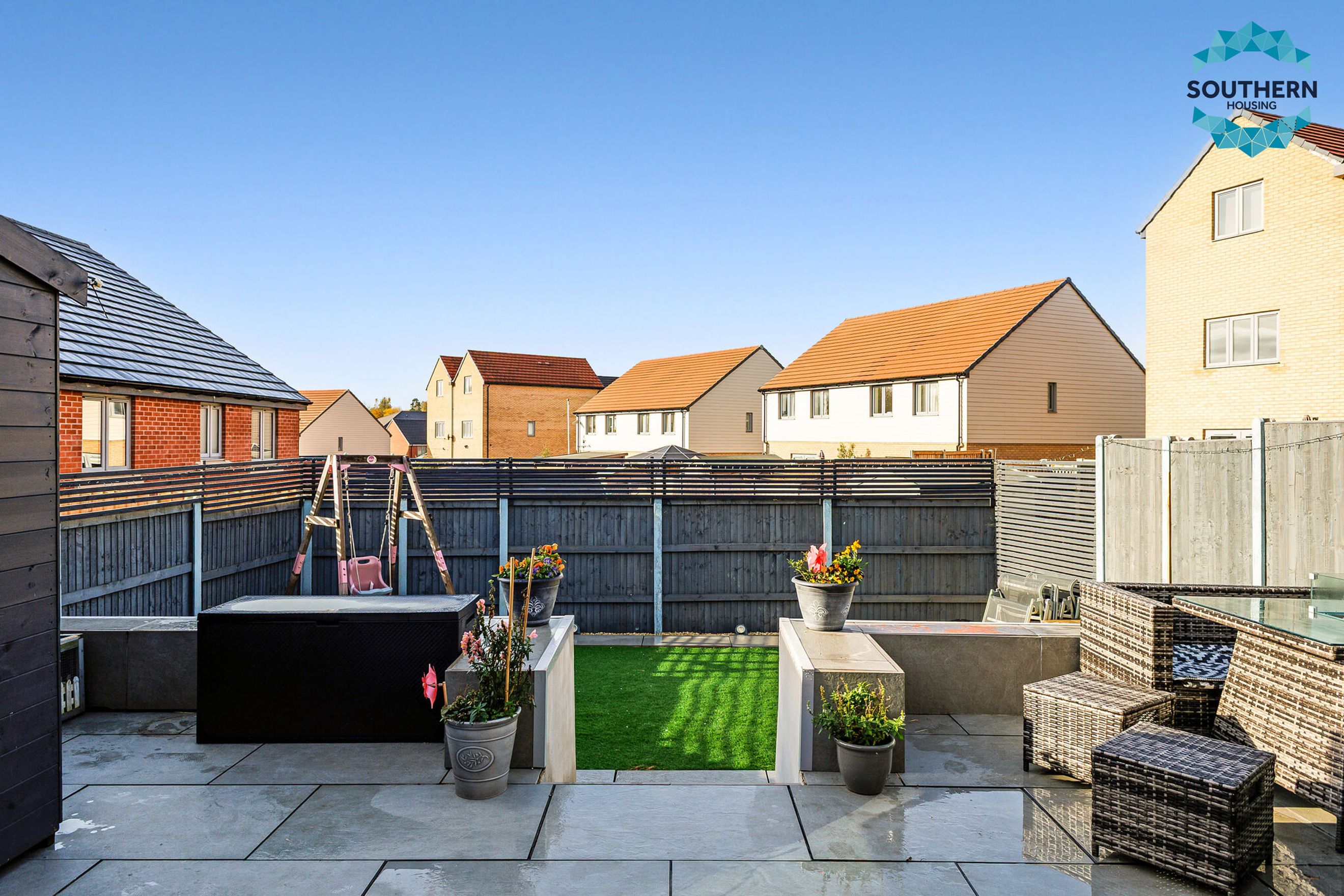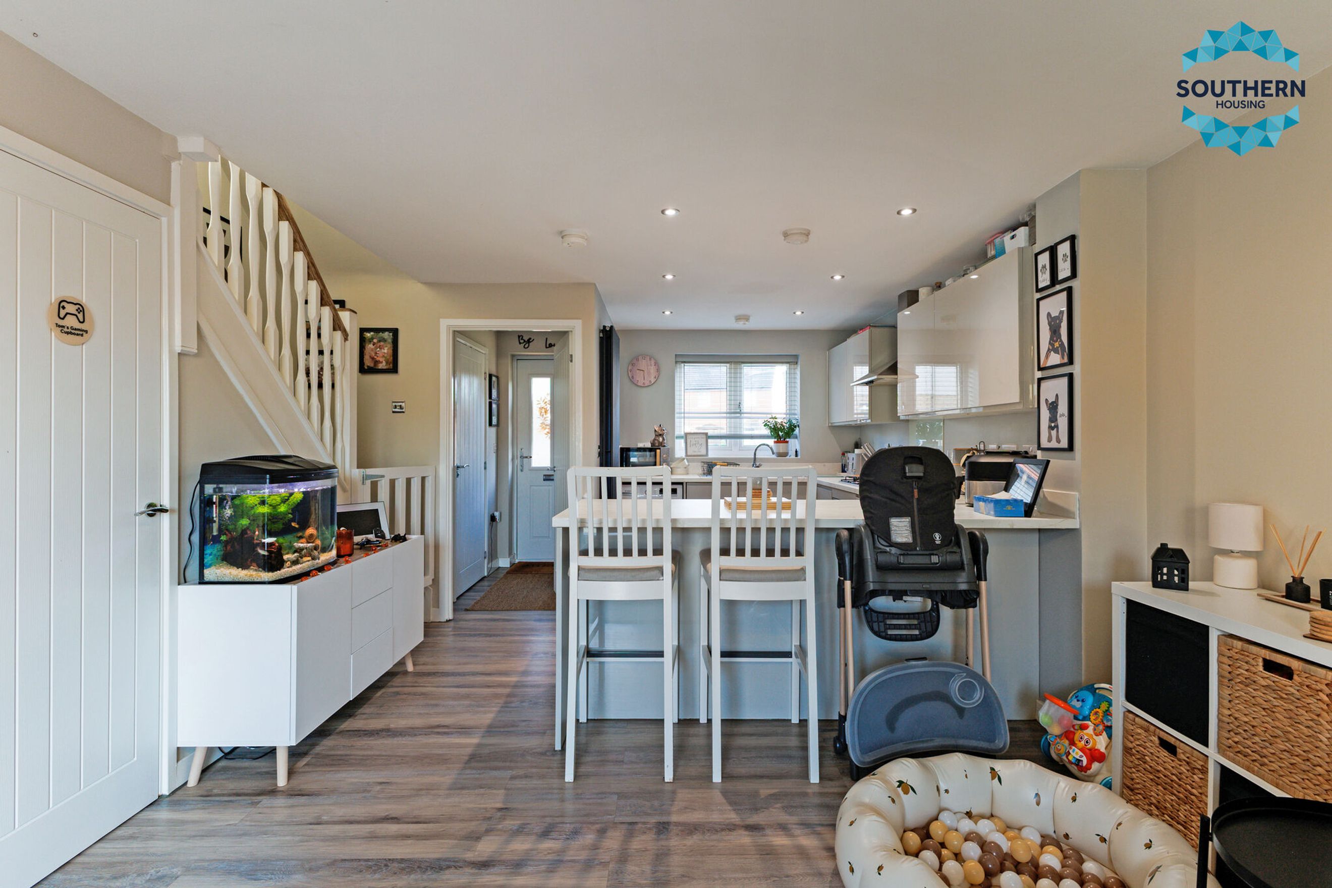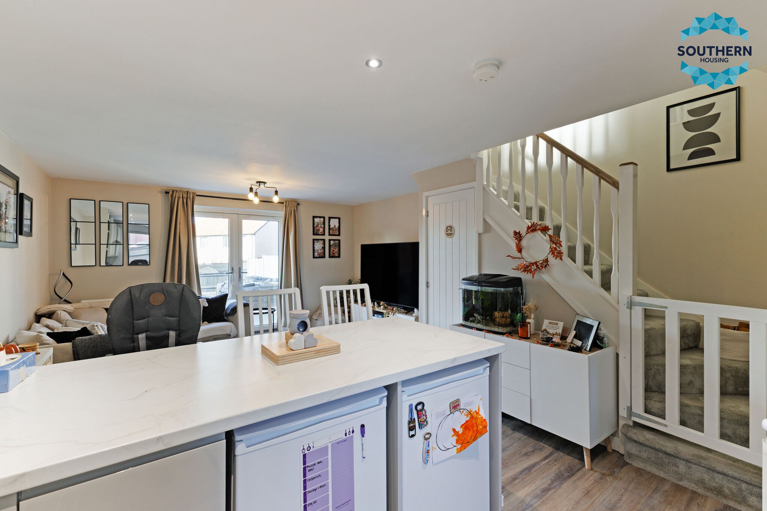 Situated in a quiet residential area of Wellingborough, this 2-bedroom semi-detached house offers modern comfort with practical convenience. The open-plan kitchen and living area features a stylish breakfast bar, creating a sociable hub for cooking and entertaining. A downstairs cloakroom adds everyday practicality. Double doors from the living area open onto a south-facing landscaped garden, providing a sunny outdoor space ideal for relaxation and al fresco dining. The garden also includes an insulated shed, currently used as an office, with electrical points accessible at both the lower and upper tiers for flexible use. Upstairs, you'll find two double bedrooms, each equipped with vented air conditioning for year-round comfort, and a family bathroom completes the accommodation. A side driveway accommodates parking for two cars. This home blends contemporary styling with the semi-detached charm you're looking for, in a peaceful, desirable neighbourhood.