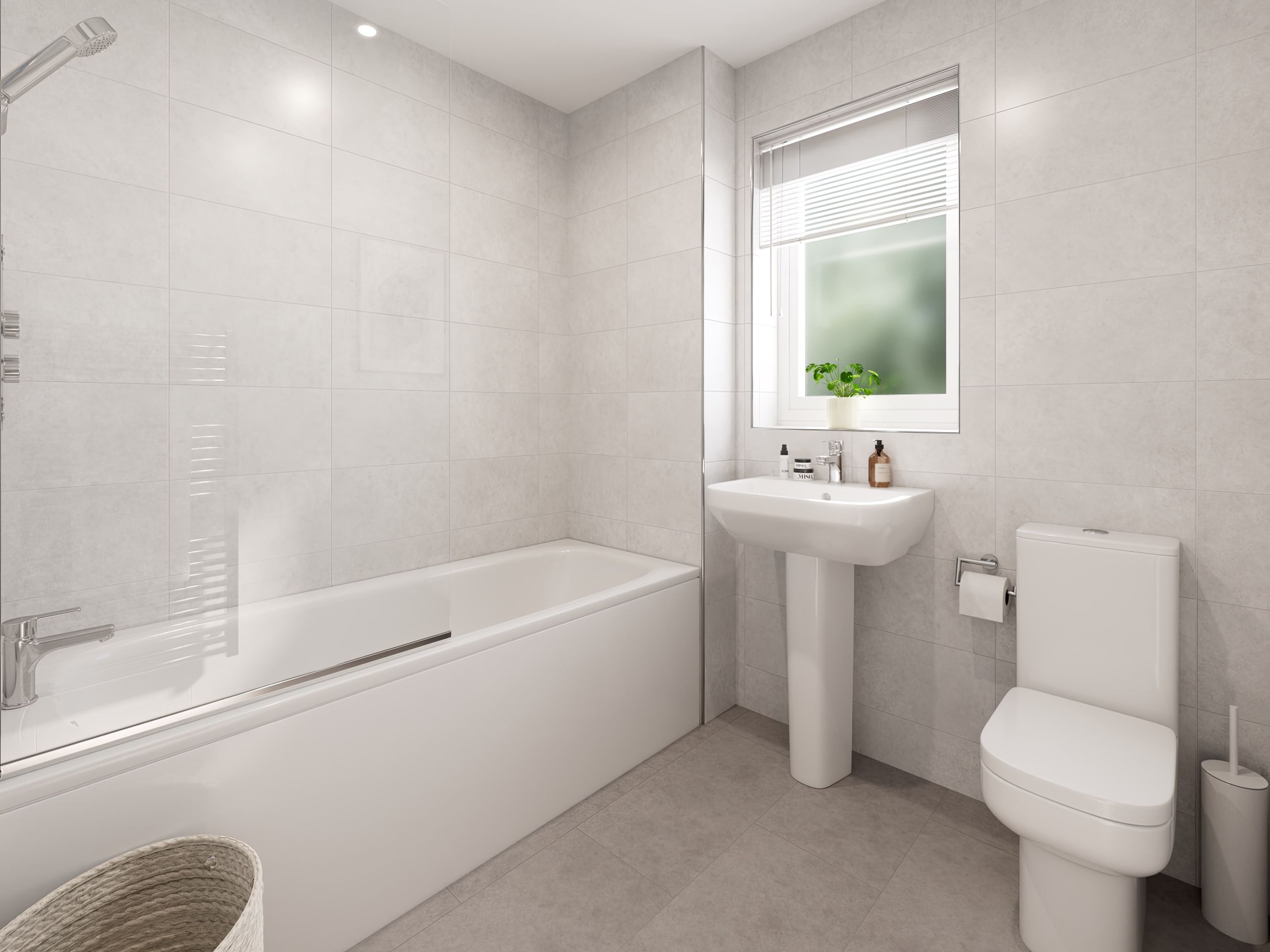 Upstairs is home to the three bedrooms, bedroom one is the whole width of the home, with a handy storage cupboard, whilst the bathroom is fitted with contemporary sanitaryware and chrome fittings.