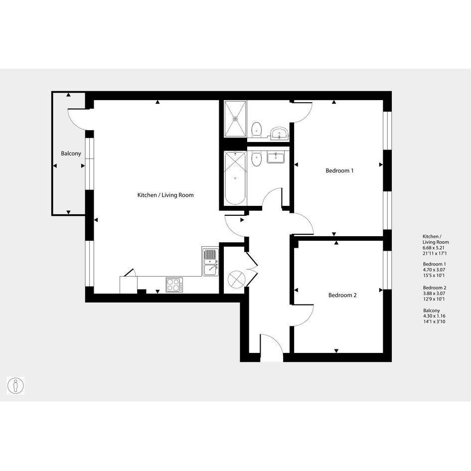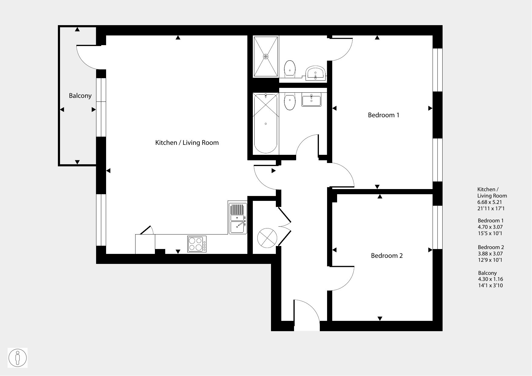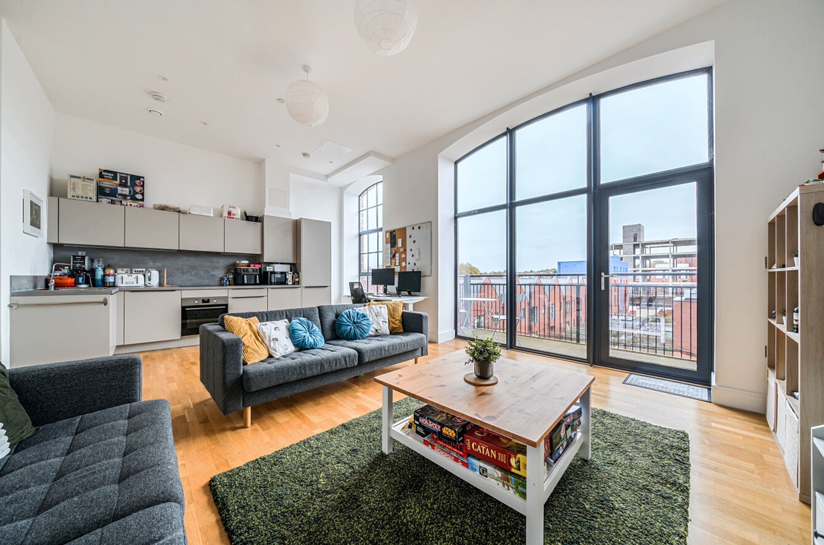 Featuring an open-plan living area, with a door to your balcony. The kitchen is fitted with integrated appliances, including a fridge freezer and dishwasher.