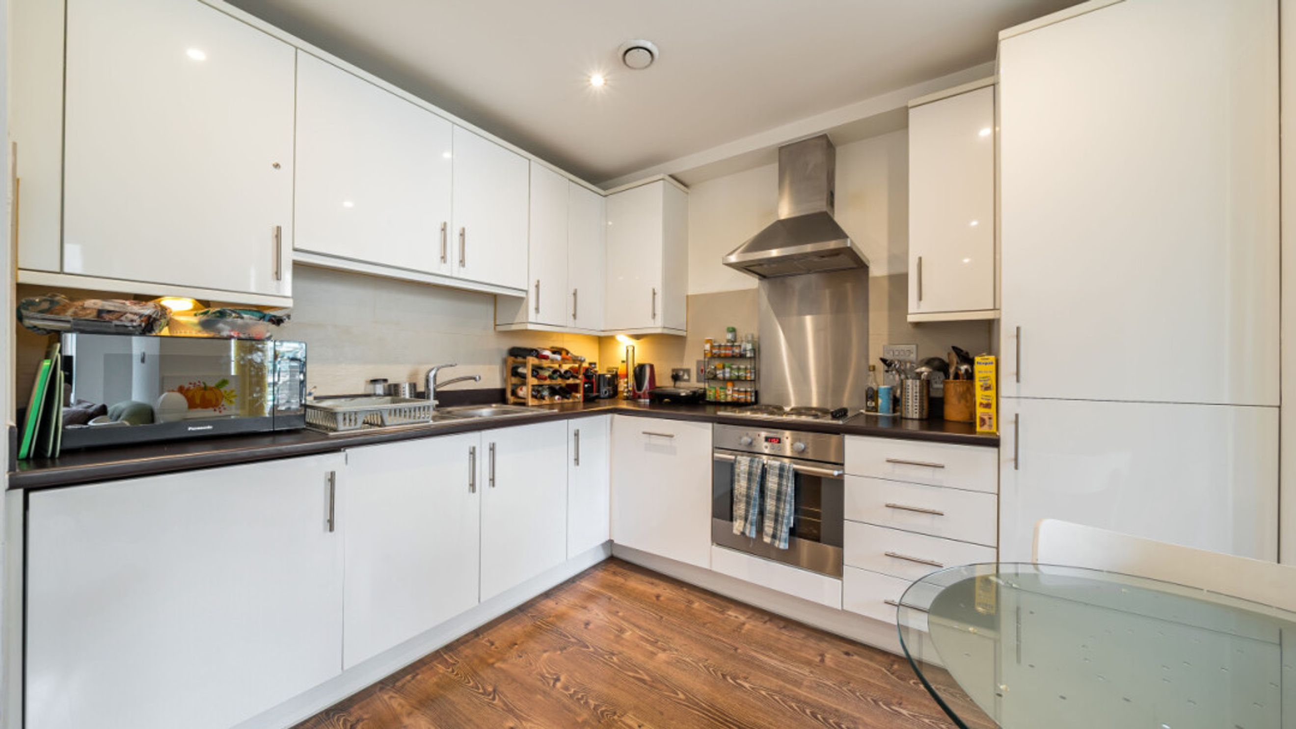This well maintained stylish apartment has a dual aspect, living/reception room with sliding doors to a private balcony. The apartment is full of natural light. The balcony is of good size which is good for relaxing and enteratining. The kitchen consists of modern white gloss units and has the benefit of intergrated appliances. Both bedrooms are of good size and come complete with fitted storage. There is a modern large family bathroom with a white three piece suite and shower over bath. The block boasts a large communal roof terrace.