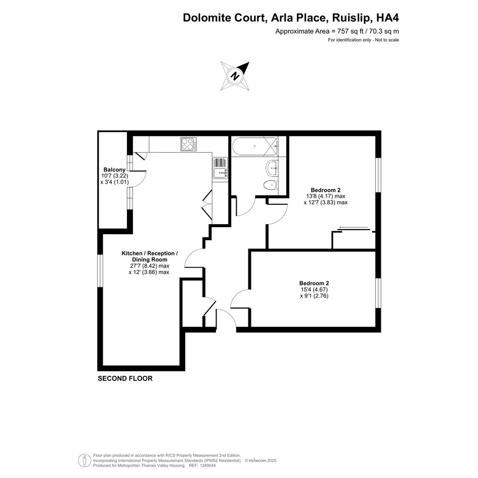 The property on the second floor comprises an entrance hall with storage cupboards, a living room with a modern, open-plan kitchen, two bedrooms, and a bathroom.