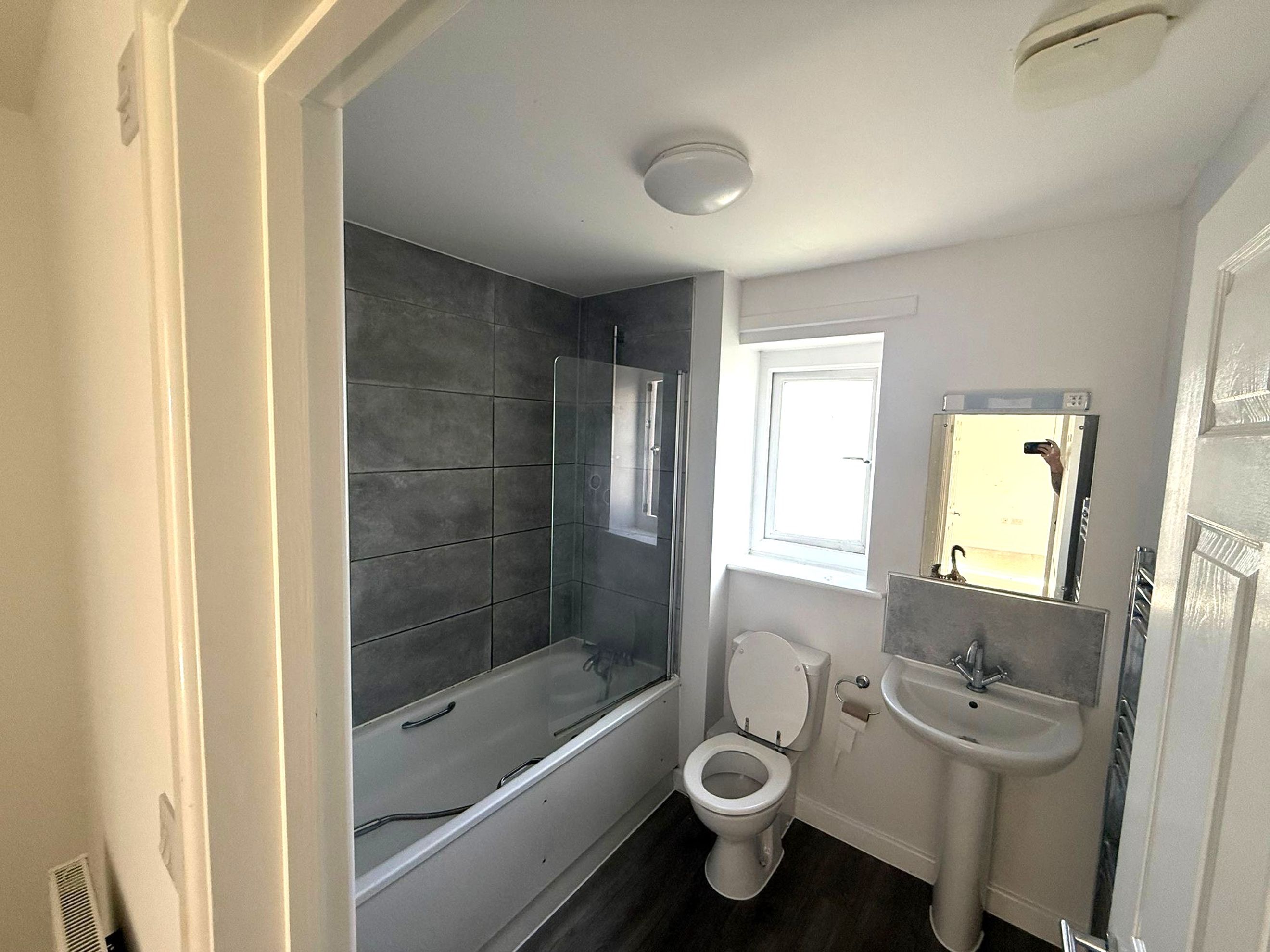 The family bathroom (2.1m x 1.9m) is fitted with a classic white suite, including a shower over the bath, WC and hand basin. A glass shower screen, grey tiling and ladder radiator give the space a fresh, modern feel.