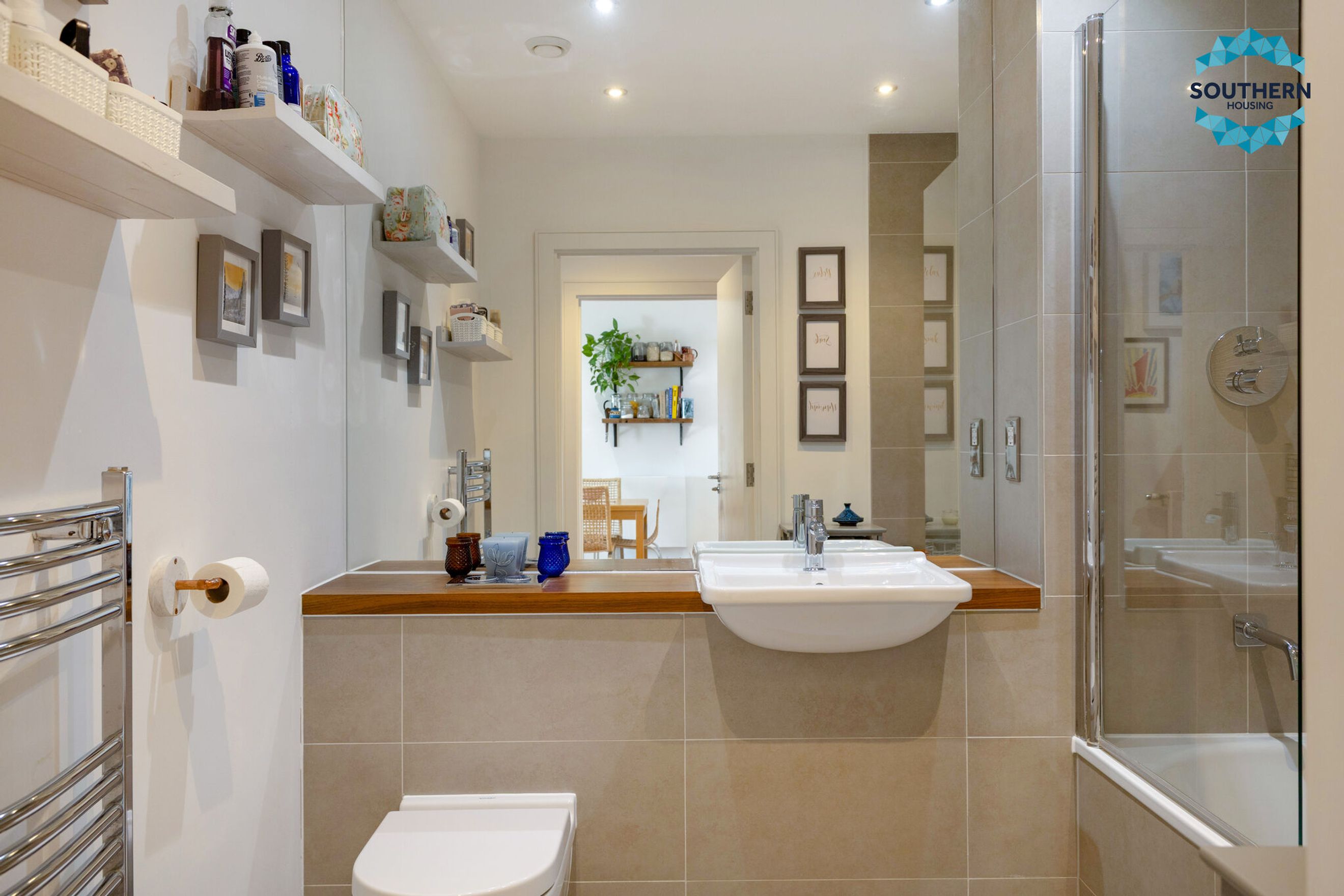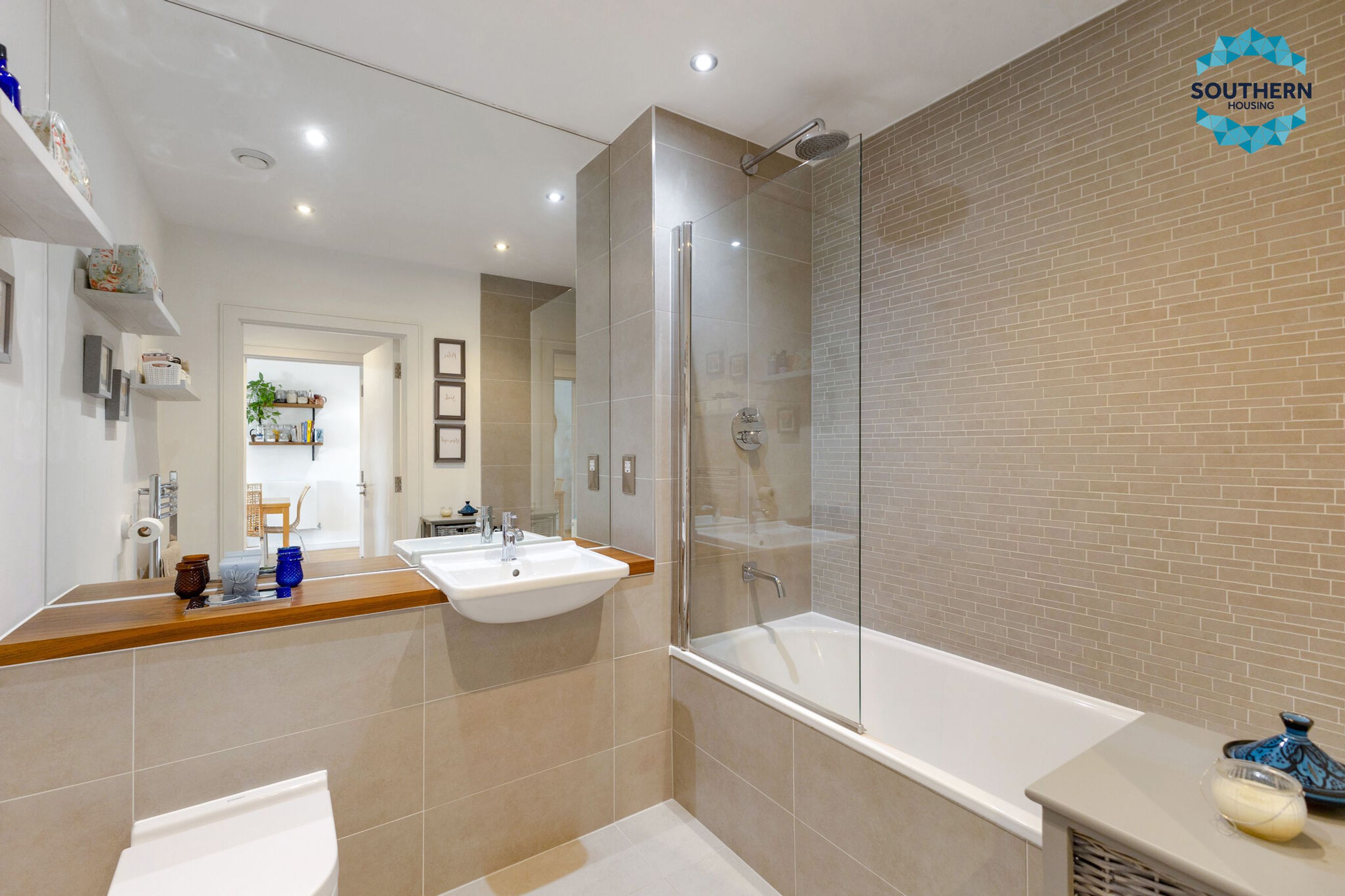 The modern bathroom is finished to a high standard, featuring sleek tiling, a contemporary suite, and a combination bath and shower. The design provides both practicality and a touch of luxury, perfect for unwinding at the end of the day.