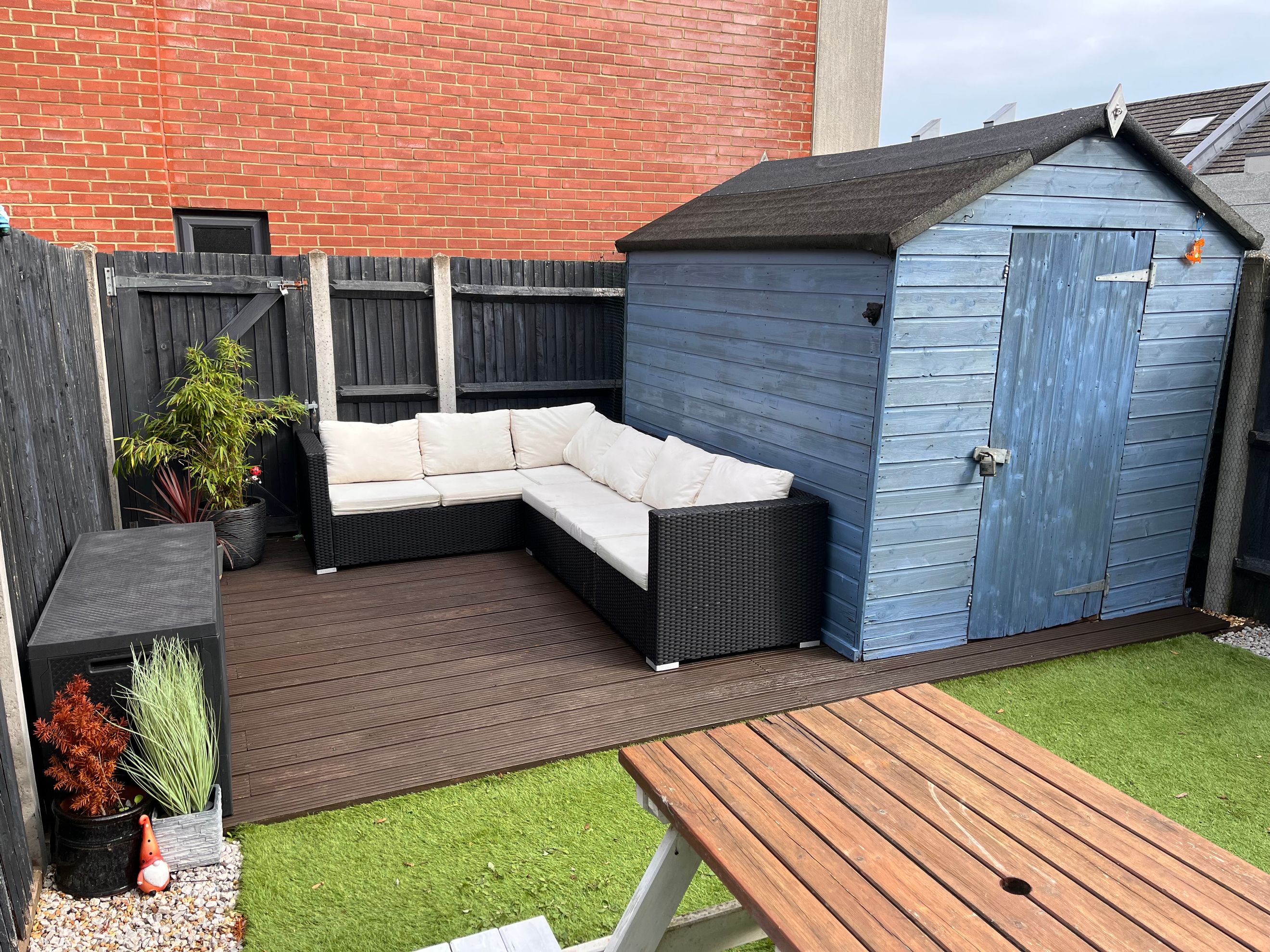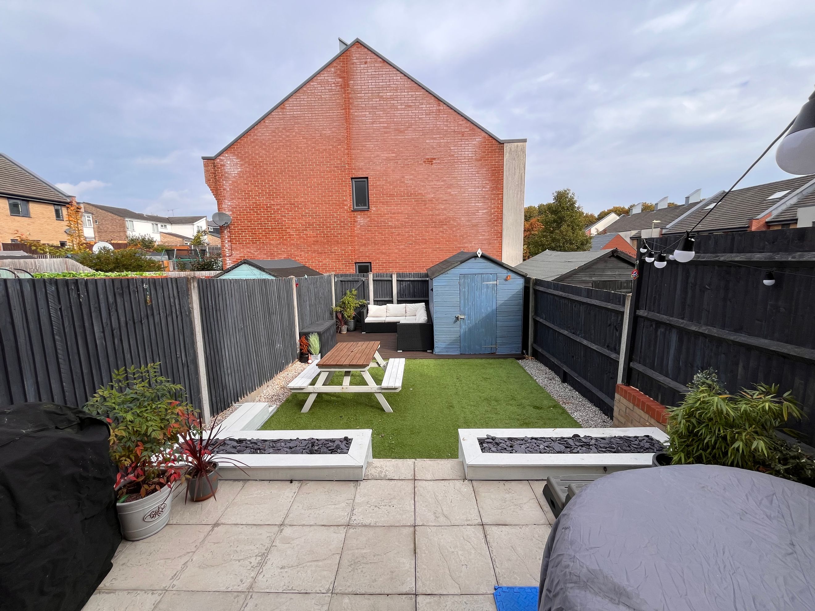 Outside, the rear garden is landscaped for low maintenance, with a patio, artificial lawn, raised decking, external power socket, and a storage shed. Communal parking is available directly outside, with additional spaces nearby.