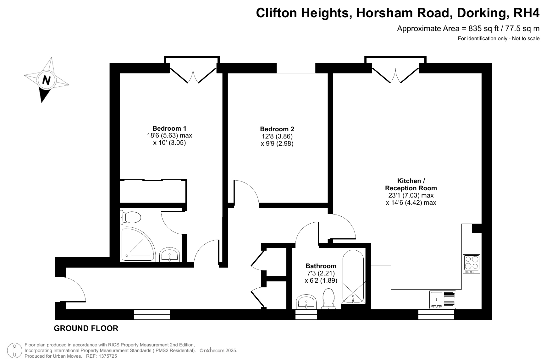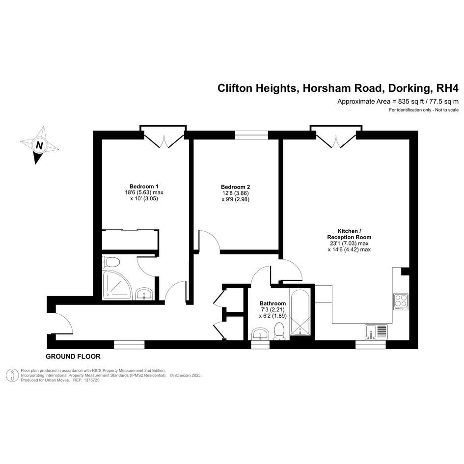 A bright and well-presented flat just a short walk from the excellent range of shops and other amenities of Dorking town centre. The property is at entrance level but effectively first-floor due to the height difference across the site. There is a twenty-three-foot, dual-aspect reception room with south/south-east-facing Juliette balcony and a smart, open-plan kitchen which includes a new oven and integrated dishwasher. The main bedroom also has a Juliette balcony along with a fitted wardrobe and an en-suite shower room. The second bedroom is a good-sized double and both bedrooms share the same south/south-east aspect. The bathroom and entrance hallway are naturally lit, the windows are modern, double glazed units and there is underfloor heating throughout. Clifton Heights has pleasant communal grounds and a parking area that includes two spaces for this flat.