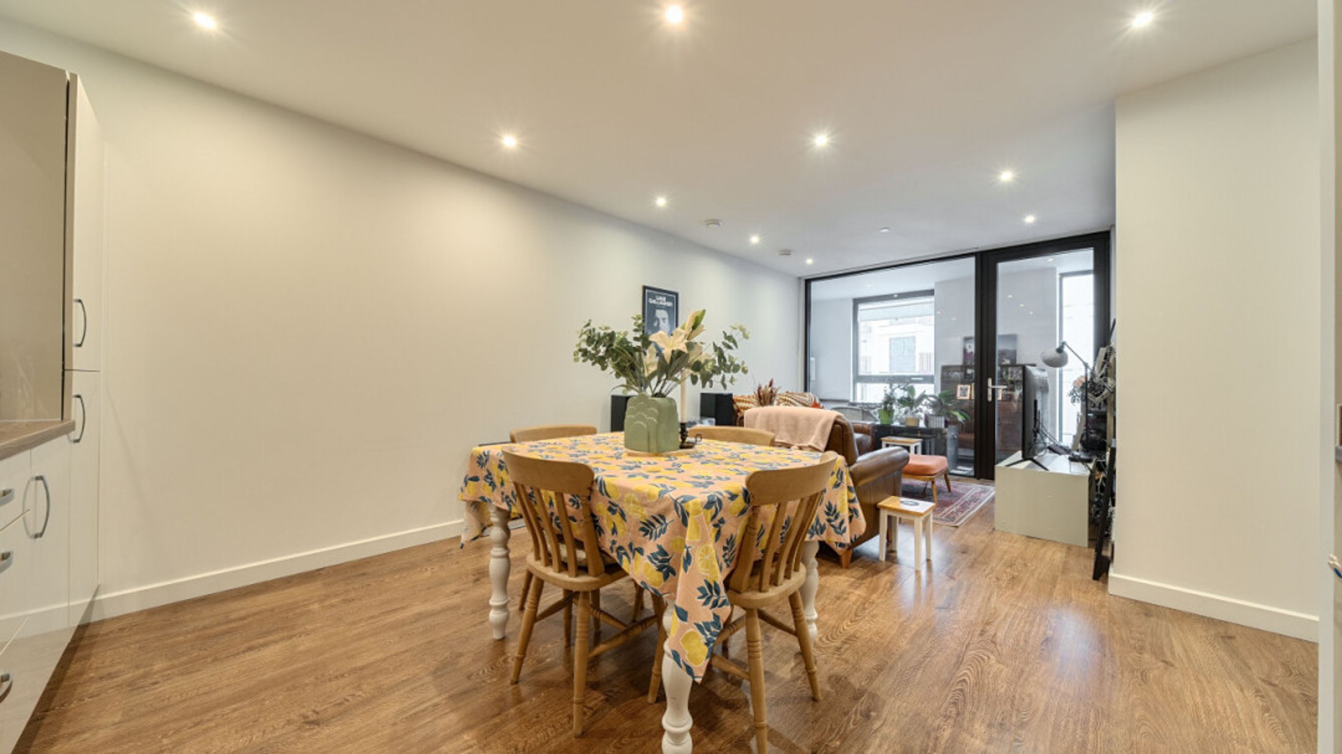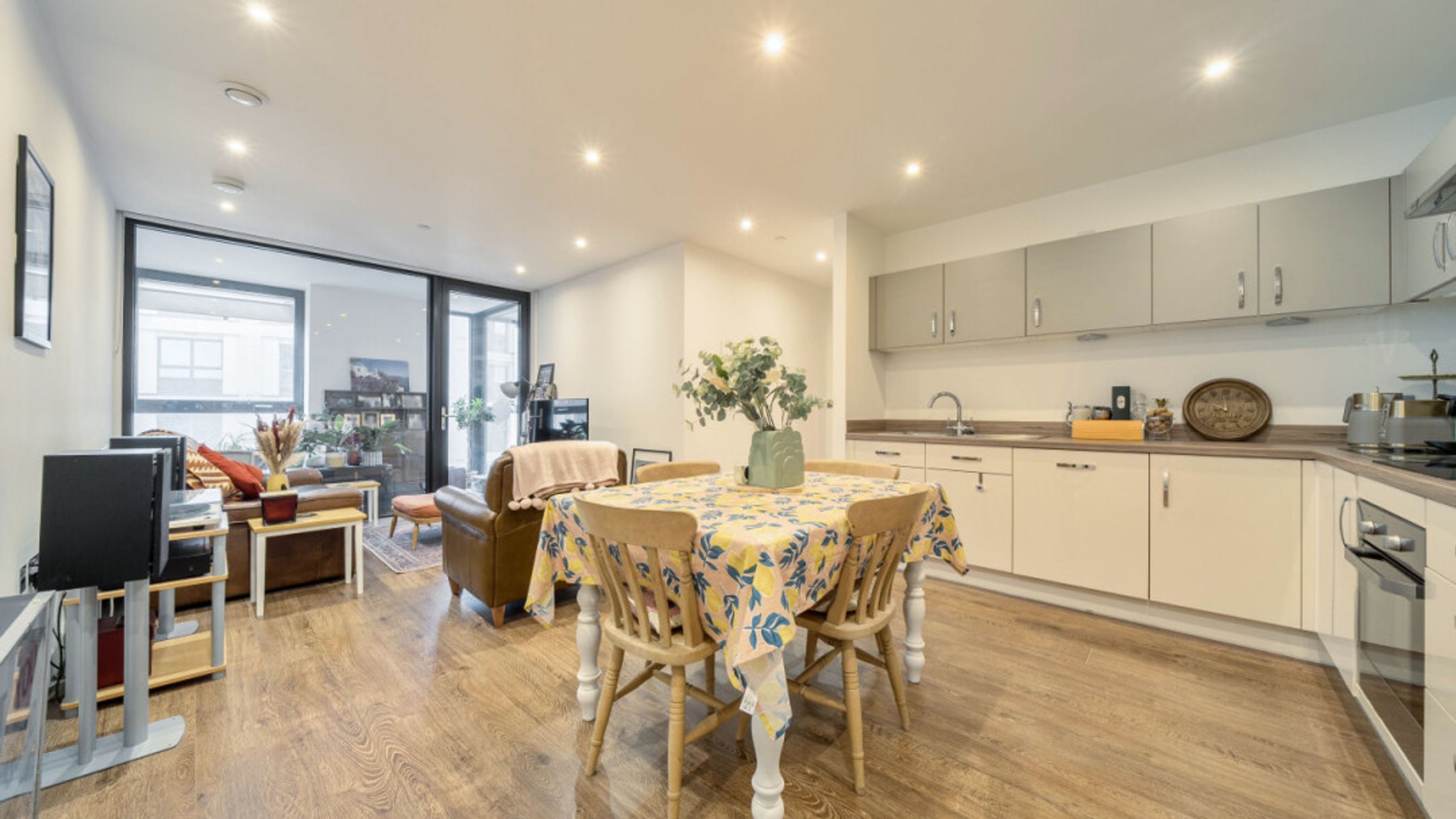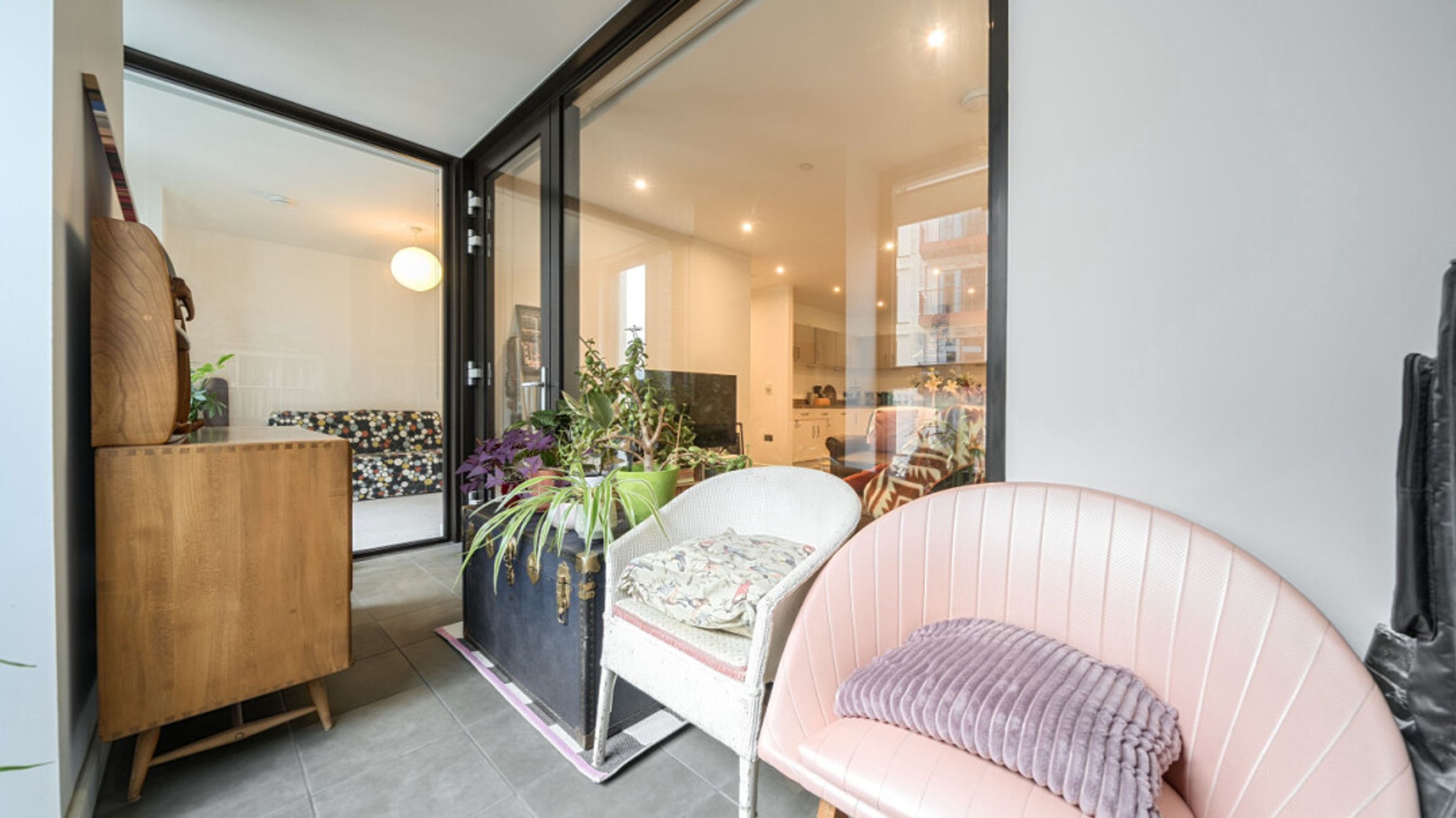 Enter this bright and spacious apartment through a hallway lined with storage/utility cupboards. The well proportioned open plan living area, incorporating a beautiful kitchen, leads to a south west winter garden overlooking the communal courtyard garden. Of the two spacious double bedrooms, one benefits from built-in storage cupboards and the other overlooks the winter garden. A contemporary bathroom completes the accommodation.