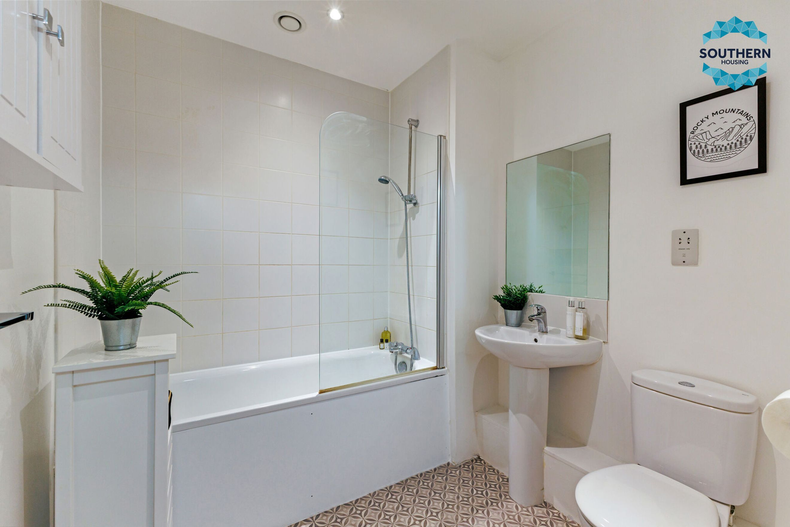 The bathroom is modern with floor to ceiling tiles and shower over bath.
