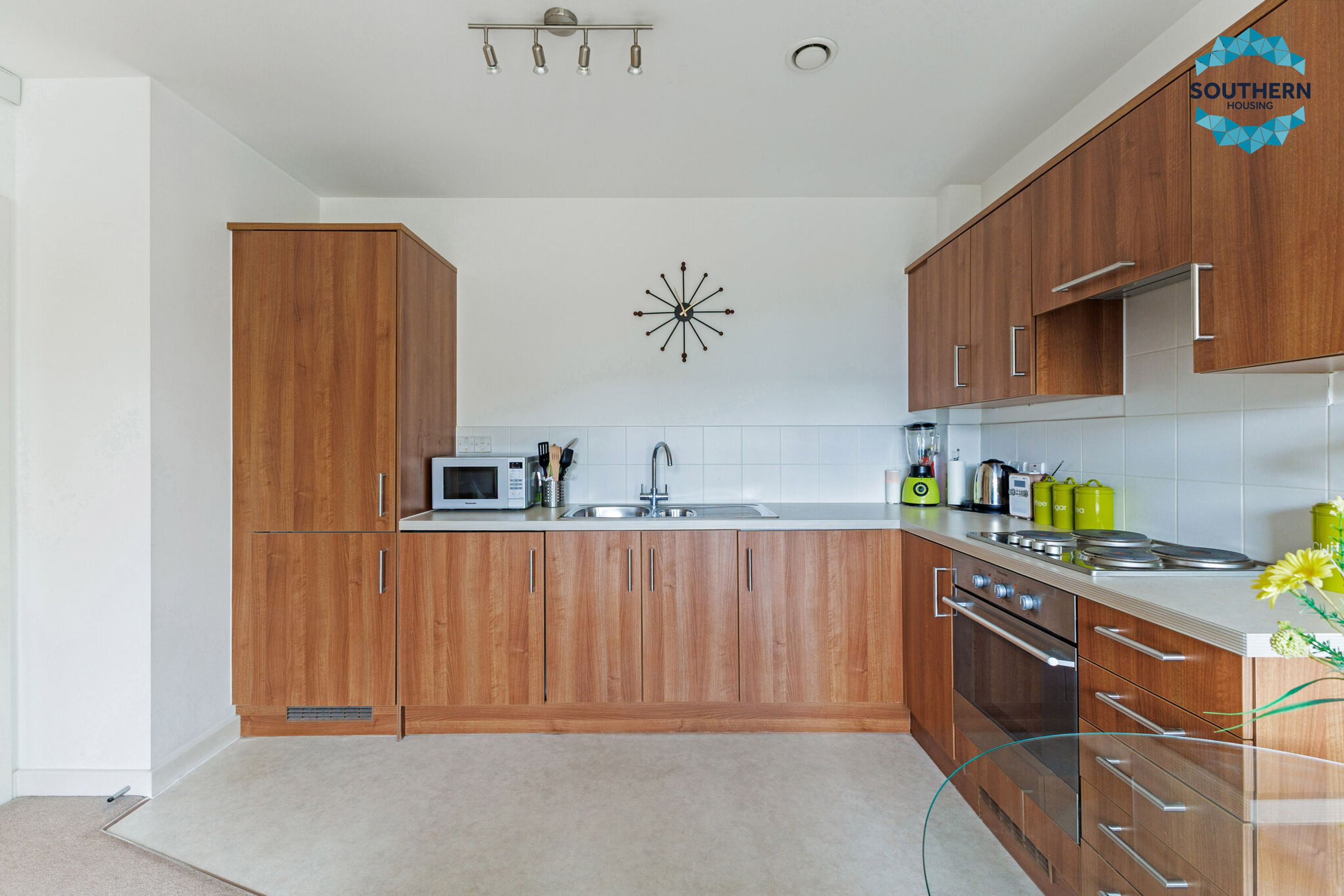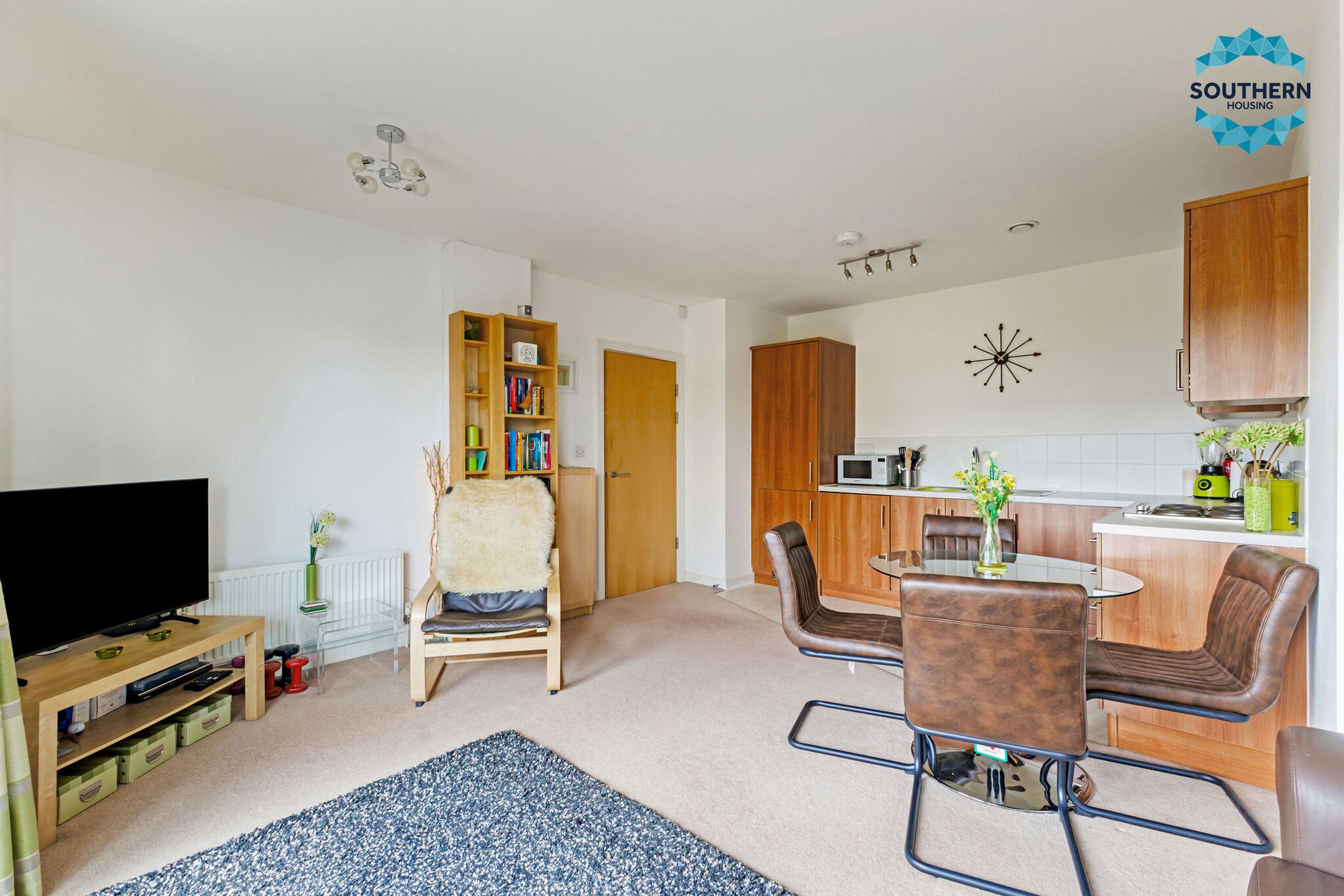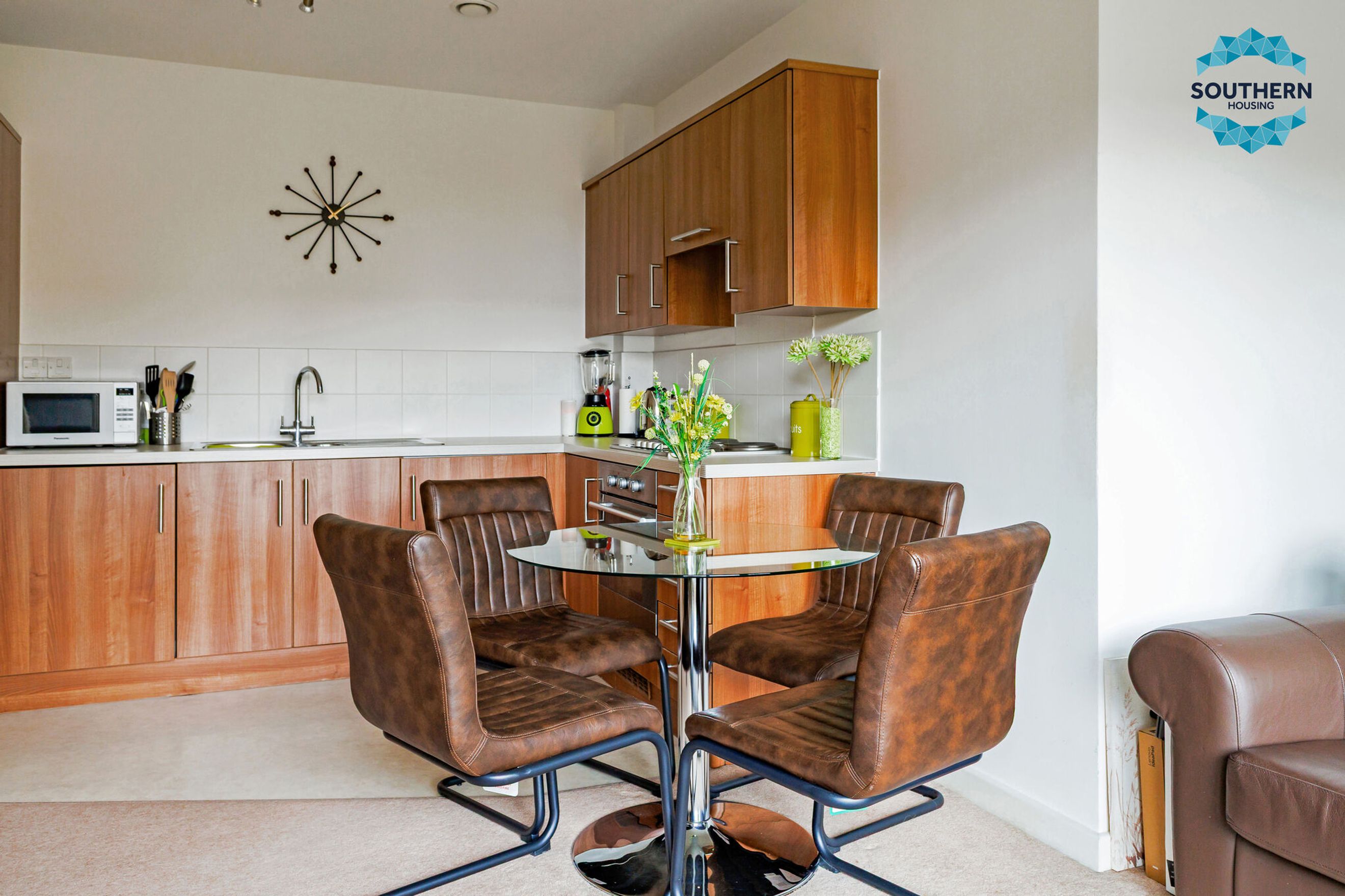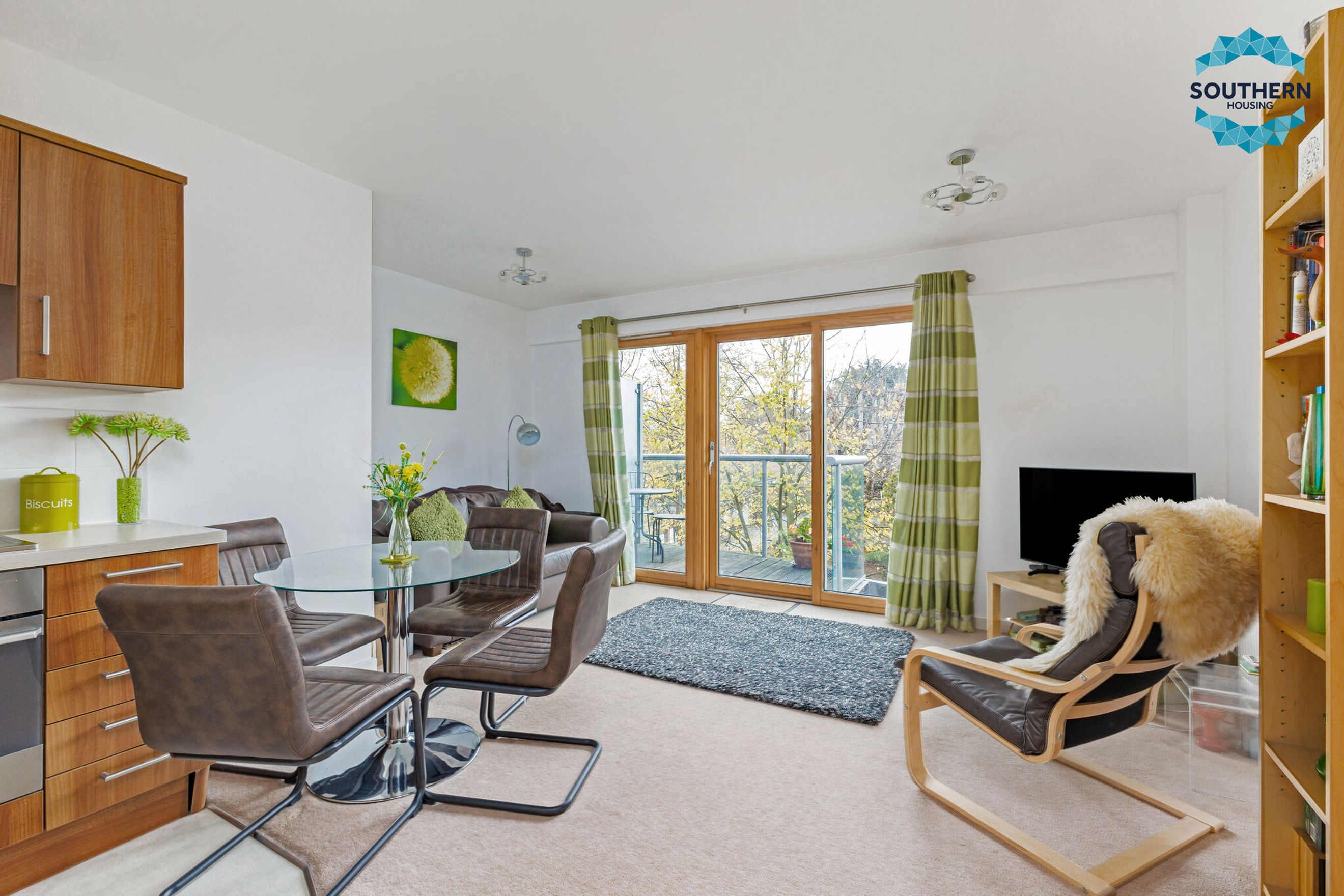 The open-plan kitchen and living area offers a bright and inviting space, ideal for both relaxing and entertaining. Thanks to its private balcony, the living area is filled with natural light, creating a warm and welcoming atmosphere. The layout also allows for a dedicated dining area. The modern kitchen is equipped with an integrated oven, hob, and extractor fan, along with ample storage and counter space for all your culinary needs.