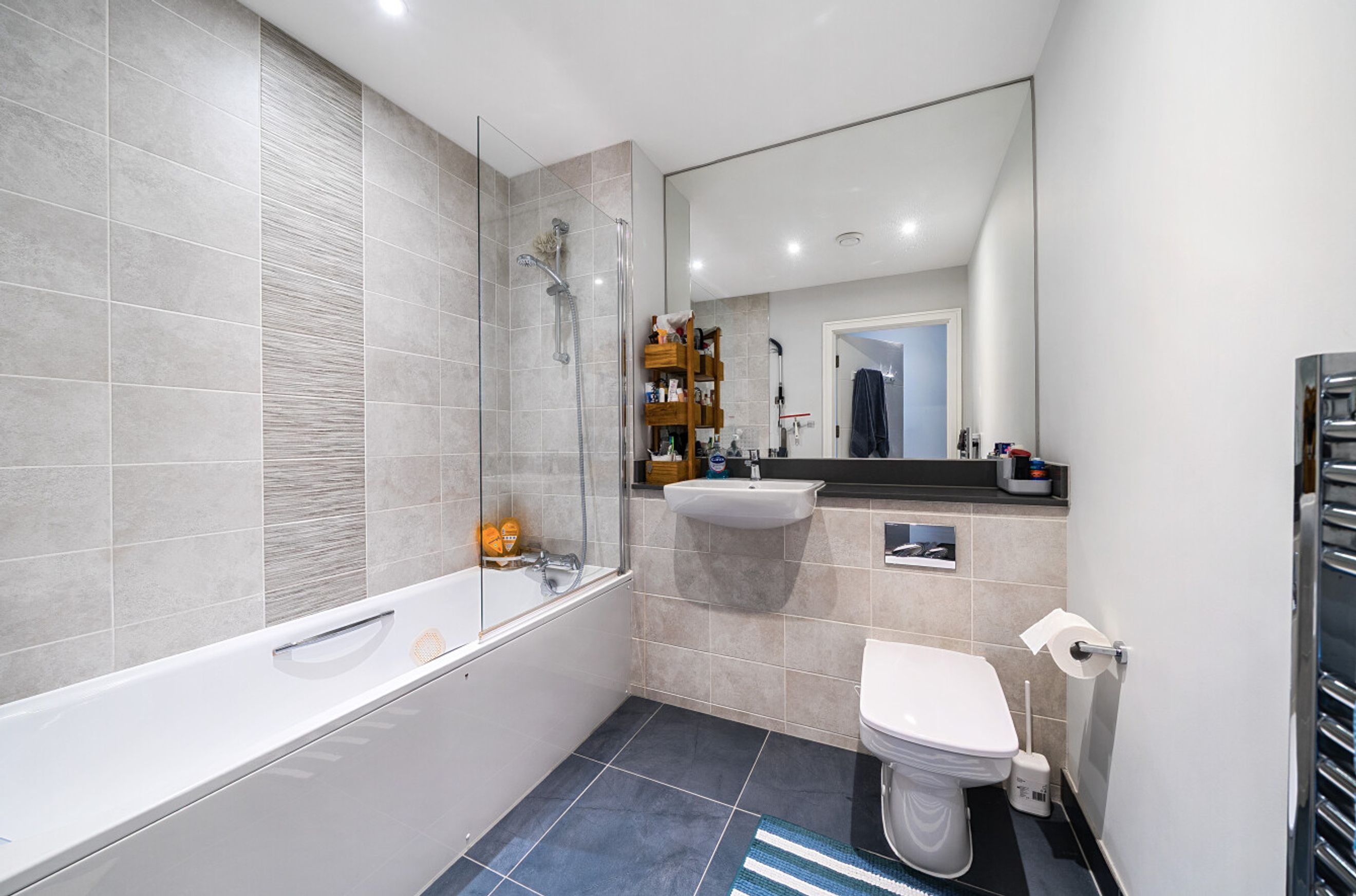 A spacious apartment on the third floor of a recently-constructed development. The property has a twenty-two-foot reception room with semi-open-plan kitchen area featuring sleek units and integrated appliances. A glazed door leads out onto a south-west-facing balcony. There is a good-sized bedroom with fitted, mirror-front wardrobe, a stylish bathroom and a large storage/utility cupboard has been provided in the entrance hallway. The energy-efficiency rating is very good, thanks to modern insulation standards and high performance glazing. Waterfront Heights takes its name from the Paddington Branch of the Grand Union Canal that it borders. The development has a central communal garden which overlooks the canal. Alperton Station, for the Piccadilly Line, is close by. Stonebridge Park (Bakerloo Line, London Overground) and Hanger Lane (Central Line) are also within walking distance or a brief cycle ride and Wembley Central offers additional mainline services.